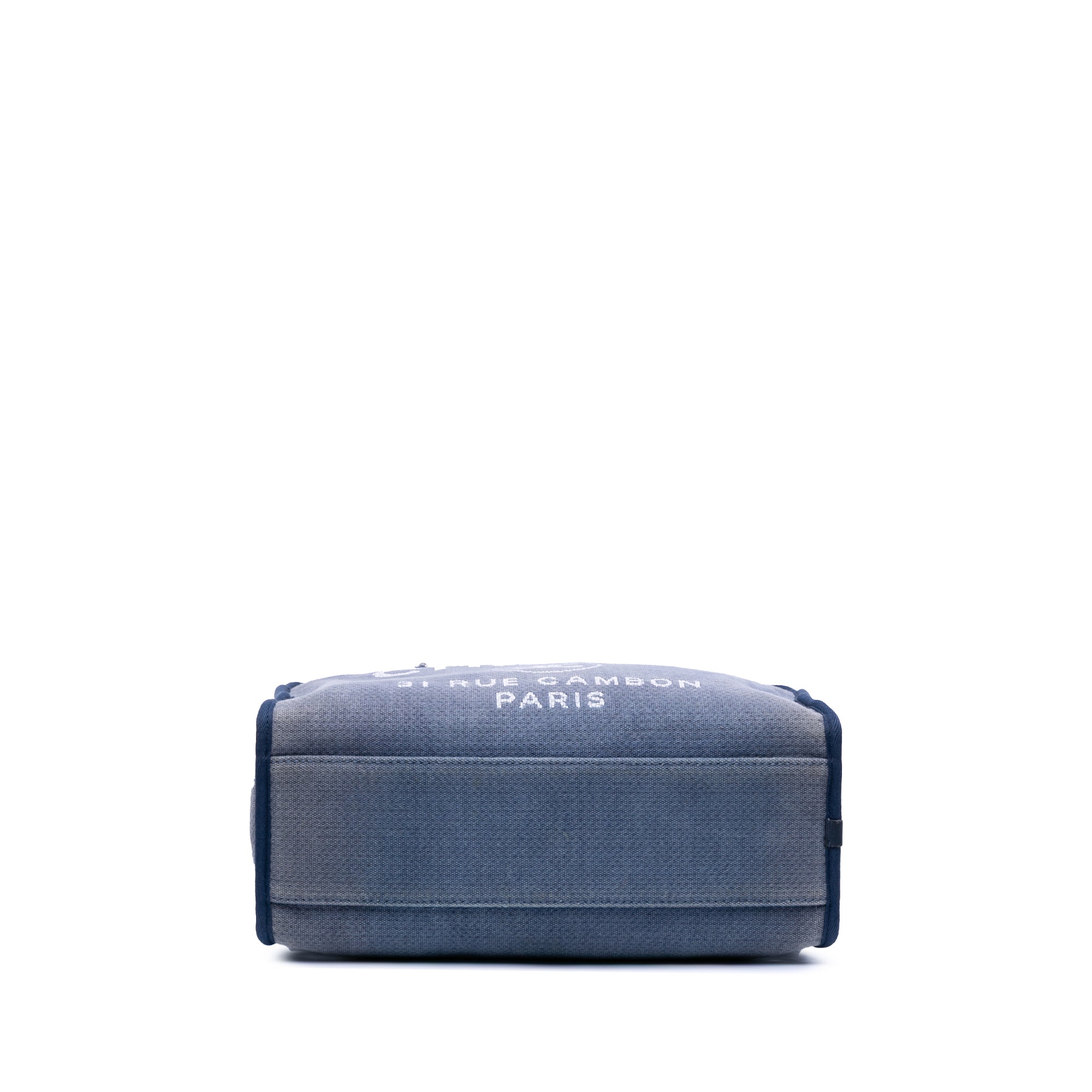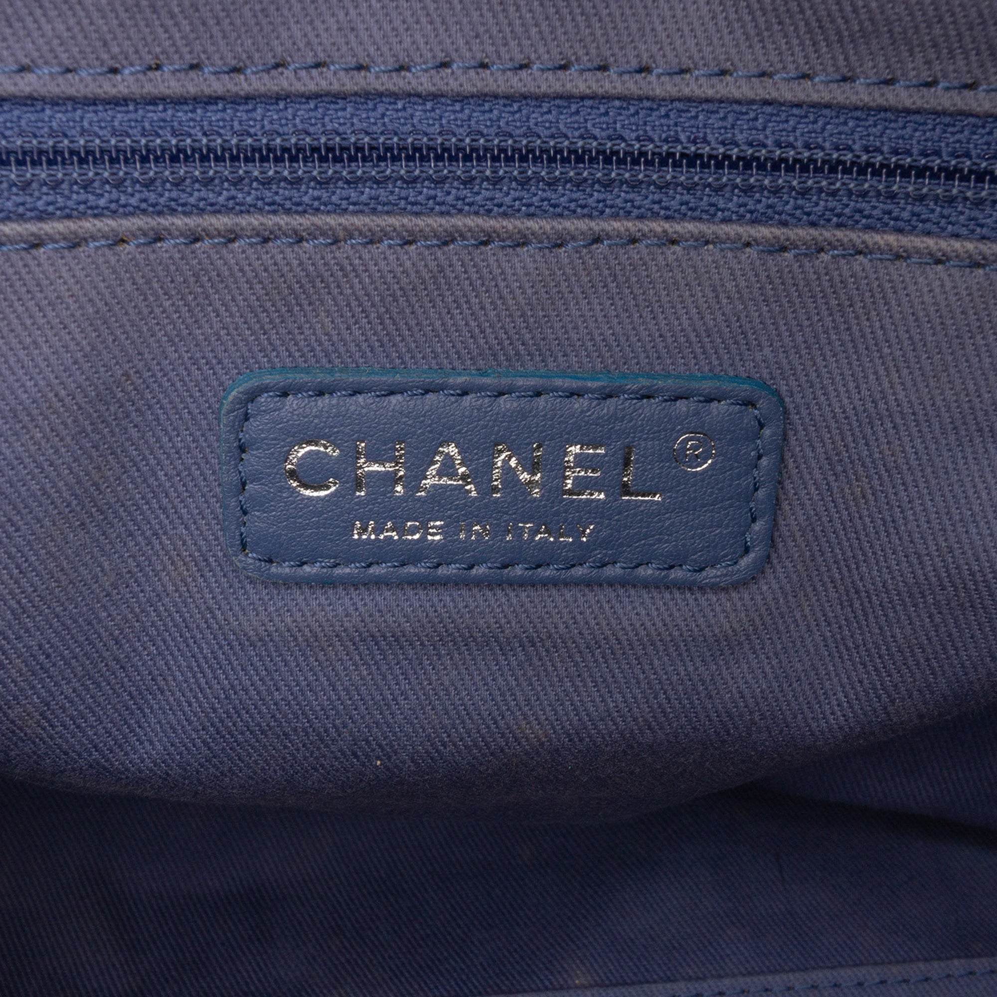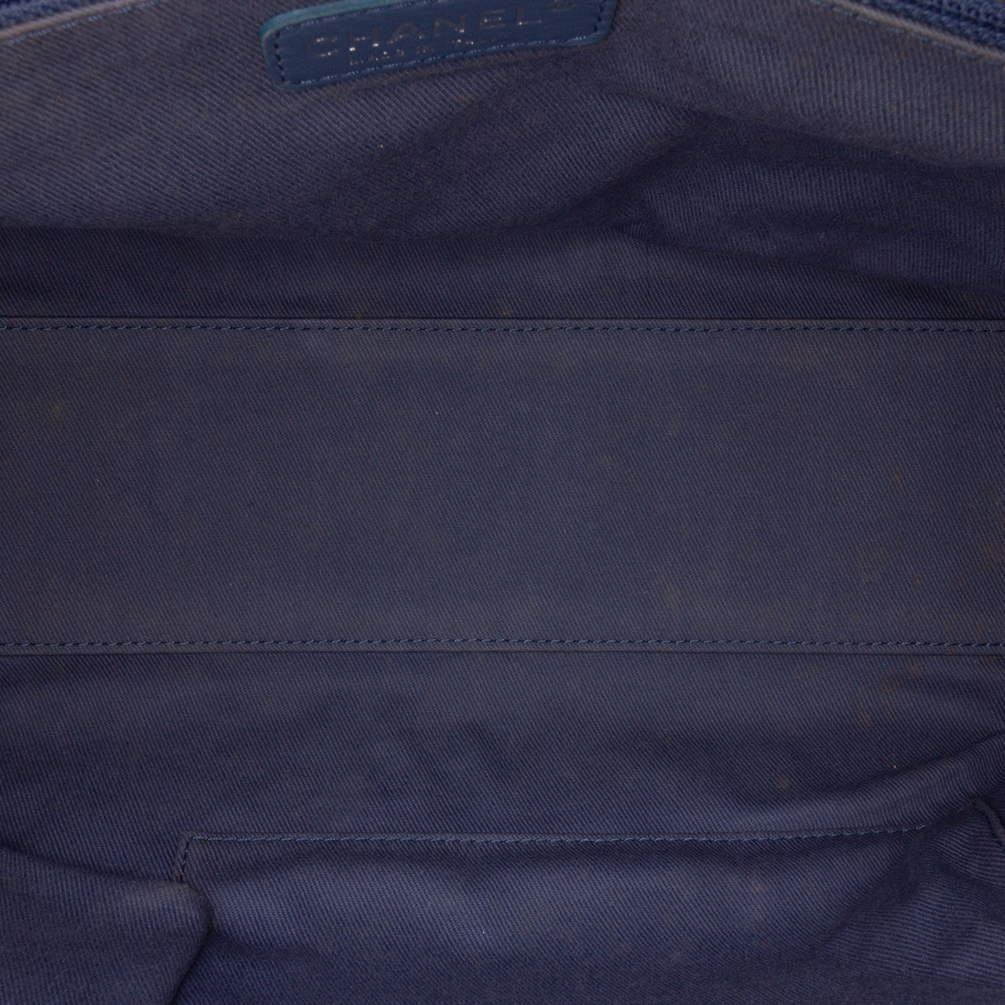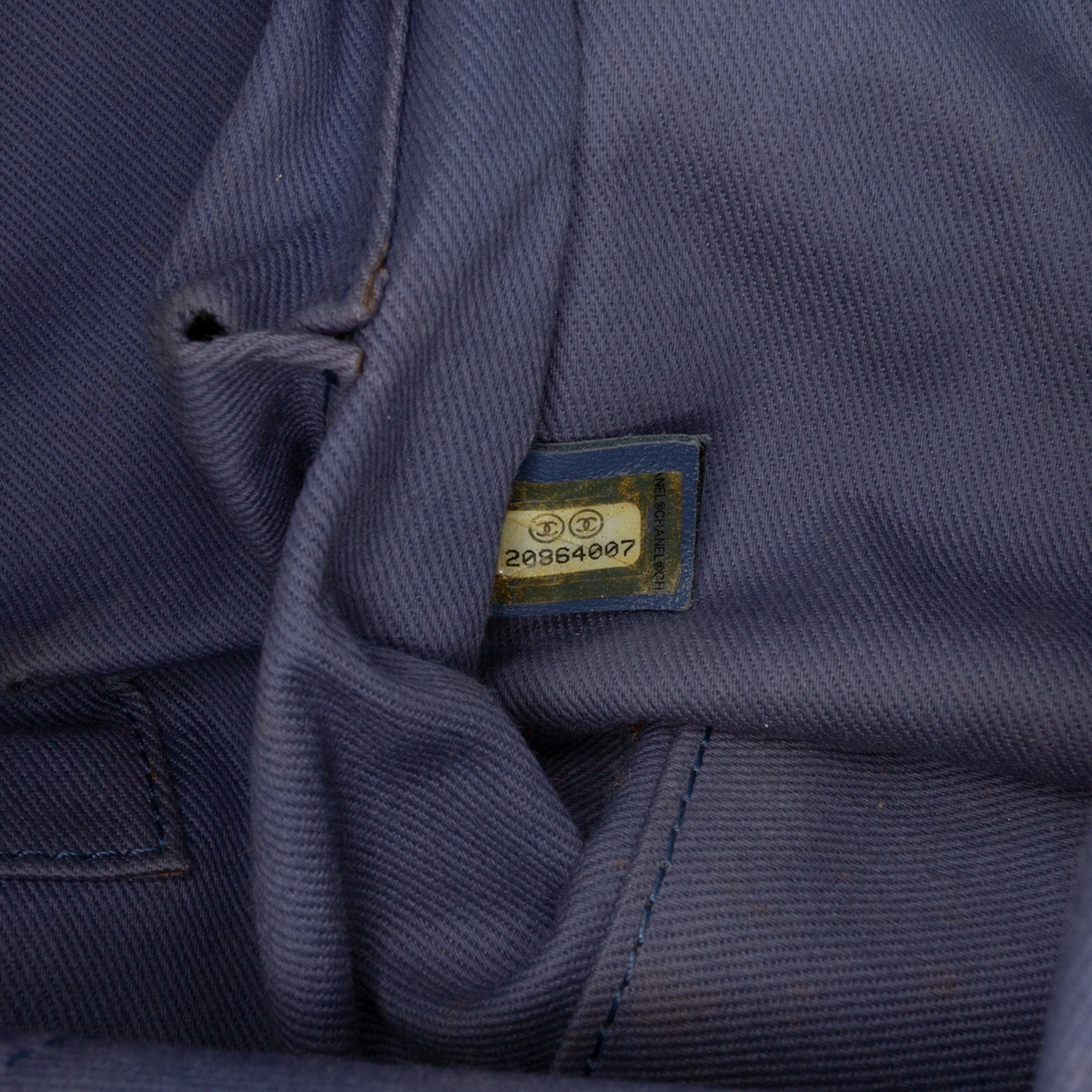 This satchel features a denim body with leather trim, flat leather handles, a leather woven chain strap with leather guard, a top zip closure, and interior zip and slip pockets. Retail Price: 4500.00