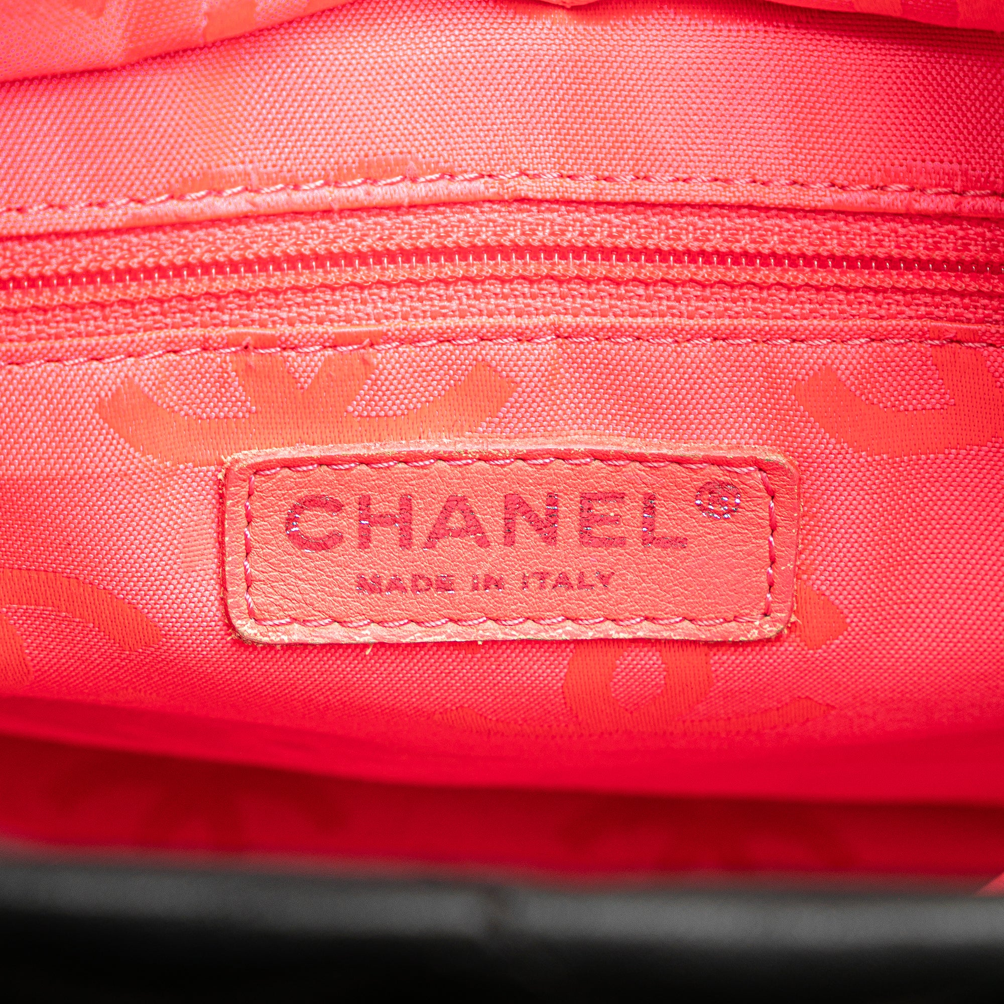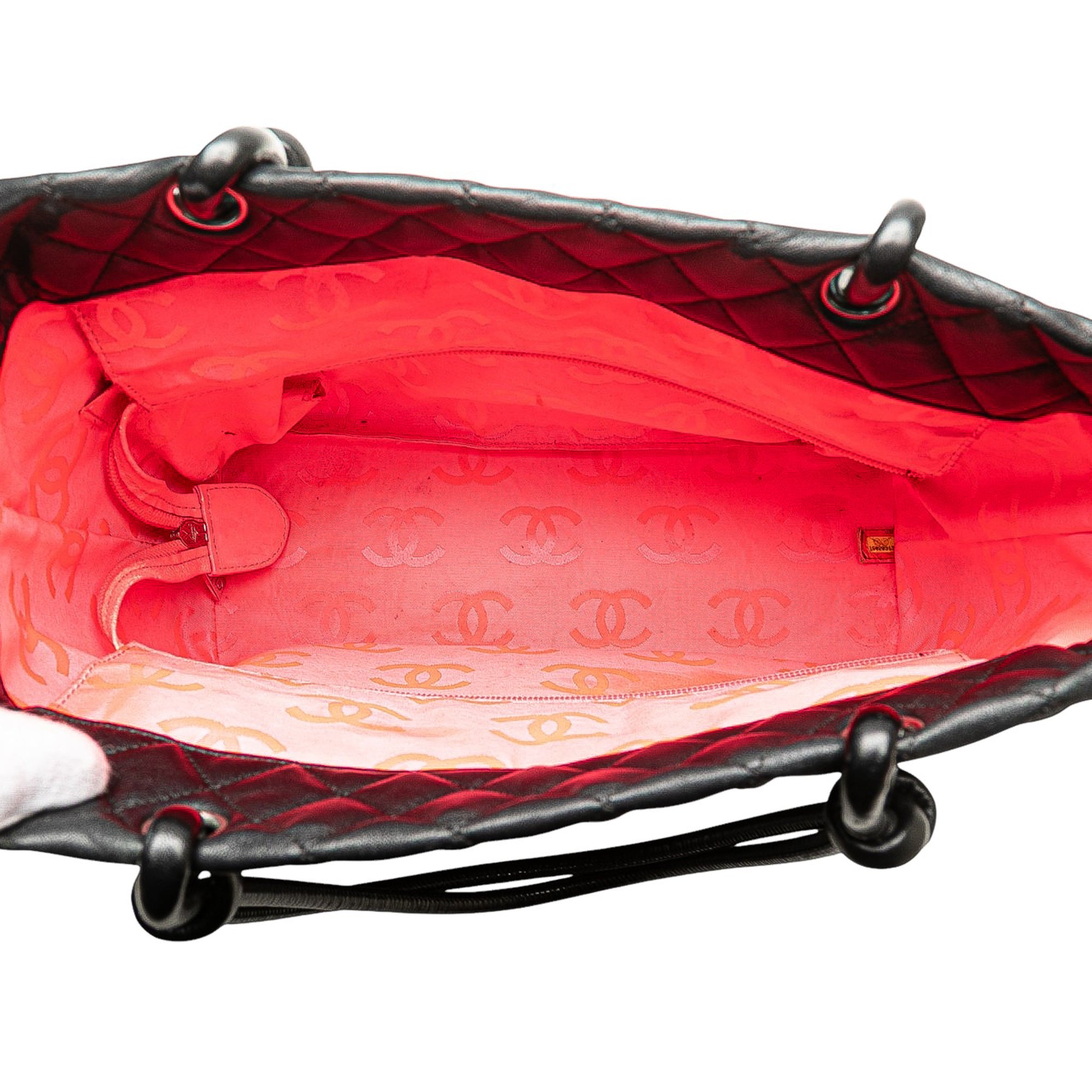 The Cambon Ligne tote bag features a quilted lambskin leather body with interlocking Cs, an exterior back slip pocket, rolled leather handles, and a top zip closure. Retail Price: 2328.00