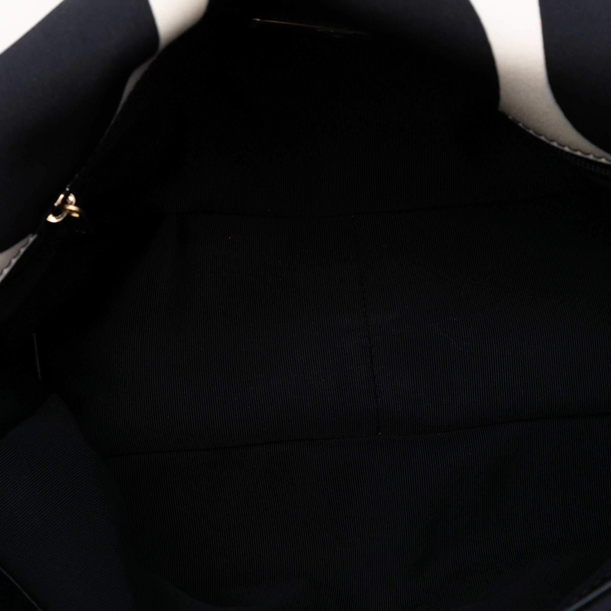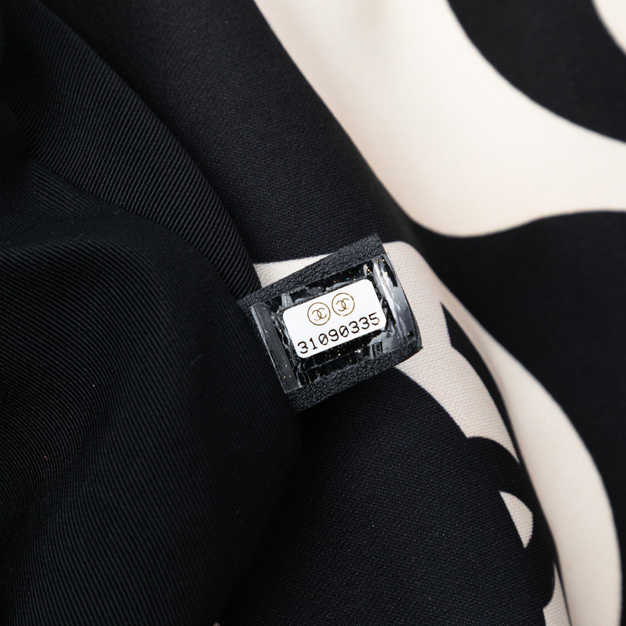 The Large 19 Flap bag features a quilted and printed silk body, a gold-tone chain handle, a woven leather chain shoulder strap, a flap with a CC twist lock closure, an exterior slip pocket, and an interior zip pocket. Inclusion: Dust bag. Retail Price: 6100.00