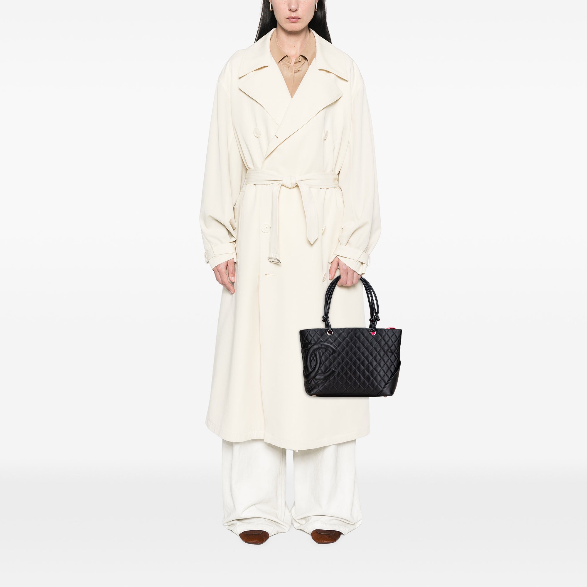 The Cambon Ligne tote features a quilted leather body, rolled leather handles with knot detail, a top zip closure, an exterior back slip compartment, and interior zip and slip pockets. Inclusion: Dust bag, authenticity card. Retail Price: 2450.00