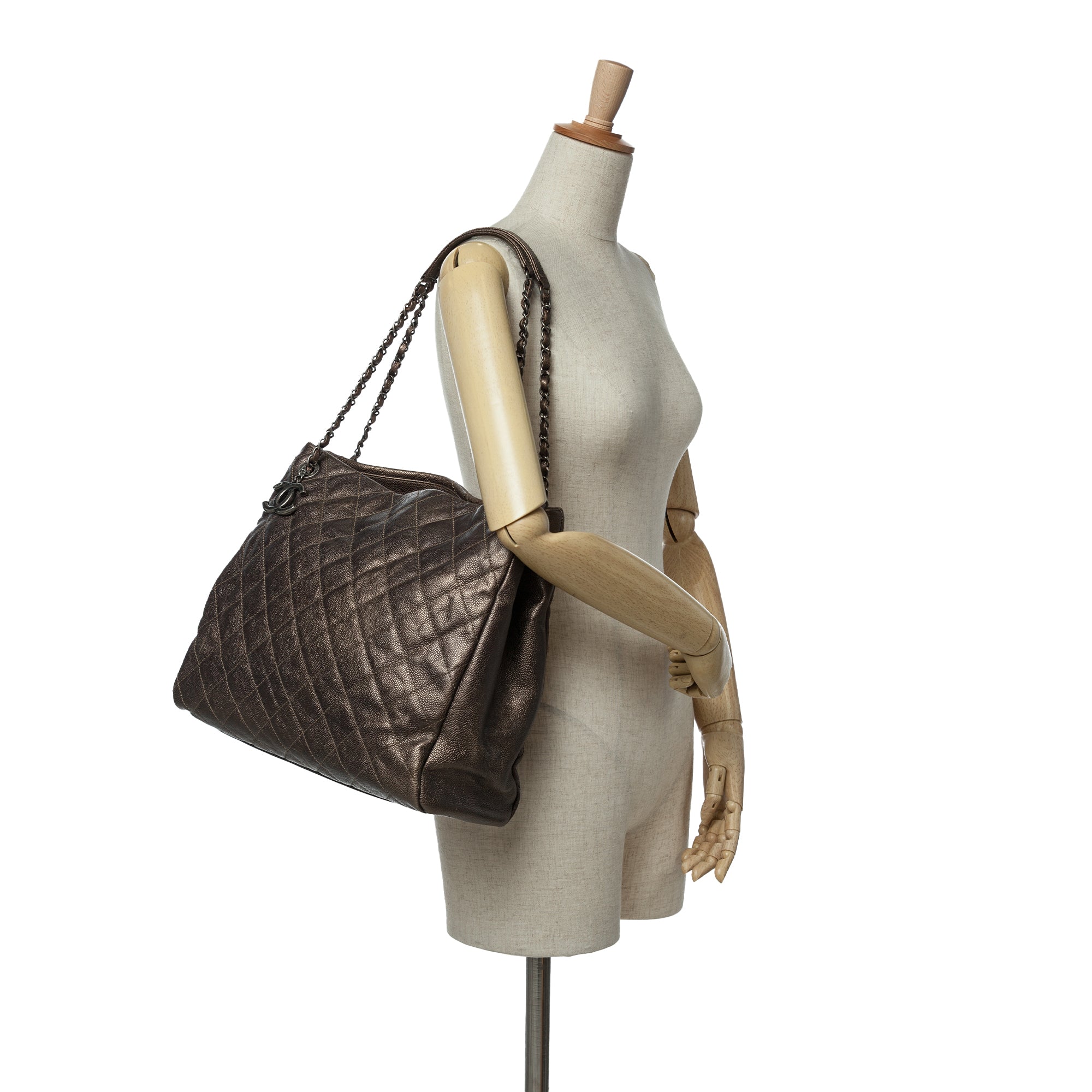 This tote bag features a quilted caviar leather body, leather woven chain link shoulder straps with flat leather shoulder guards, an open top, a top zip compartment, and interior zip and slip pockets. Retail Price: 5000.00