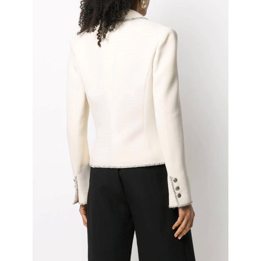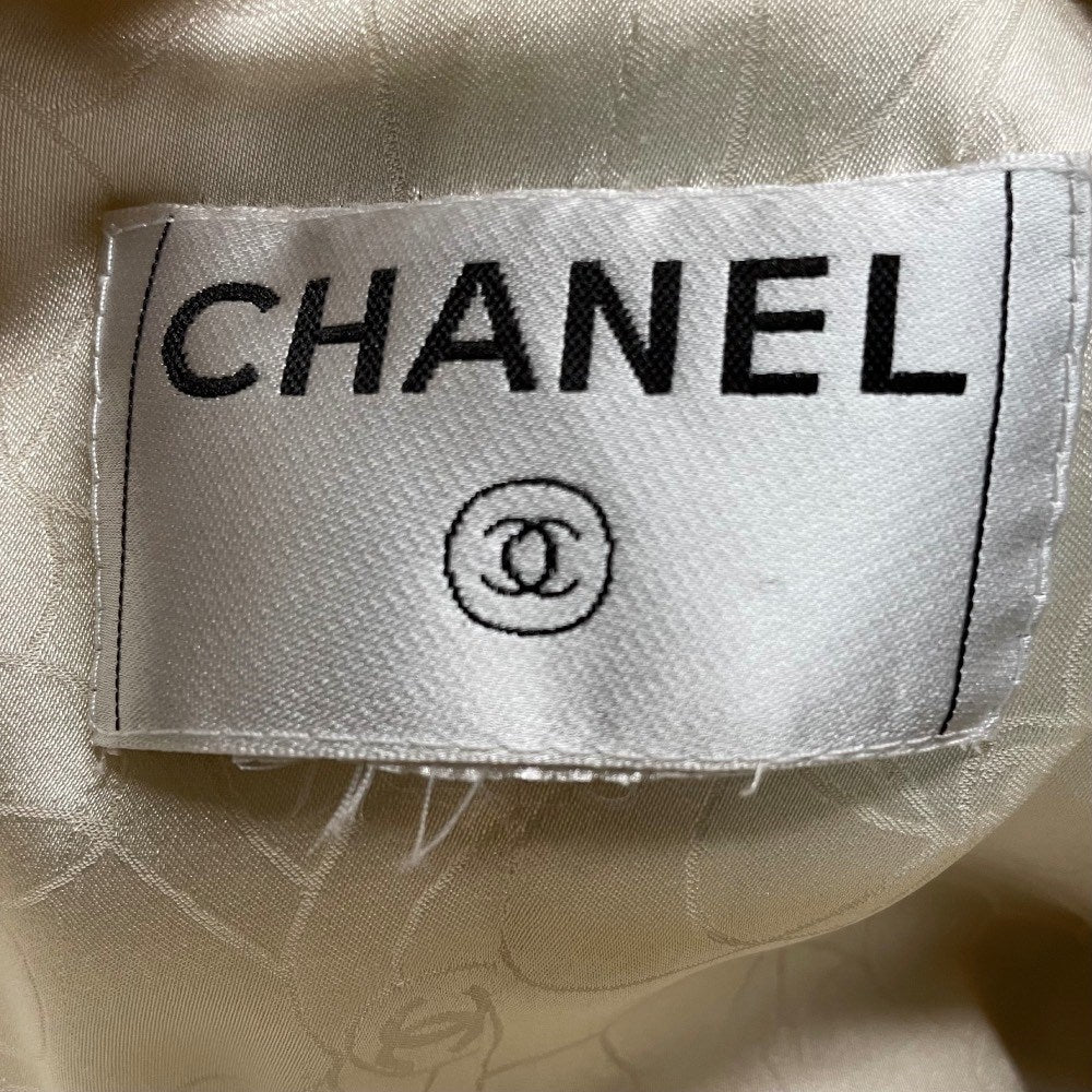Chanel Limited Edition ivory silk double-breasted jacket with beige and grey bouclé wool edges. Classic lapel collar, silver-tone metal logoed buttons fastening and buttoned cuffs. Two patch pockets and a chest pocket with emboidered logoed coat of arms.