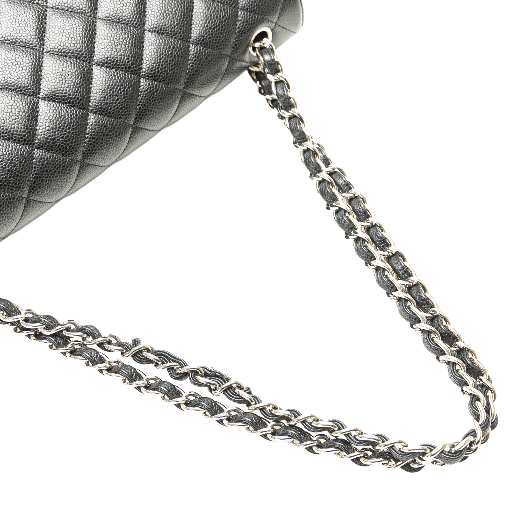The Classic Maxi features a quilted caviar leather body, leather woven chain straps, double front flaps with interlocking Cs and a twist lock closure, an exterior back slip pocket, and interior slip pockets. Inclusion: authenticity card. Retail Price: 12300.00