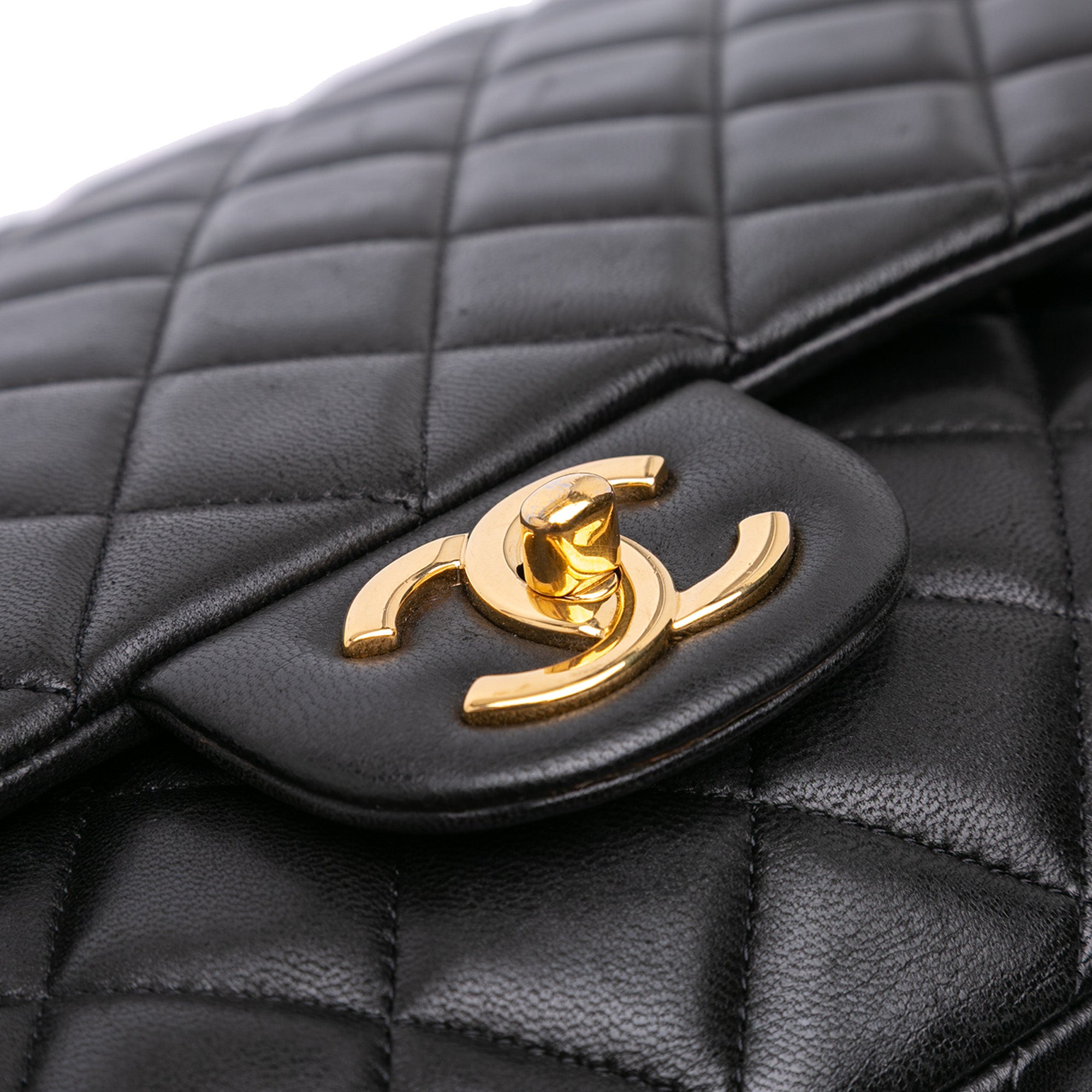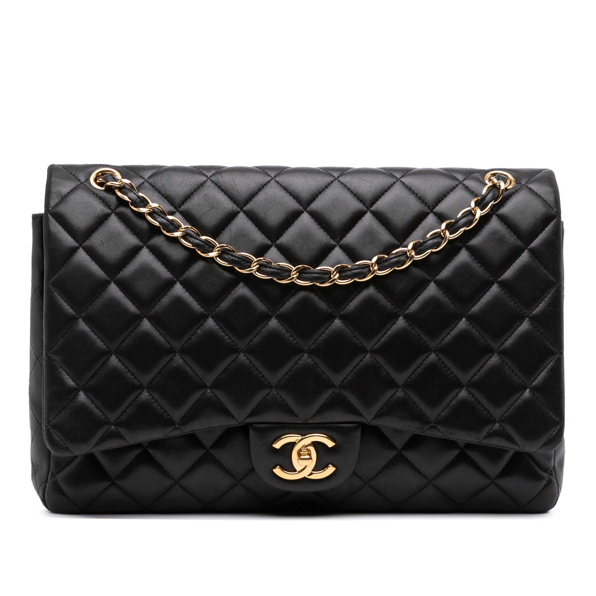 This shoulder bag features a quilted lambskin leather body, leather woven chain straps, double front flaps with interlocking Cs and a twist lock closure, an exterior back slip pocket, and interior zip and slip pockets. Retail Price: 13400.00