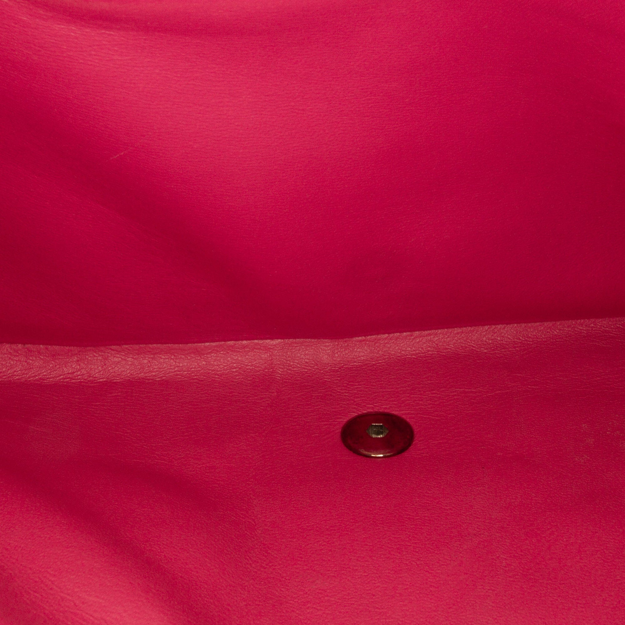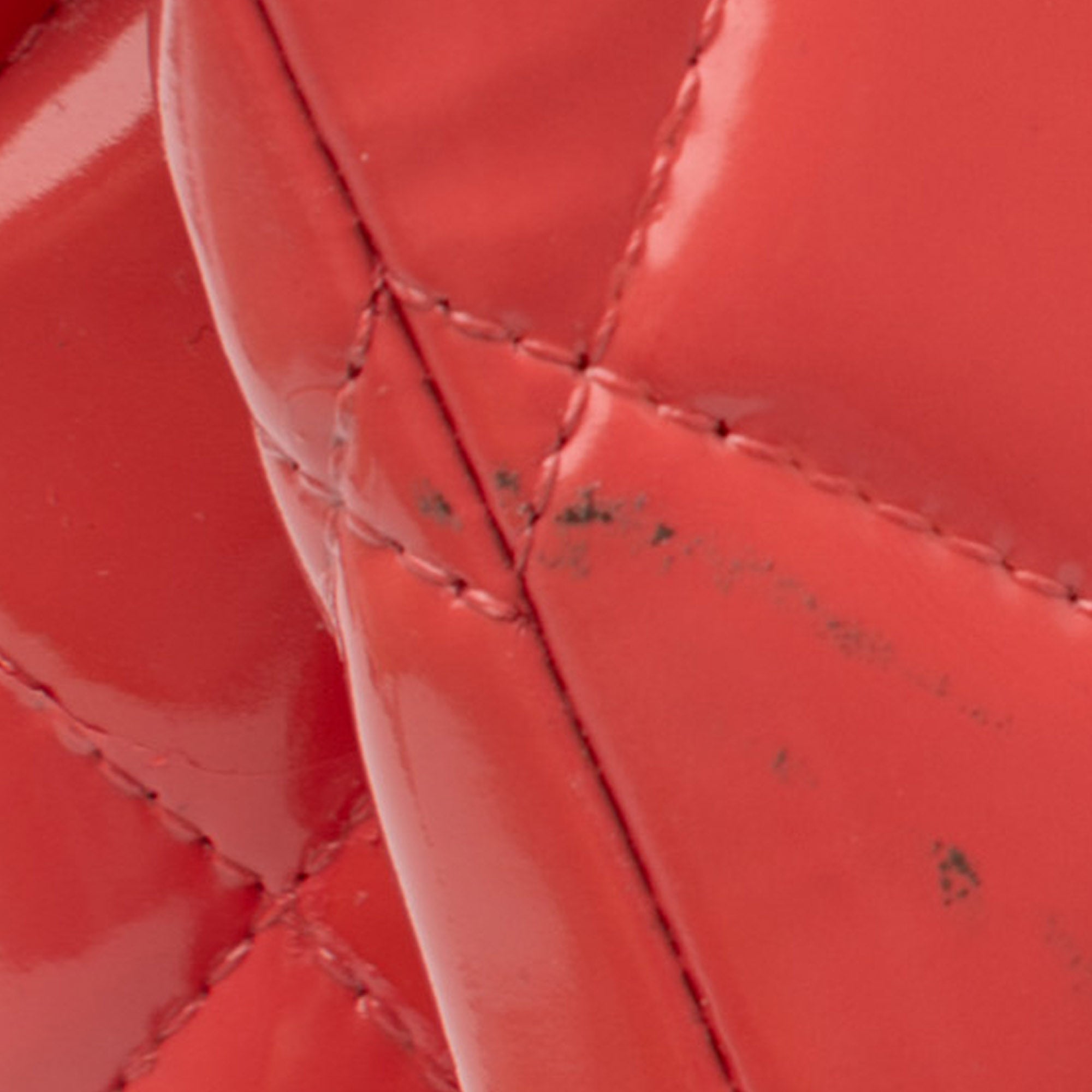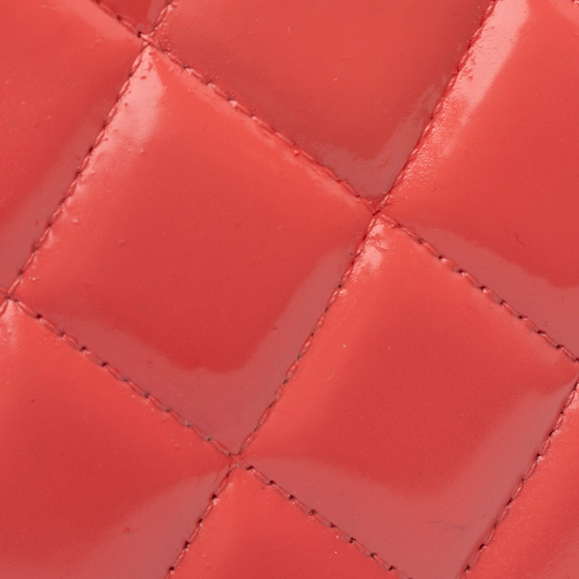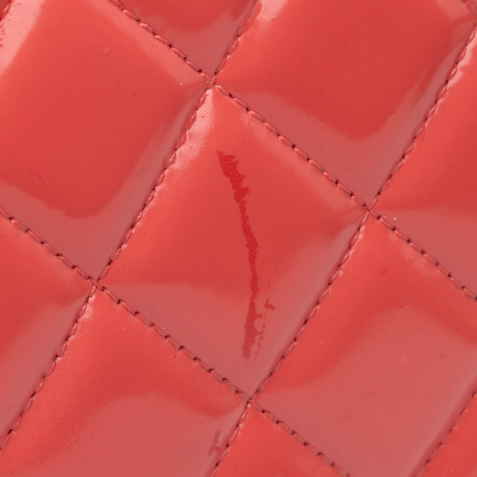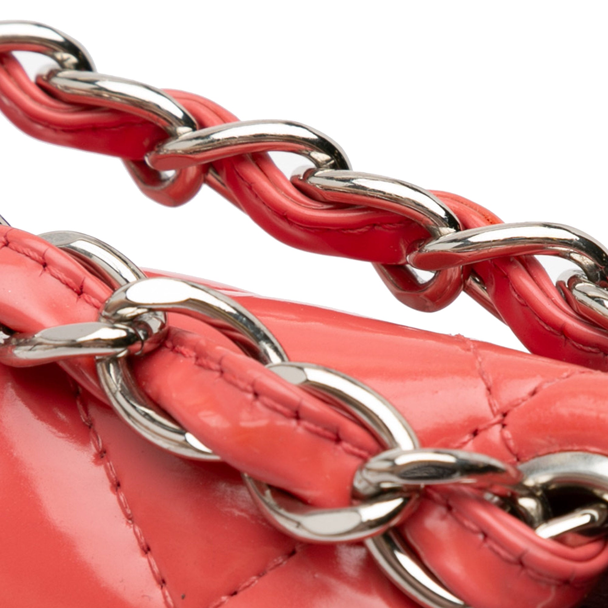 This shoulder bag features a quilted patent leather body, leather-woven chain straps, double front flaps with interlocking CC twist lock closure, an exterior back slip pocket, and interior zip and slip pockets. Inclusion: authenticity card. Retail Price: 11500.00