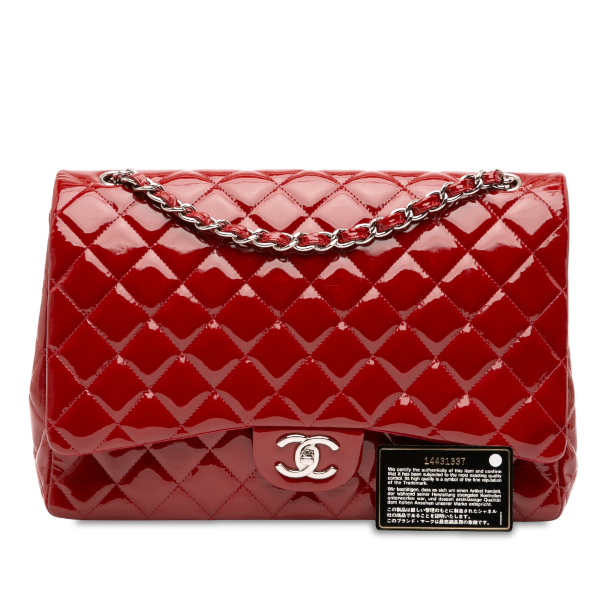 This shoulder bag features a quilted patent leather body, leather-woven chain straps, double front flaps with interlocking CC twist lock closure, an exterior back slip pocket, and interior zip and slip pockets. Inclusion: authenticity card. Retail Price: 6700.00