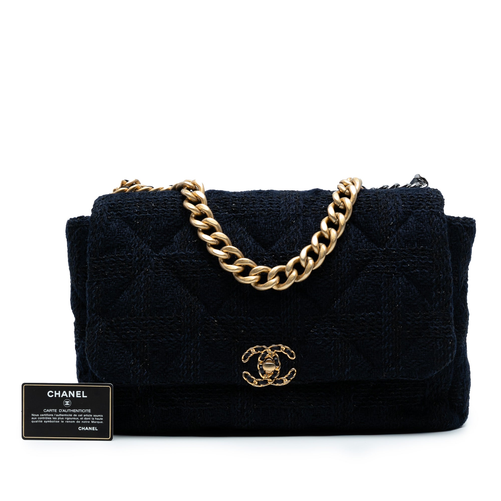 The 19 Flap Bag features a tweed body, a gold-tone chain link handle, a leather woven chain shoulder strap with leather guard, a front flap with a chain CC logo turn lock closure, and an interior zip pocket. Inclusion: authenticity card. Retail Price: 6720.00
