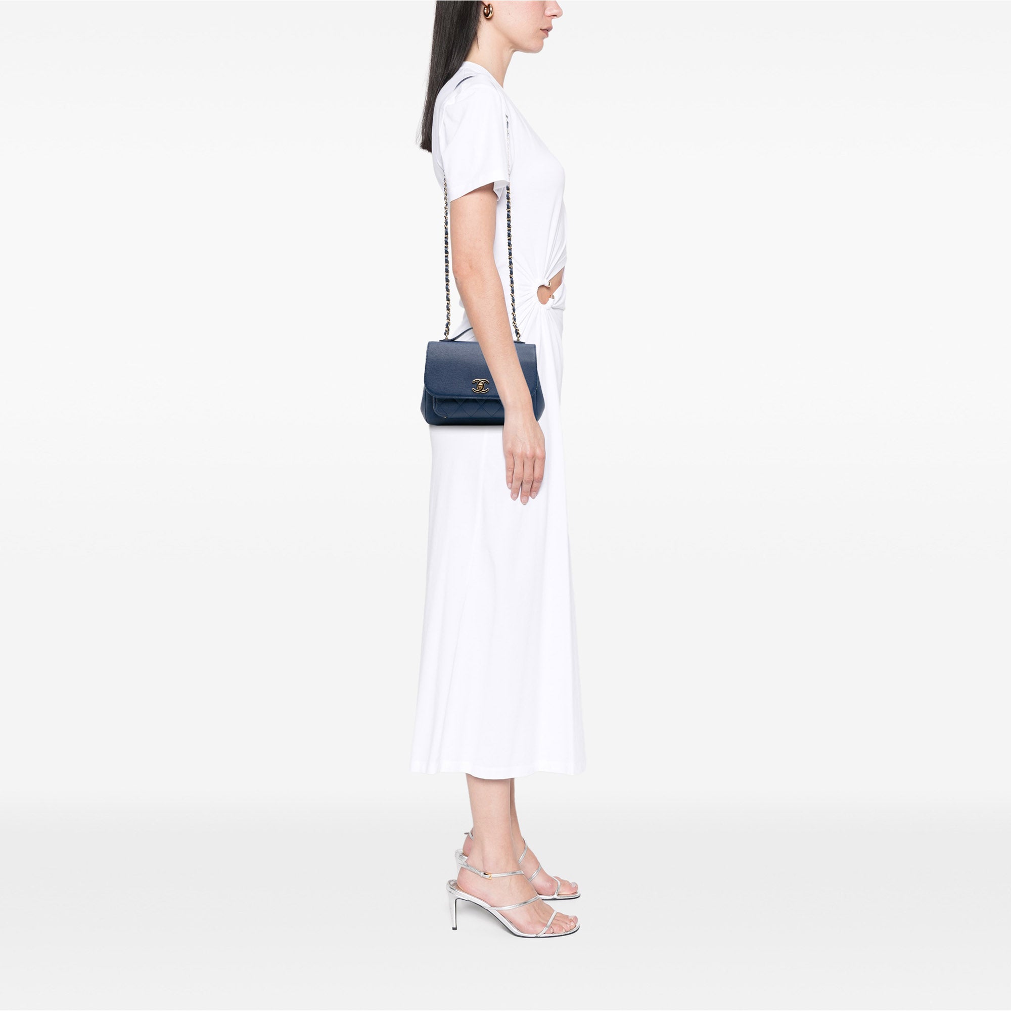 The Business Affinity flap bag features a caviar leather body, a flat leather top handle, a leather-woven chain strap with leather shoulder guard, a front flap with CC turn lock closure, an exterior front zip pocket, an exterior back slip pocket, interior zip and slip pockets. Inclusion: Dust bag. Retail Price: 3500.00