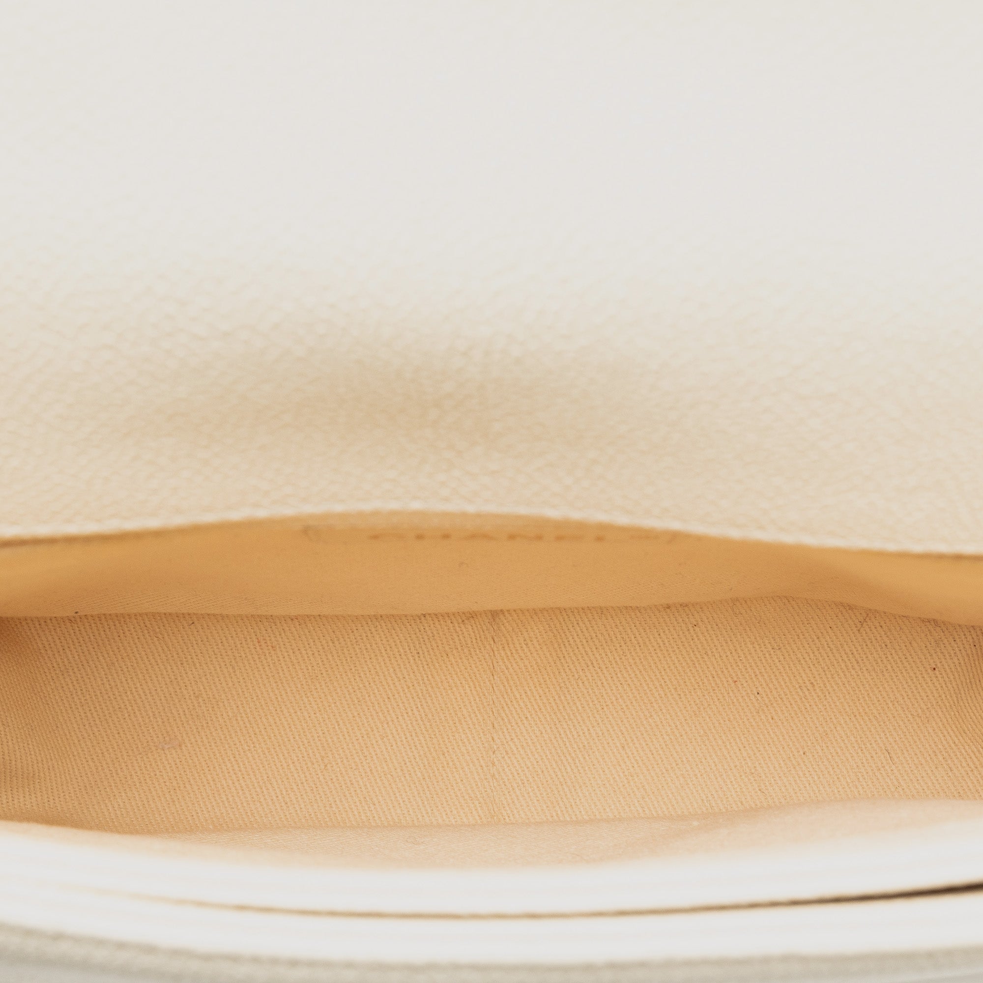 This satchel features a quilted caviar leather body, a flat leather top handle, a curb chain strap, a front flap with a CC push lock closure, an exterior back slip pocket, and interior zip and slip pockets. Retail Price: 4900.00