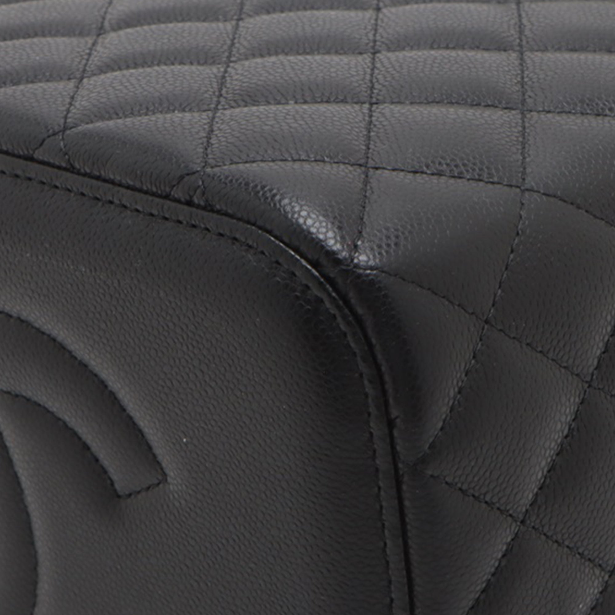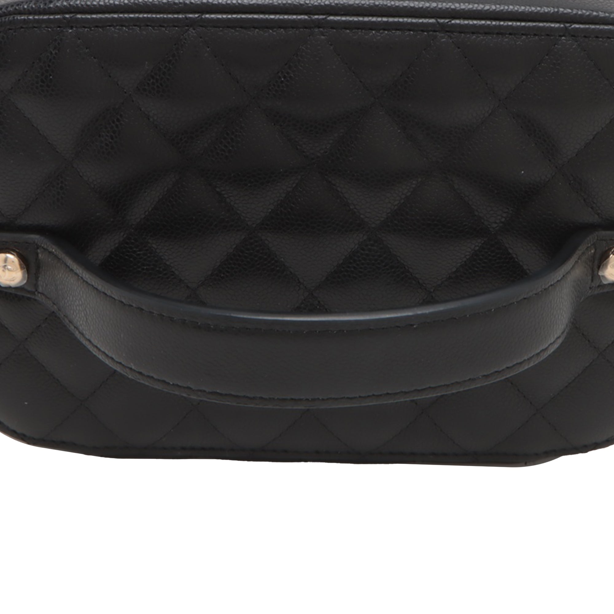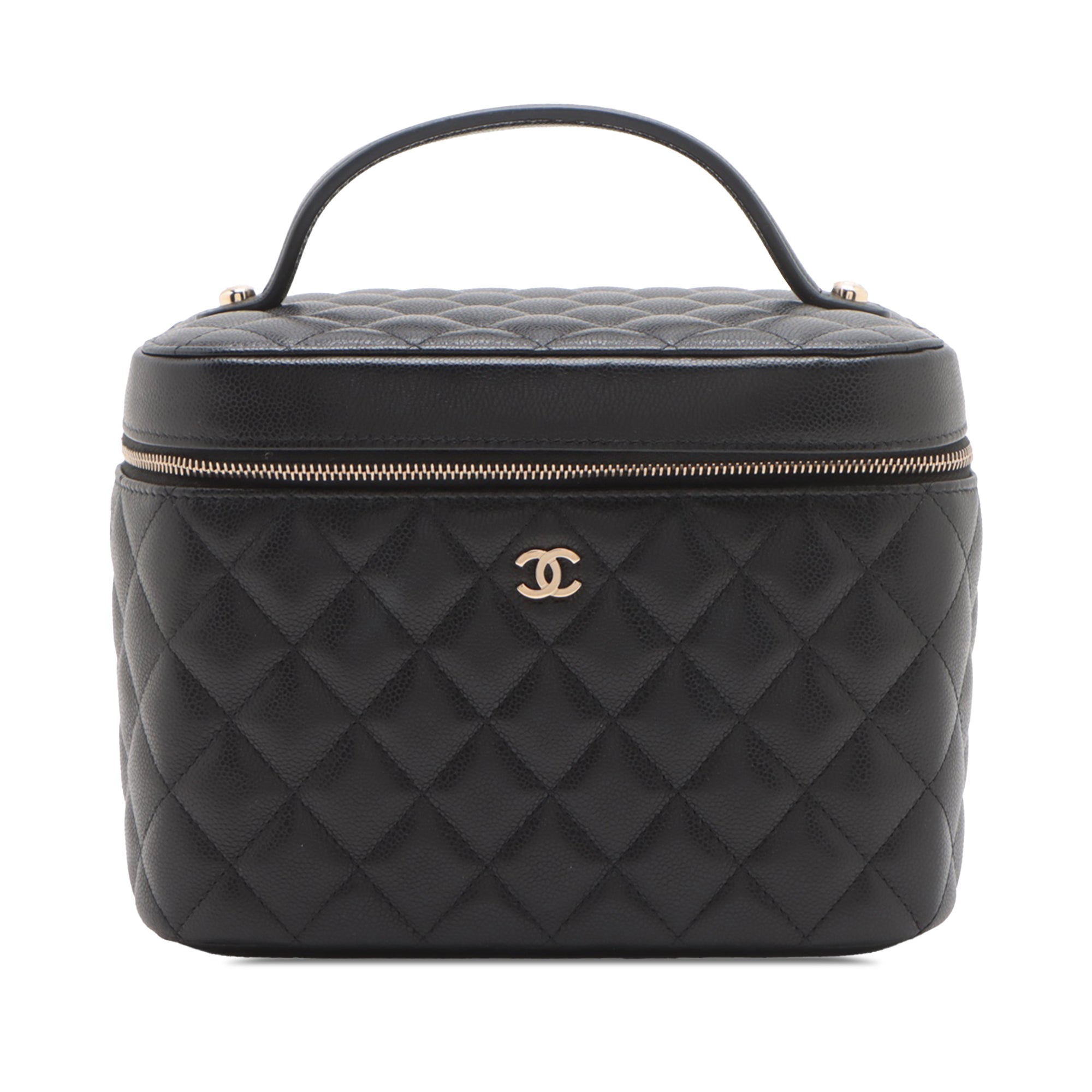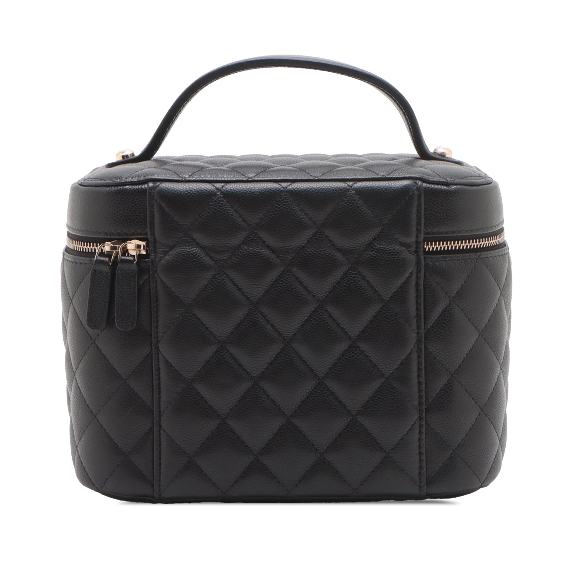 This vanity bag features a quilted caviar body, a flat leather top handle, a zip-around closure, and interior slip pockets. Retail Price: 4600.00
