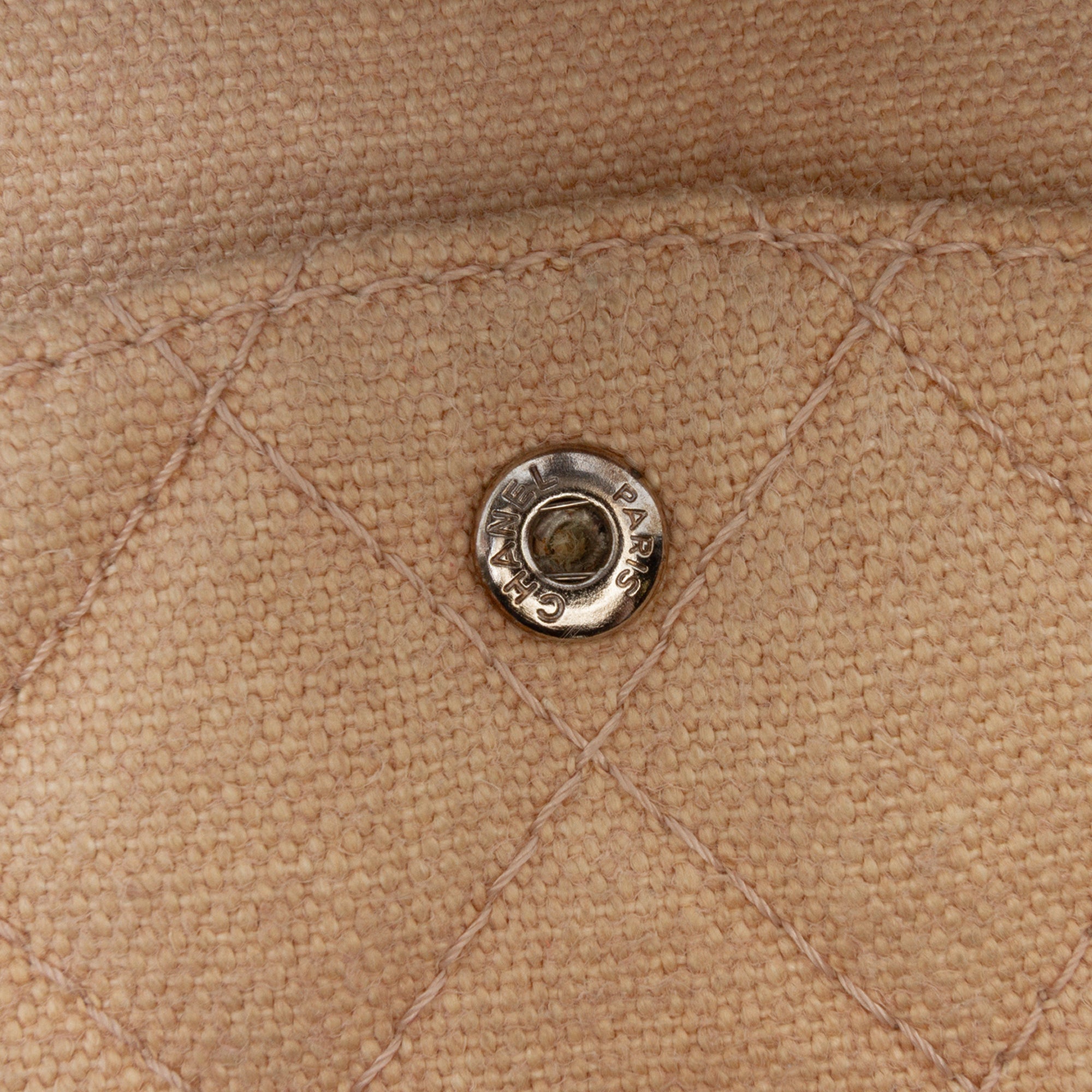This shoulder bag features a quilted canvas body with leather trim, leather woven chain link straps, double front flaps with interlocking Cs and a twist lock closure, an exterior back slip pocket, and interior zip and slip pockets. Retail Price: 4080.00