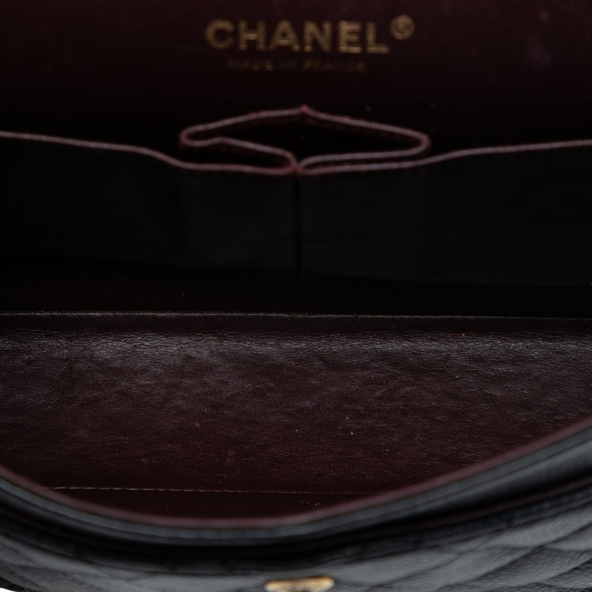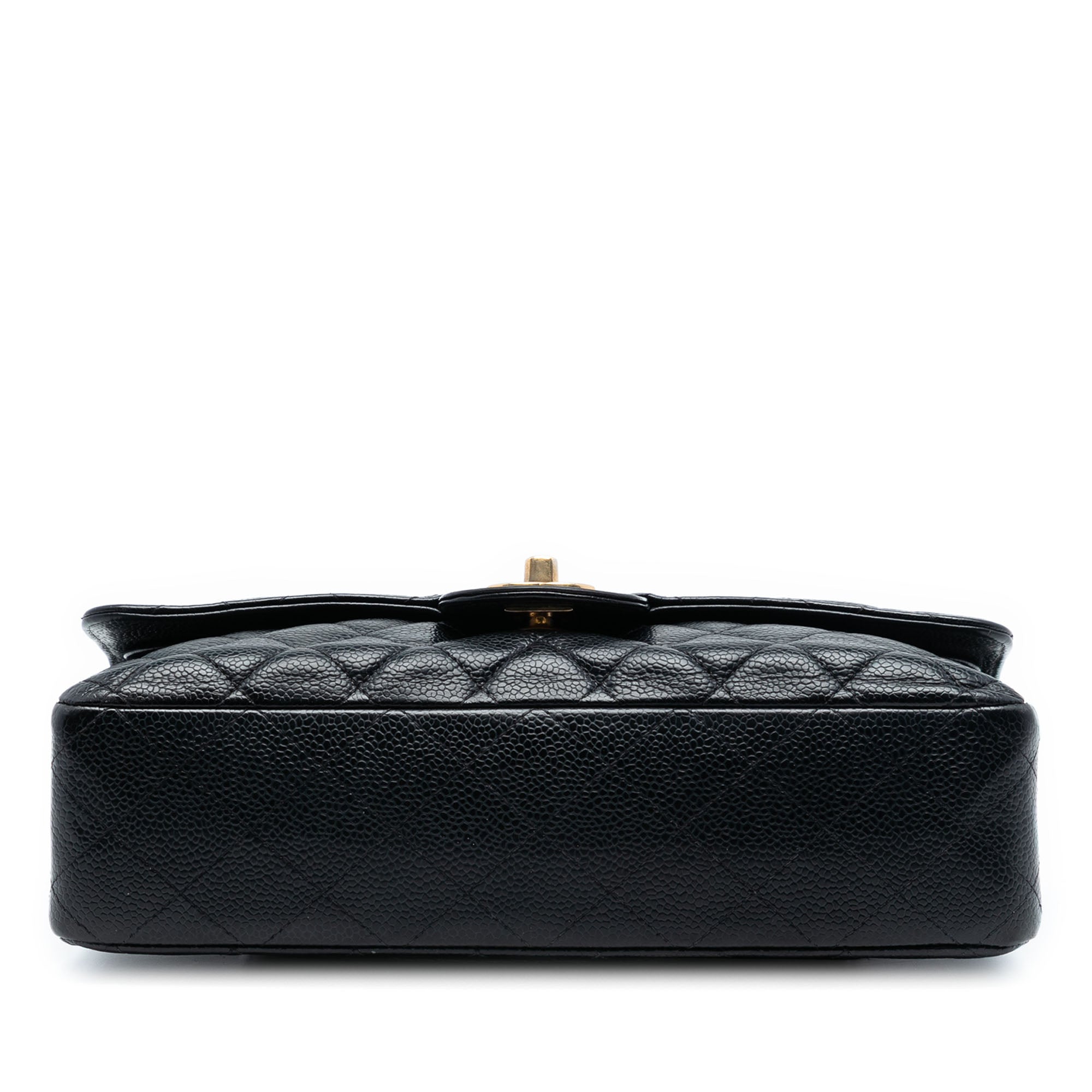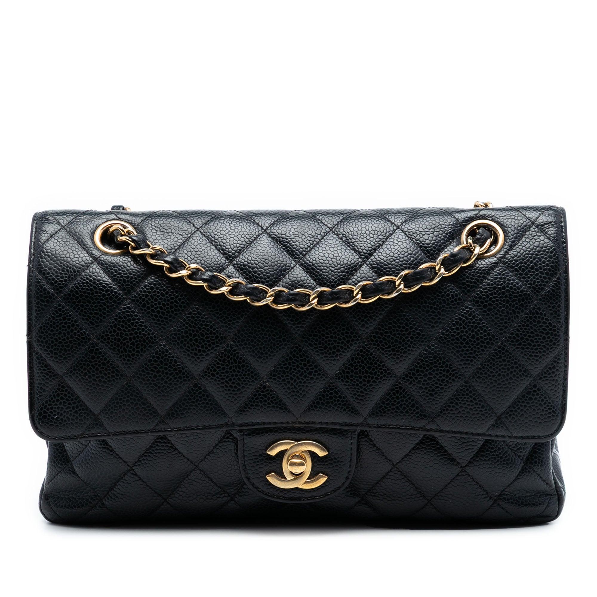 The Classic Flap bag features a quilted caviar leather body, exterior front and back slip pockets, a leather woven chain strap, a double top flap with CC turn lock closure, and interior zip and slip pockets. Retail Price: 10500.00