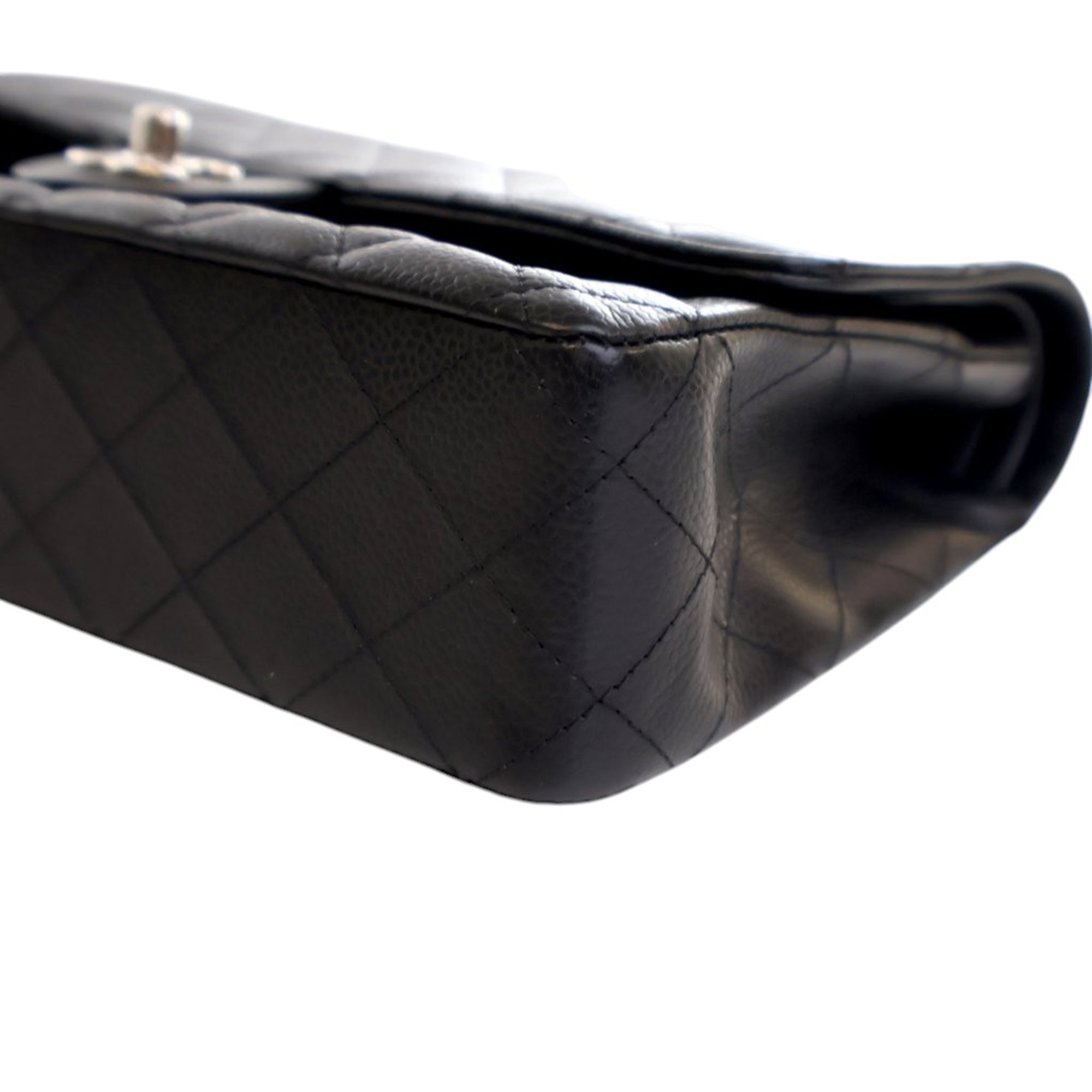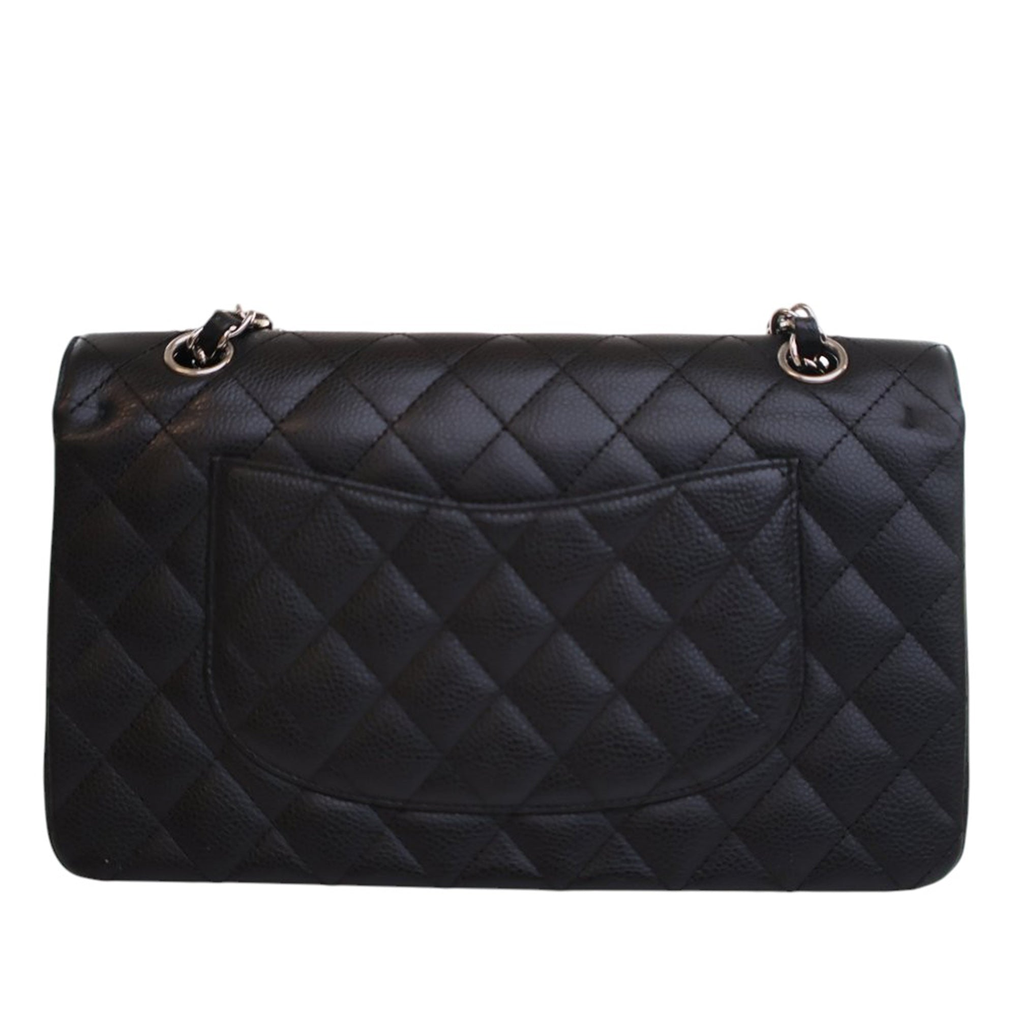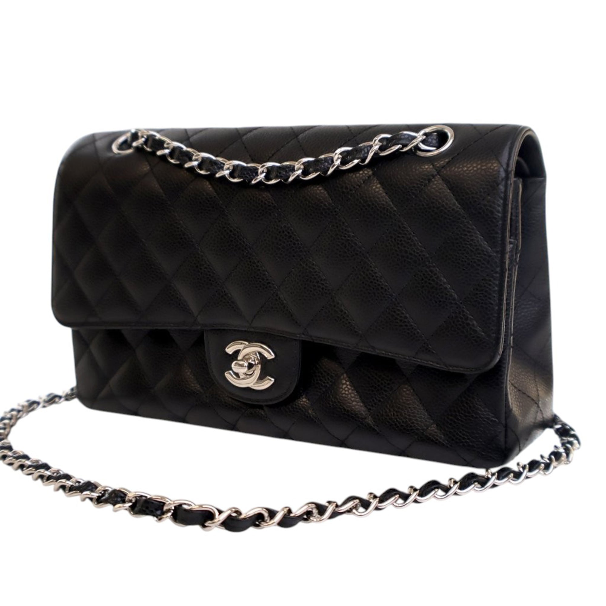 This shoulder bag features a quilted caviar leather body, an exterior back slip pocket, leather woven chain straps, double front flaps with interlocking Cs and a twist lock closure, and interior zip and slip pockets. Inclusion: Dust bag, authenticity card. Retail Price: 10200.00