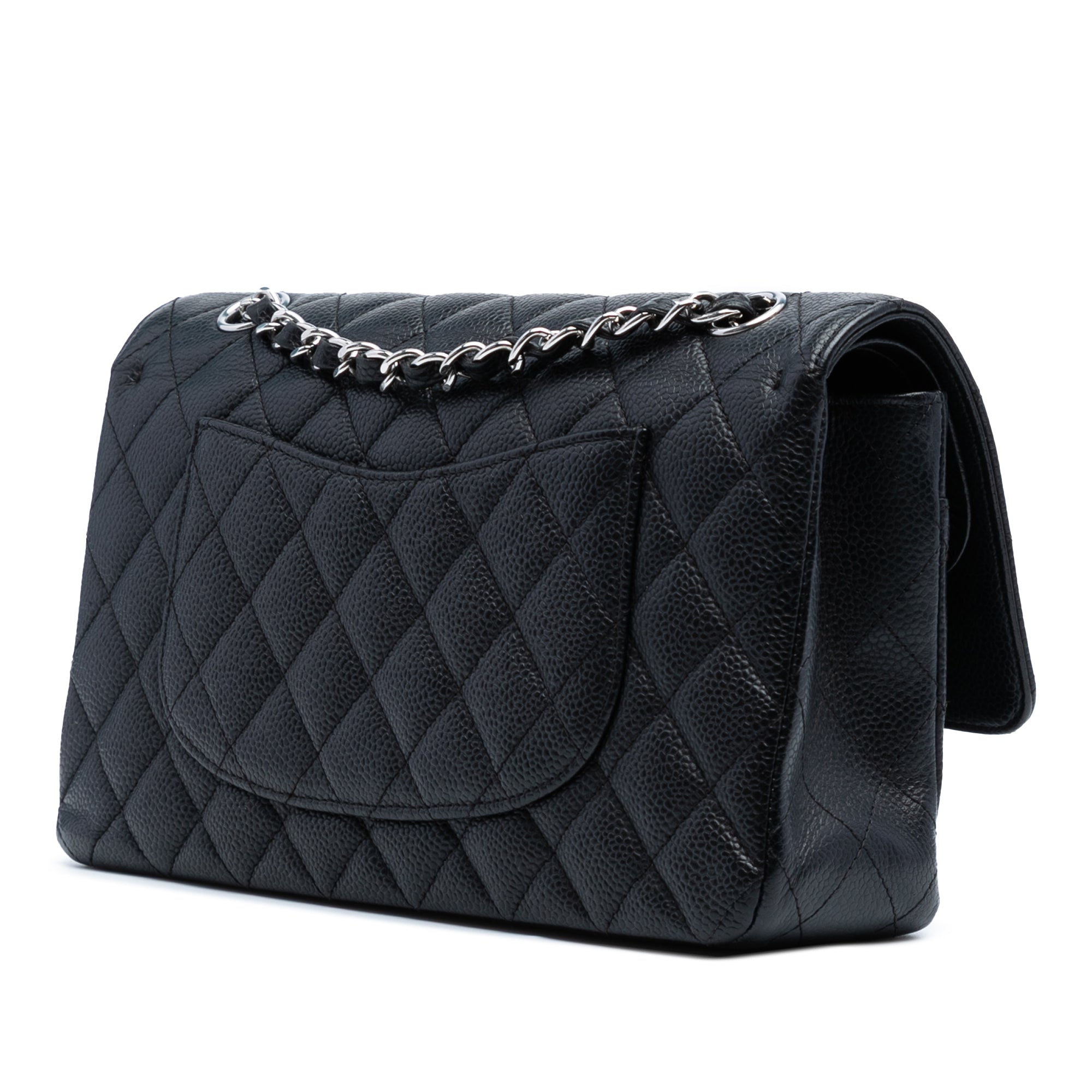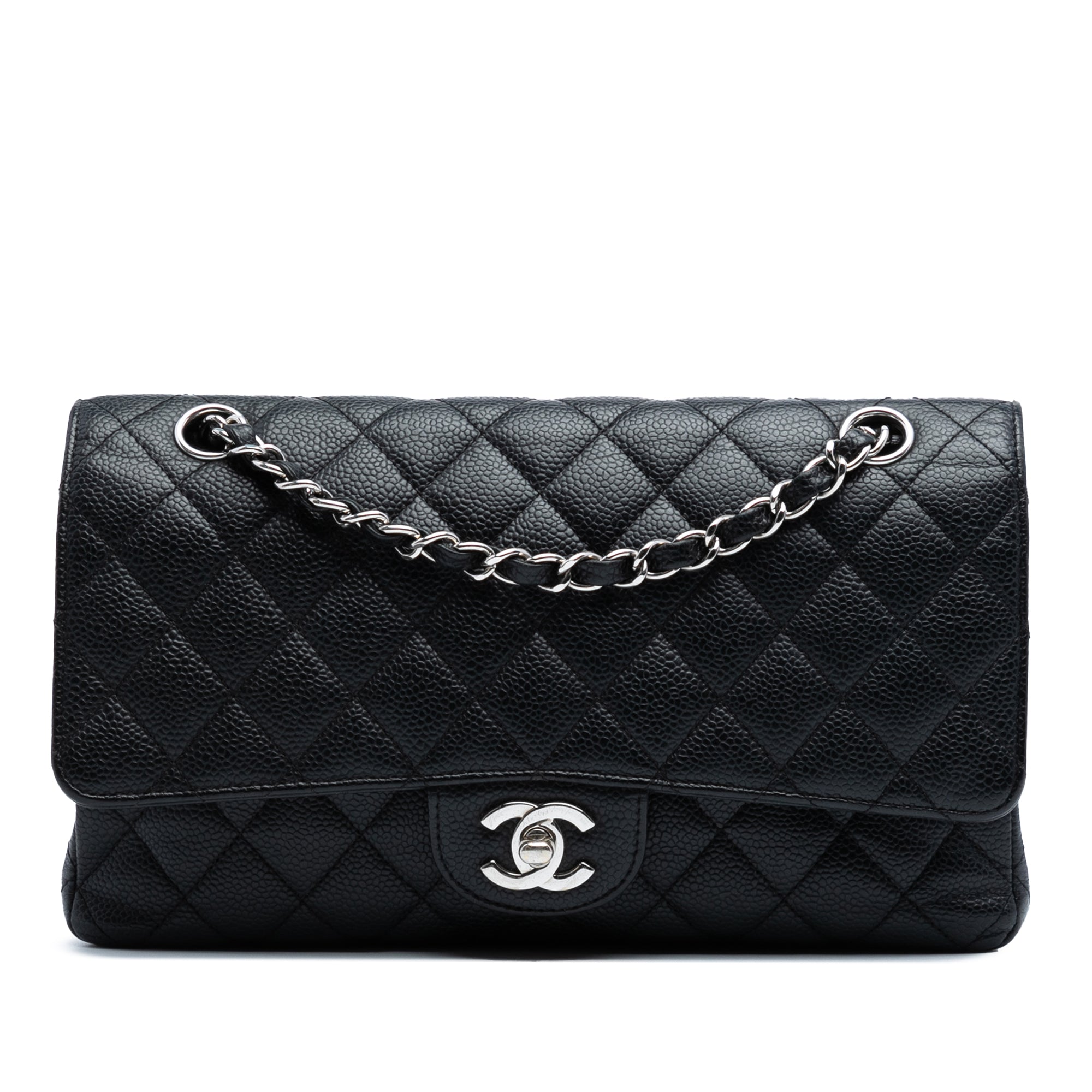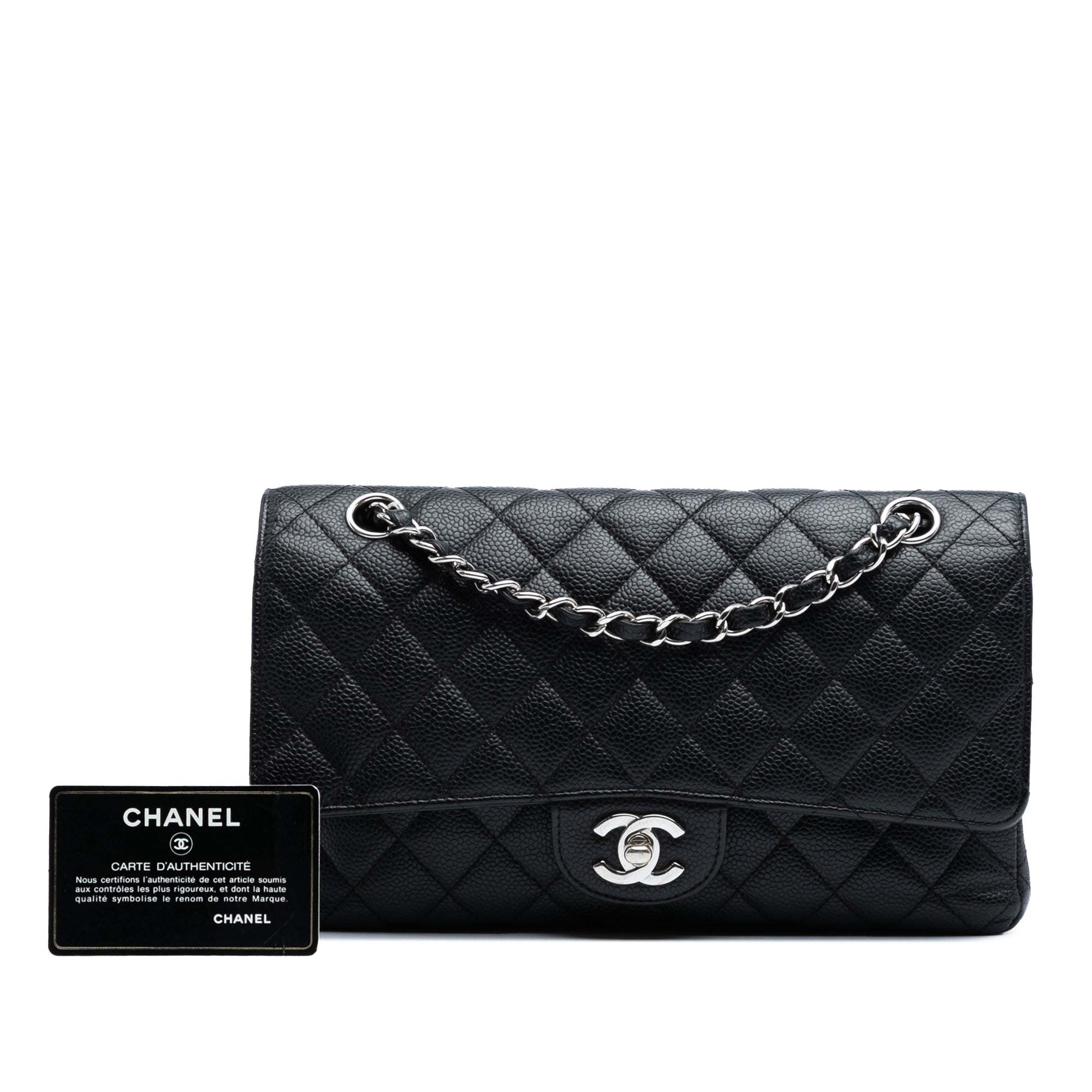 This shoulder bag features a quilted caviar leather body, leather woven chain straps, double front flaps with interlocking Cs and a twist lock closure, an exterior back slip pocket, and interior zip and slip pockets. Inclusion: authenticity card. Retail Price: 10200.00