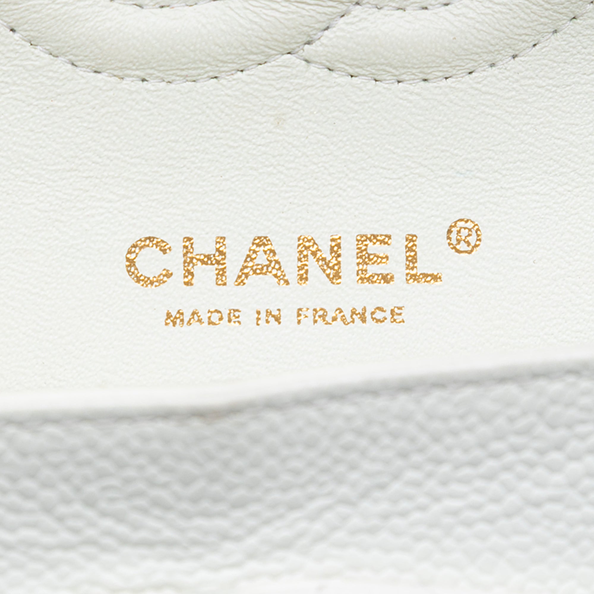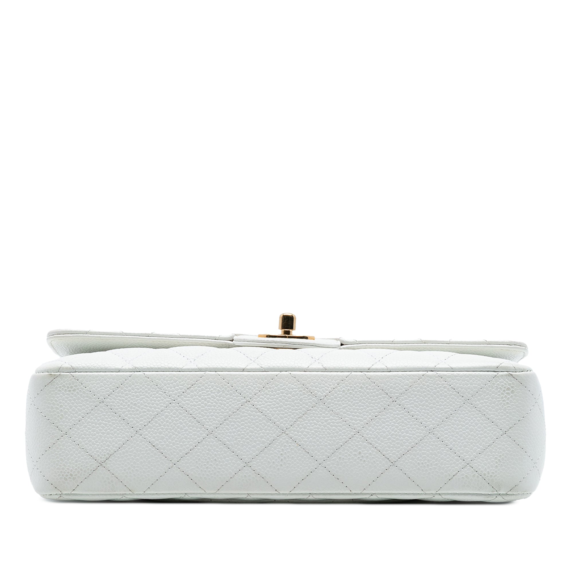 This shoulder bag features a quilted caviar body, leather woven chain straps, double front flaps with interlocking Cs and a twist lock closure, an exterior back slip pocket, and interior zip and slip pockets. Retail Price: 10500.00