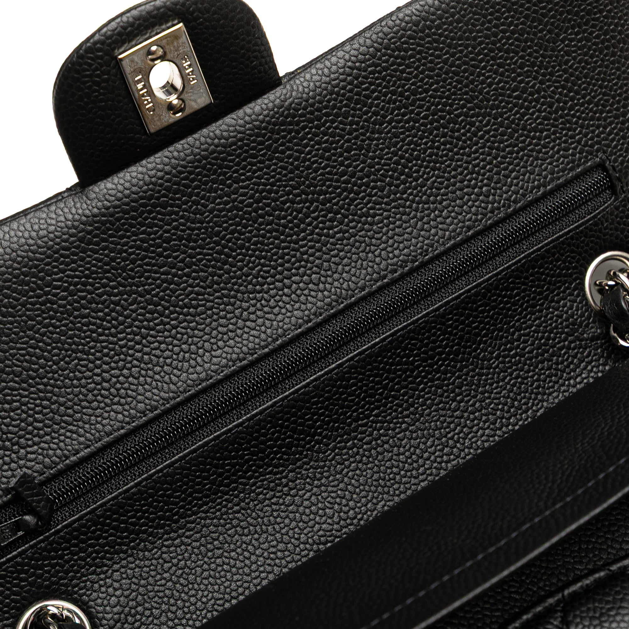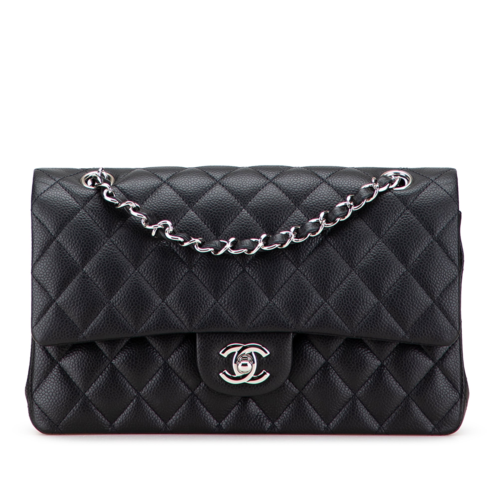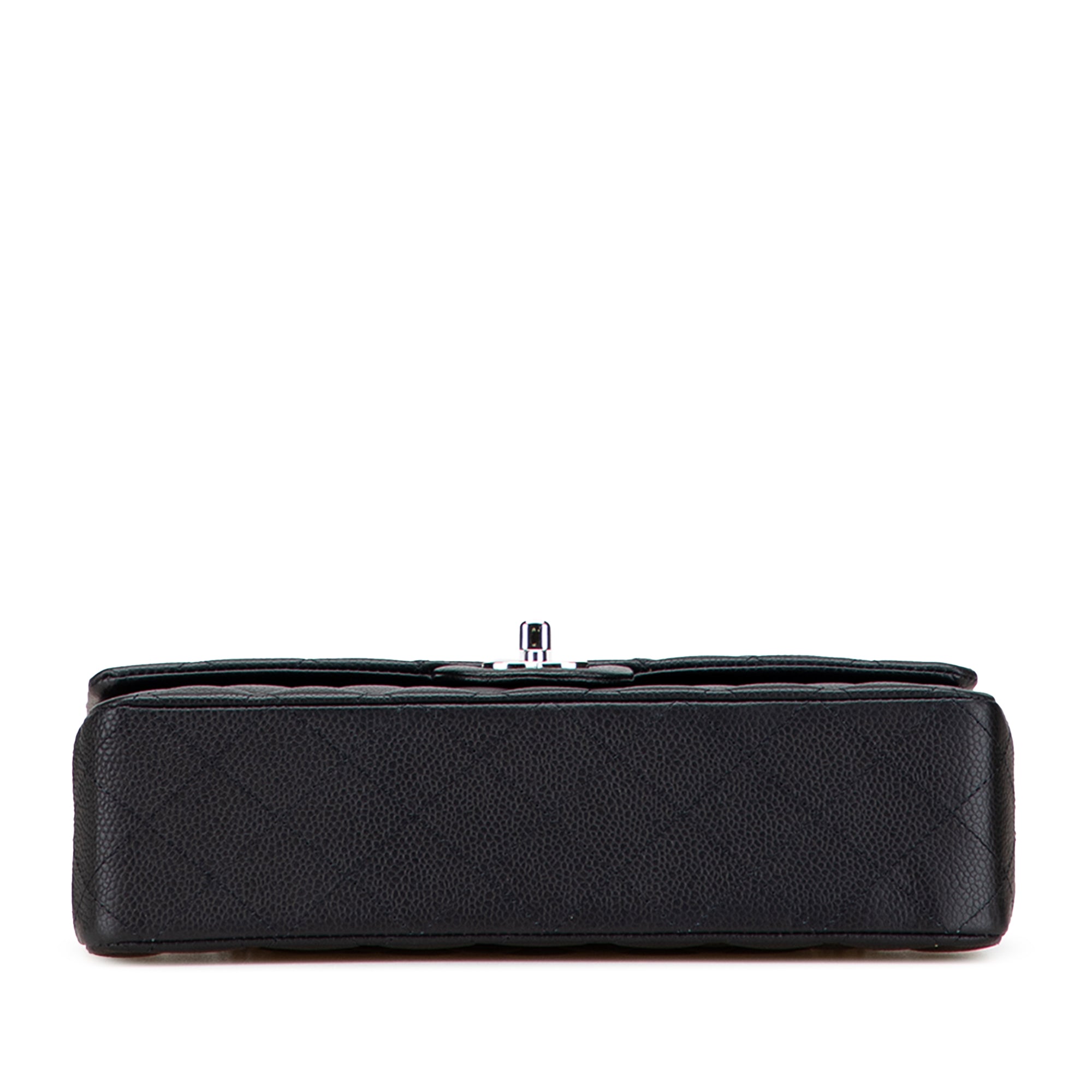 This shoulder bag features a quilted caviar leather body, an exterior back slip pocket, leather woven chain straps, double front flaps with interlocking Cs and a twist lock closure, and interior zip and slip pockets. Inclusion: authenticity card. Retail Price: 10350.00