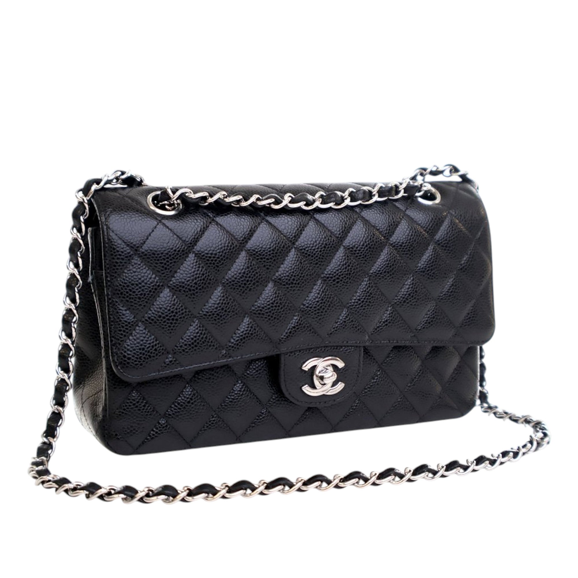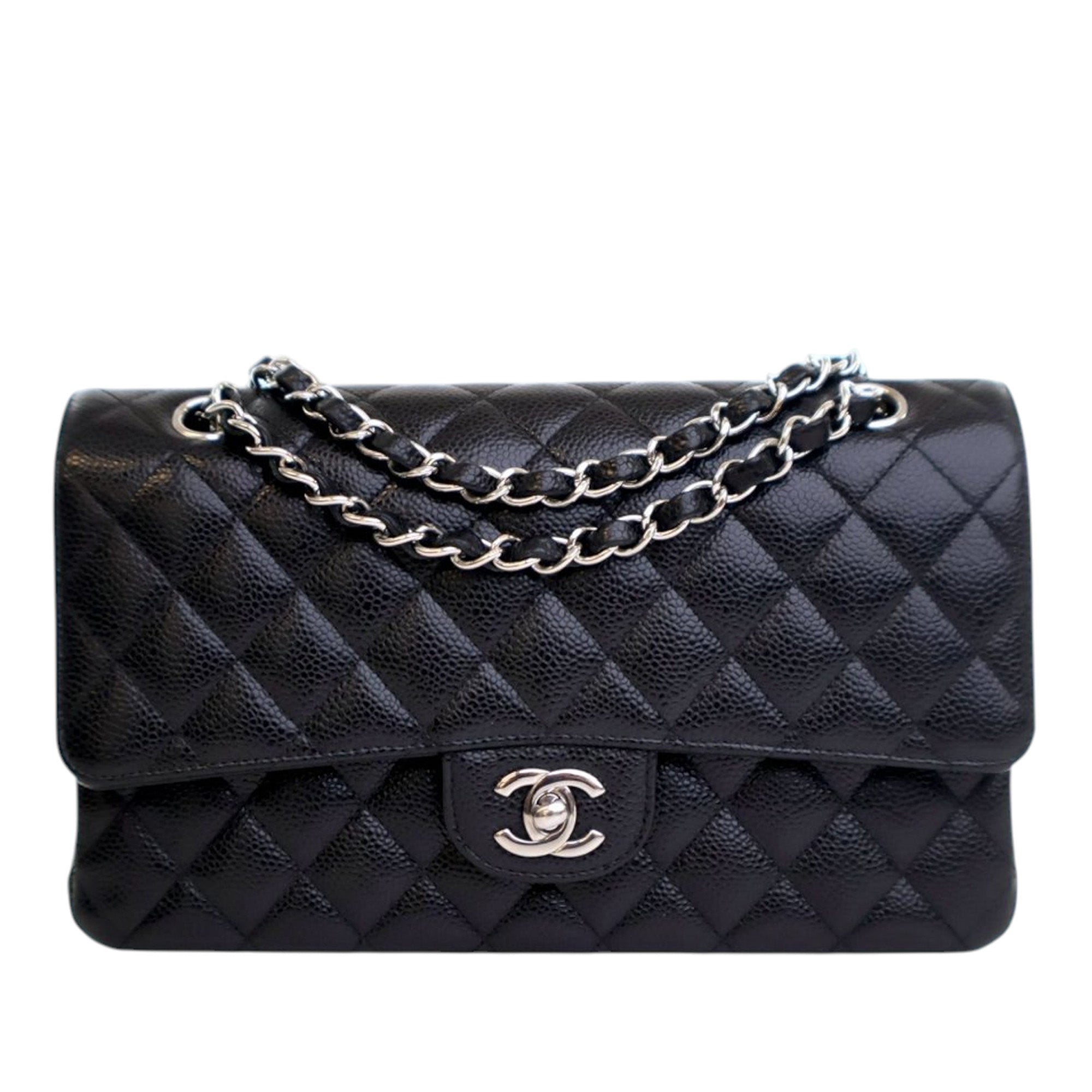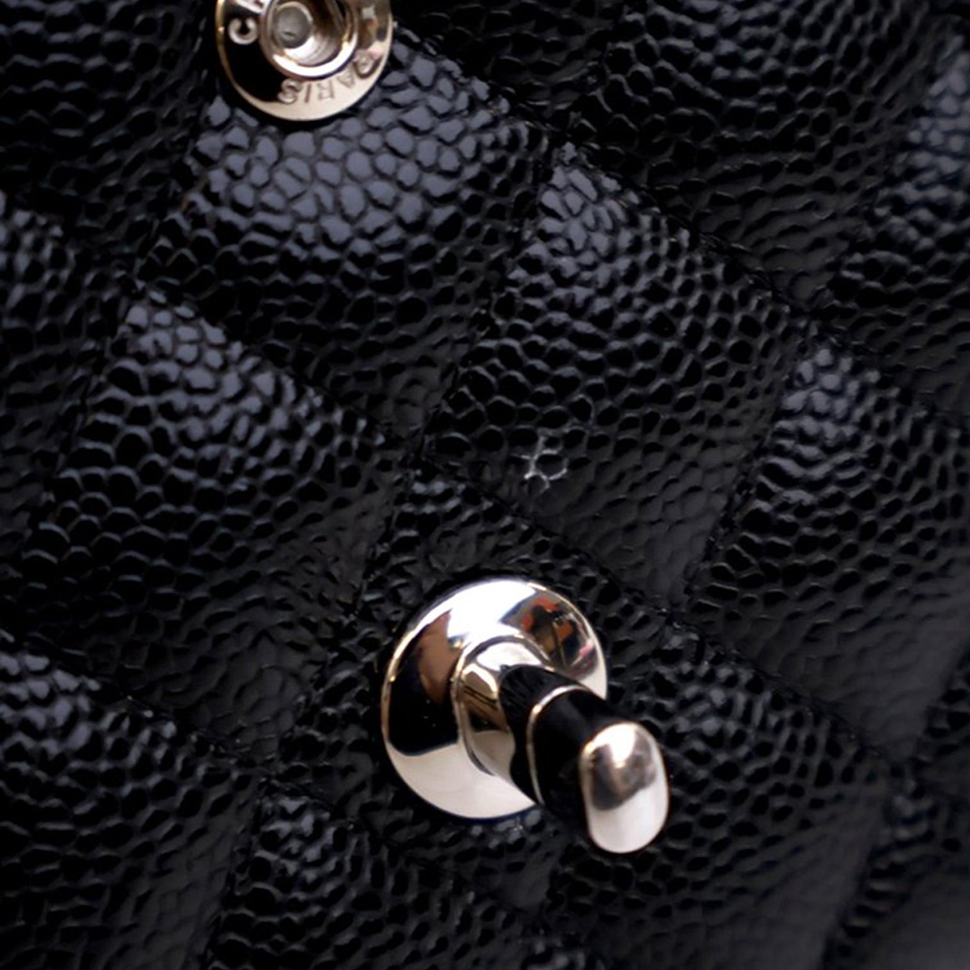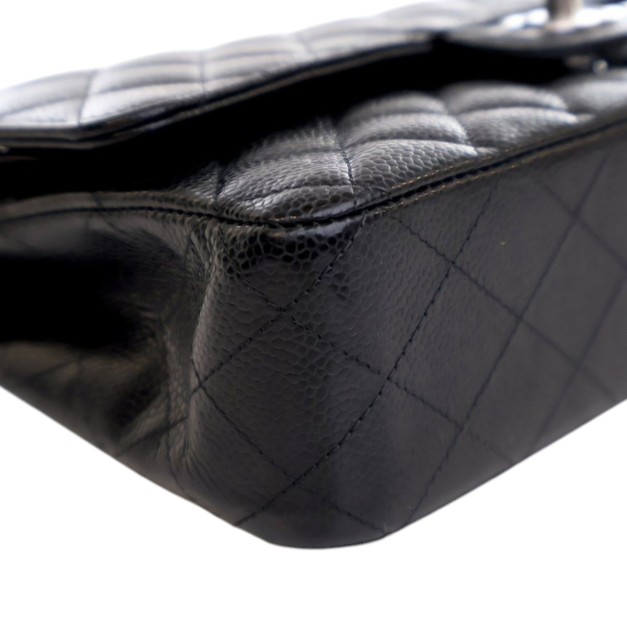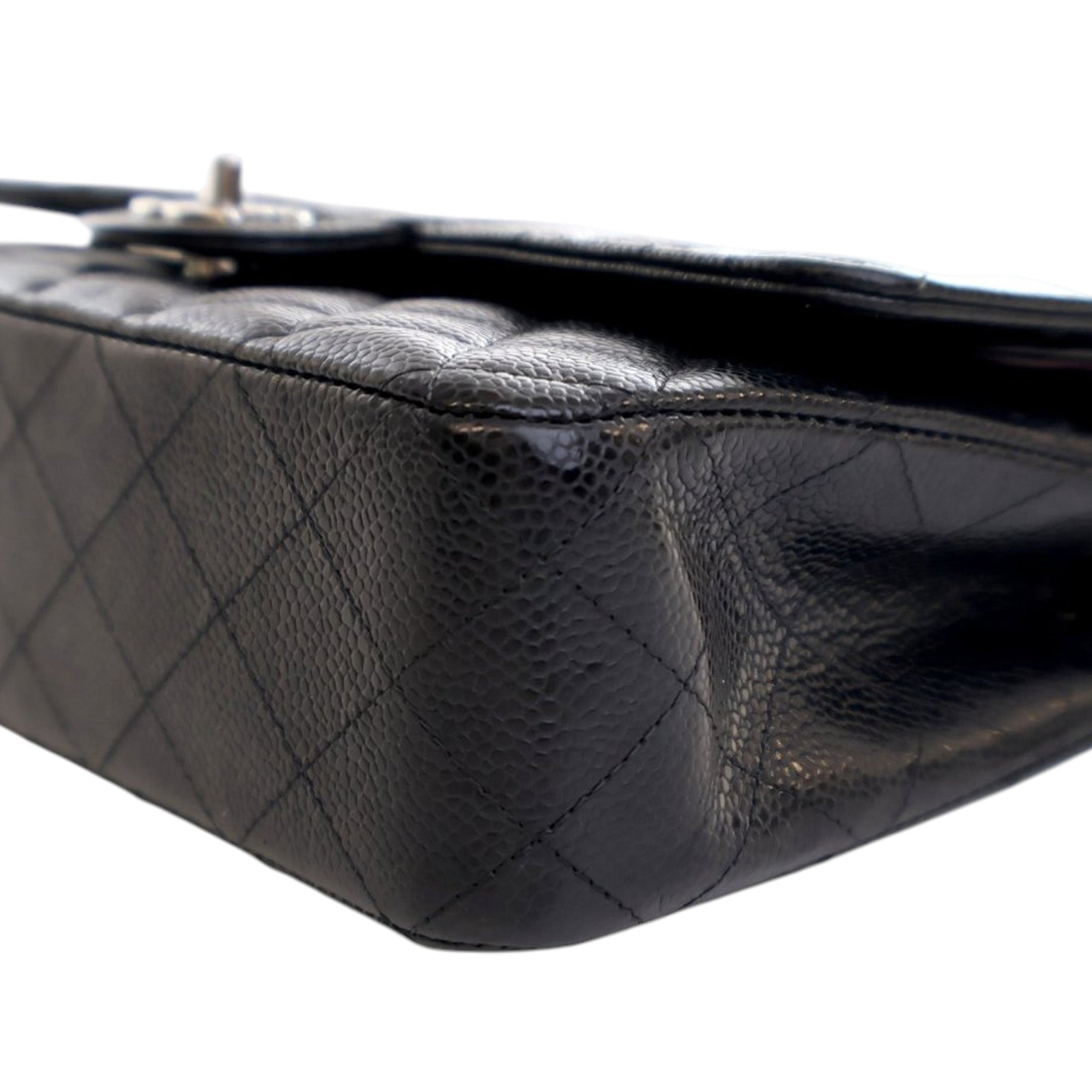 This shoulder bag features a quilted caviar leather body, a silver-tone leather woven chain link shoulder straps, double front flaps with interlocking Cs and a twist lock closure, an exterior back slip pocket, and interior zip and slip pockets. Inclusion: Dust bag, box. Retail Price: 10200.00