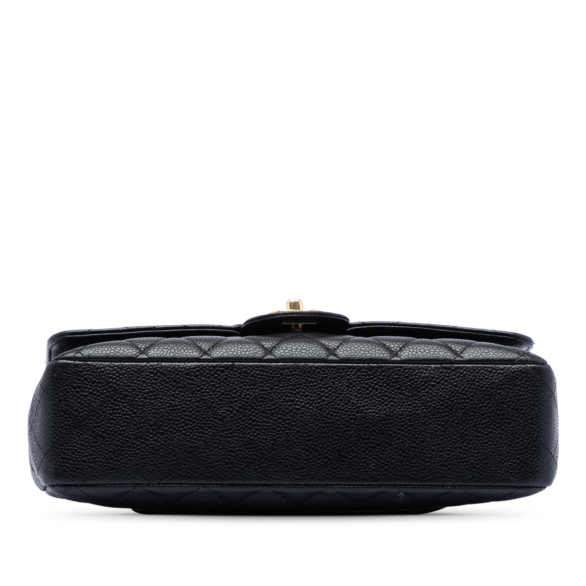 This shoulder bag features a quilted caviar leather body, a leather woven chain strap, double front flaps with CC turn-lock closure, an exterior back slip pocket, and interior slip pockets. Retail Price: 10500.00