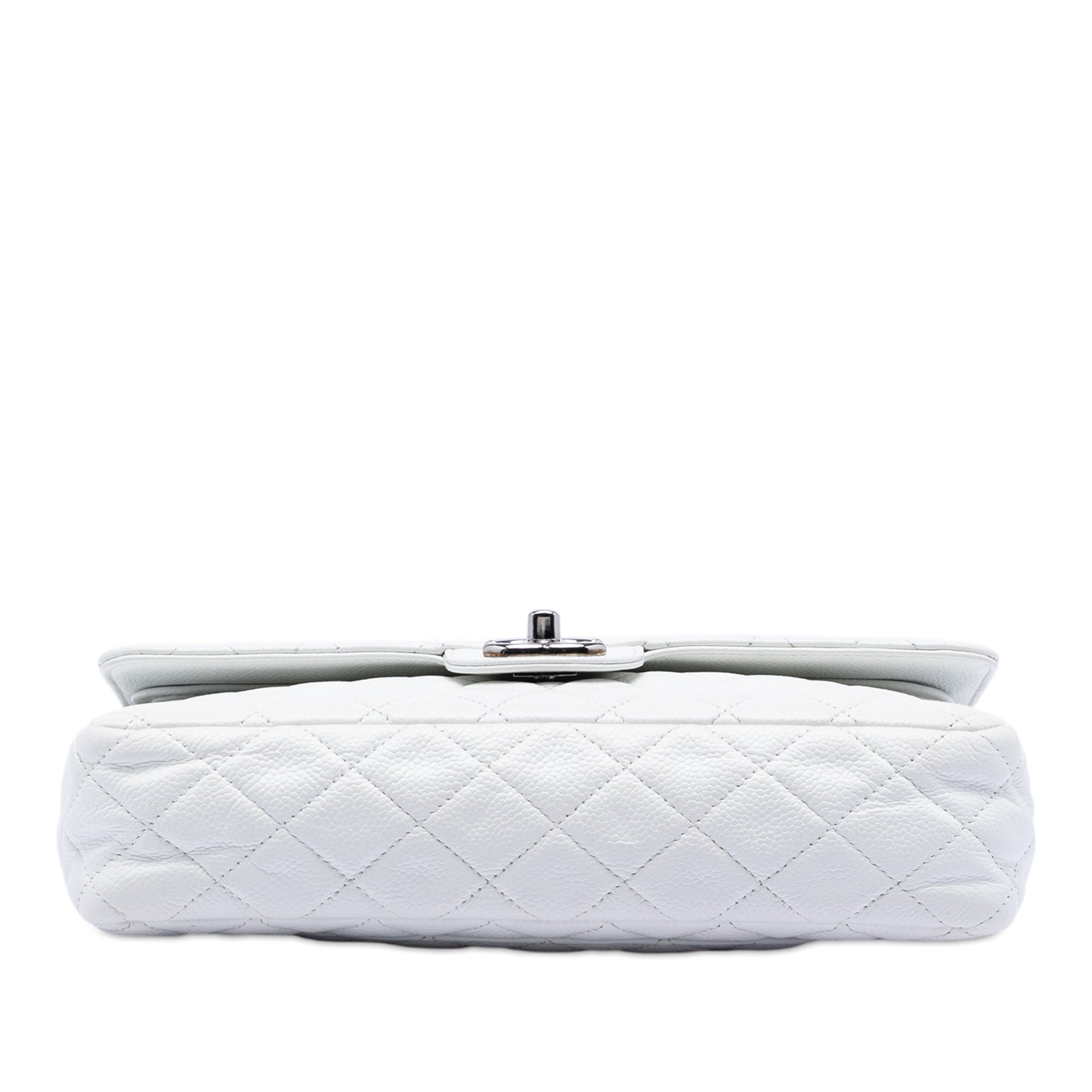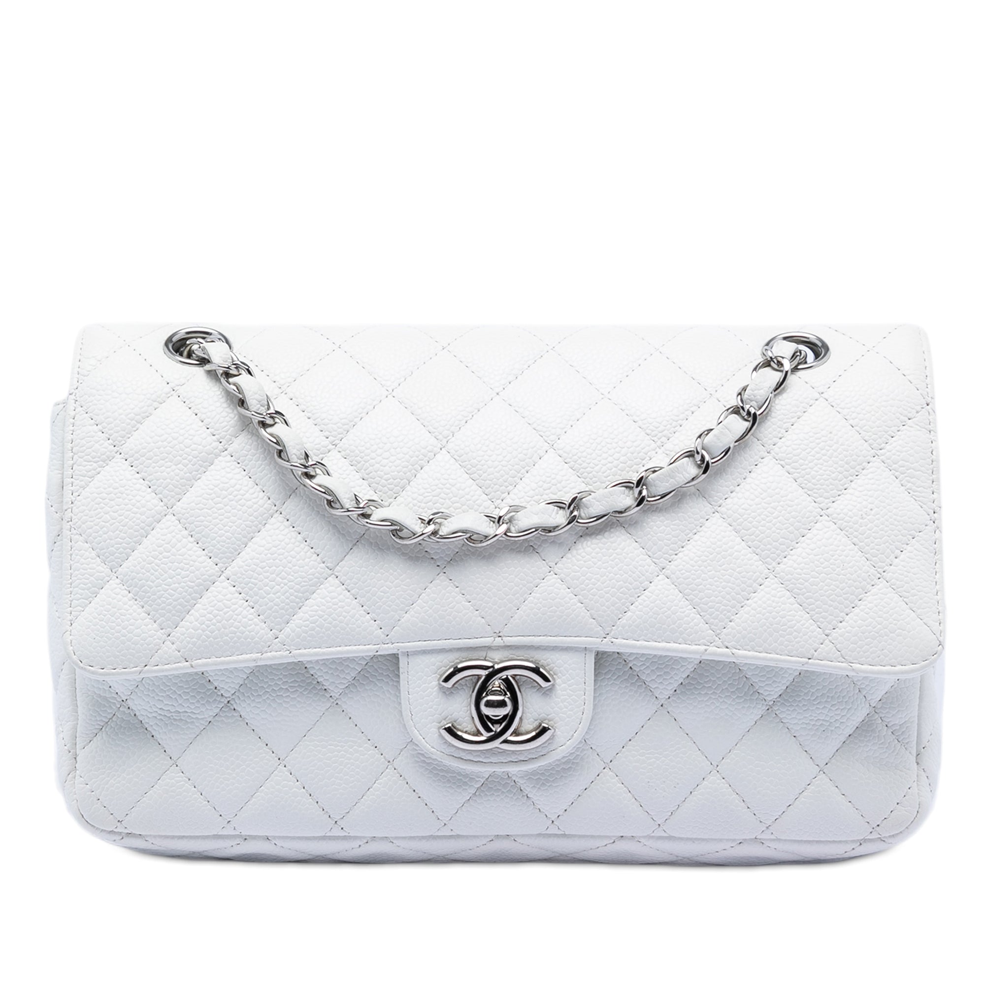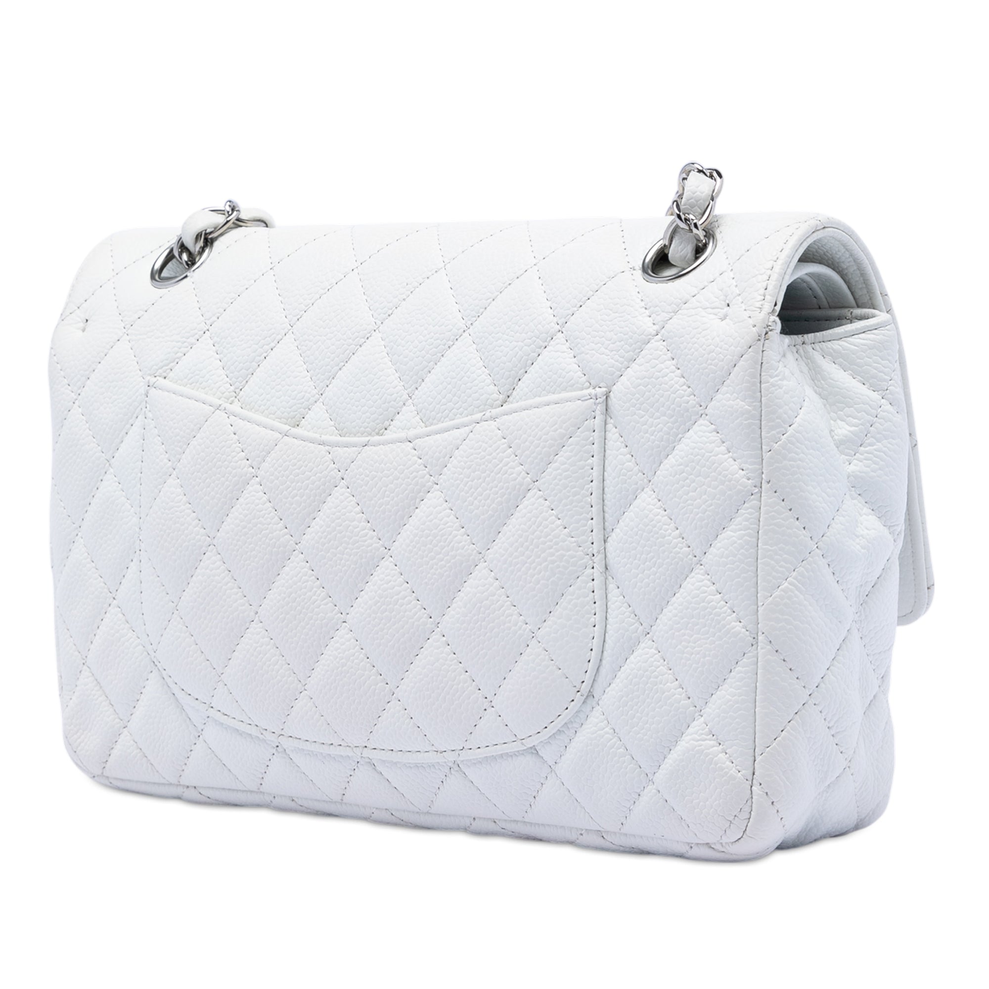 This shoulder bag features a quilted caviar body, a silver-tone leather woven chain link straps, double front flaps with interlocking Cs and a twist lock closure, an exterior back slip pocket, and interior zip and slip pockets. Retail Price: 10522.00