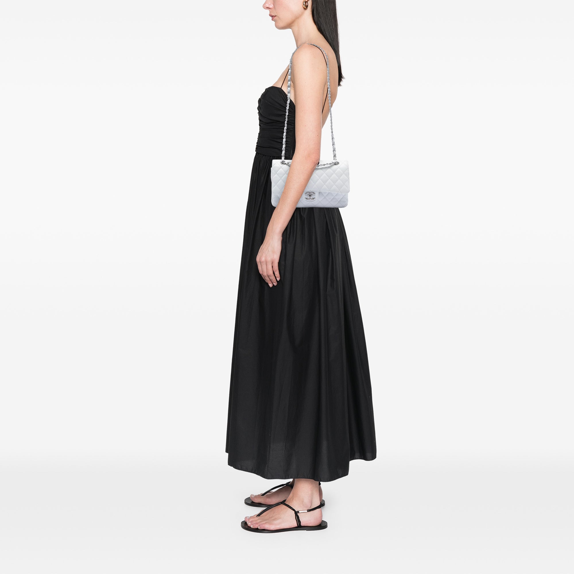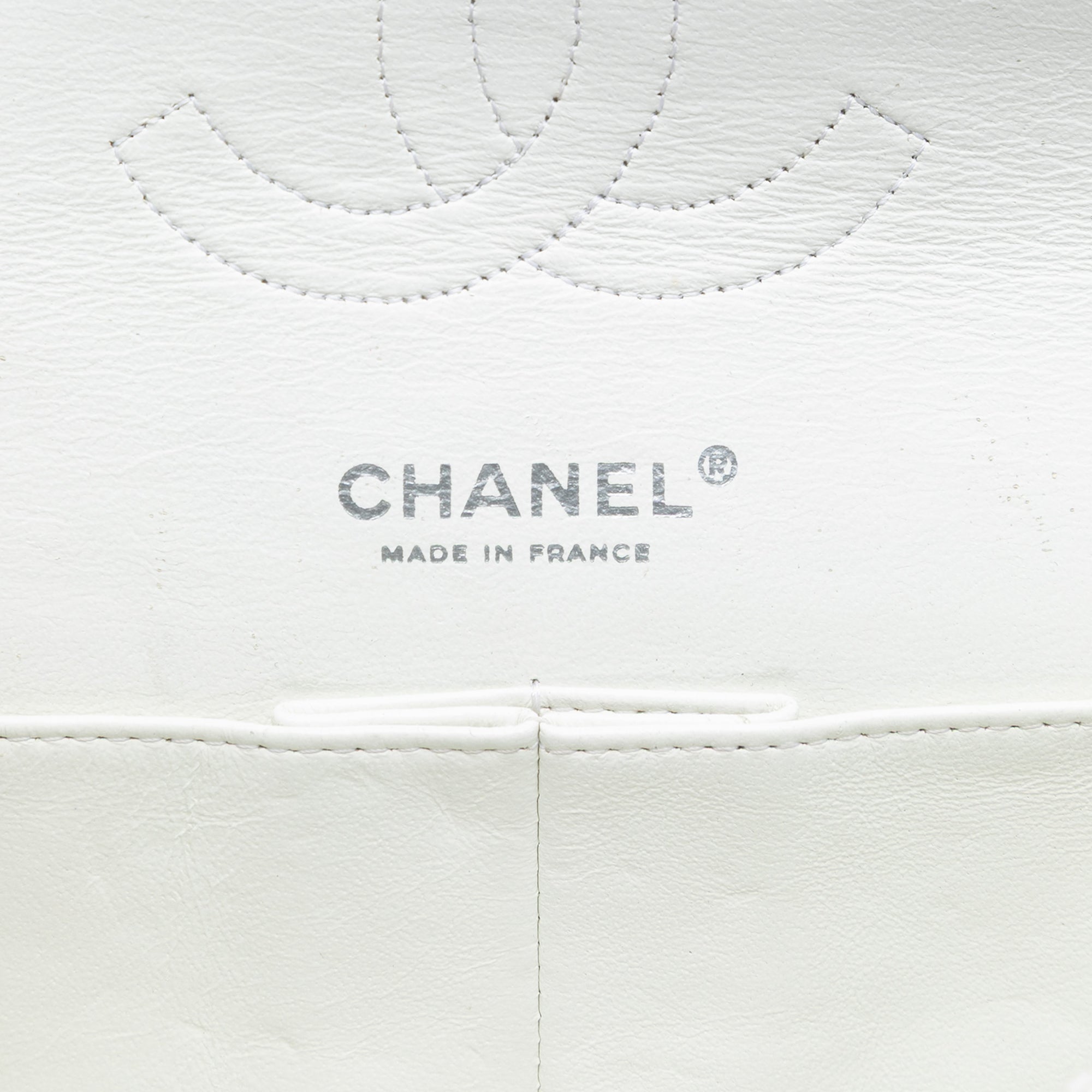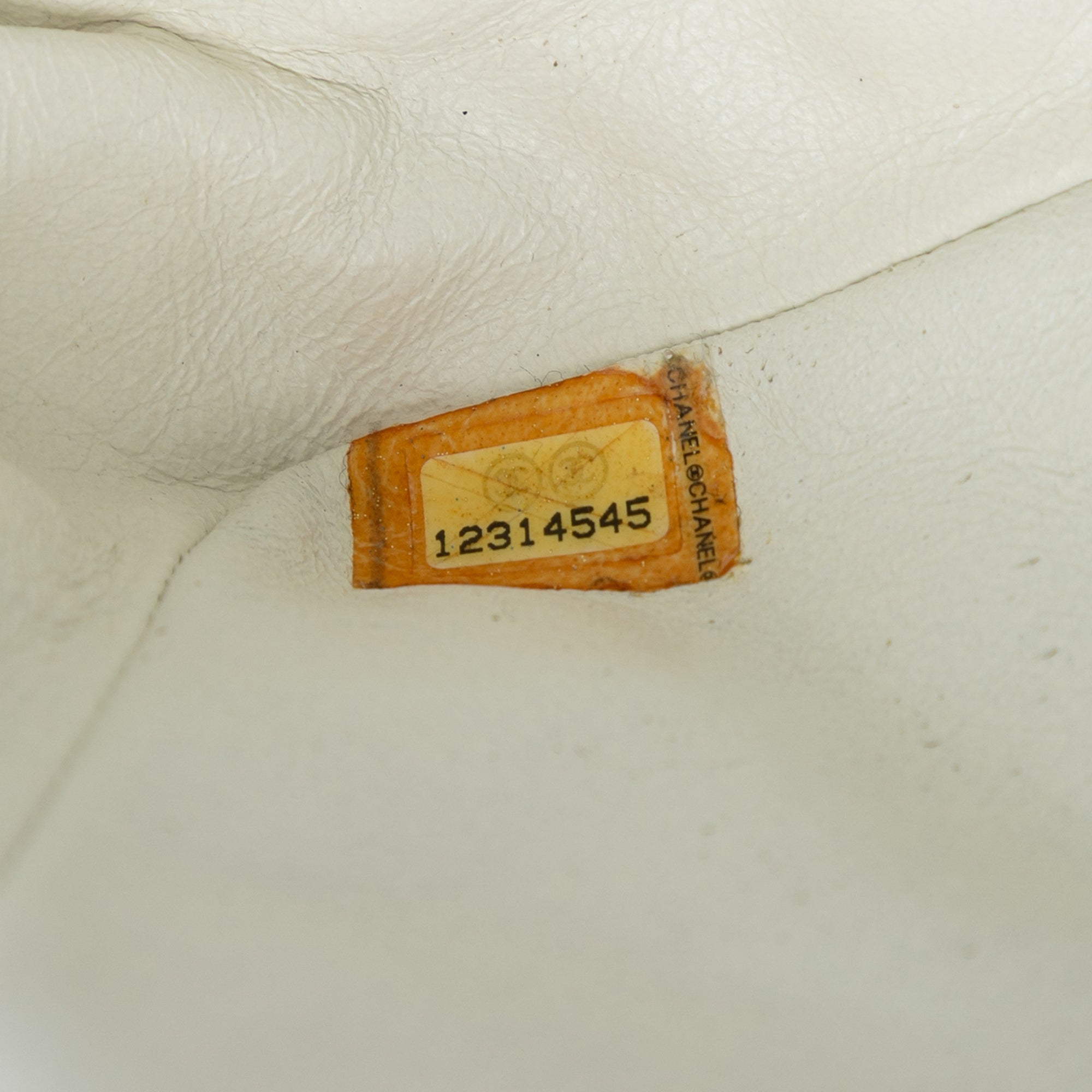 This shoulder bag features a quilted caviar body, a silver-tone leather woven chain link straps, double front flaps with interlocking Cs and a twist lock closure, an exterior back slip pocket, and interior zip and slip pockets. Retail Price: 10522.00