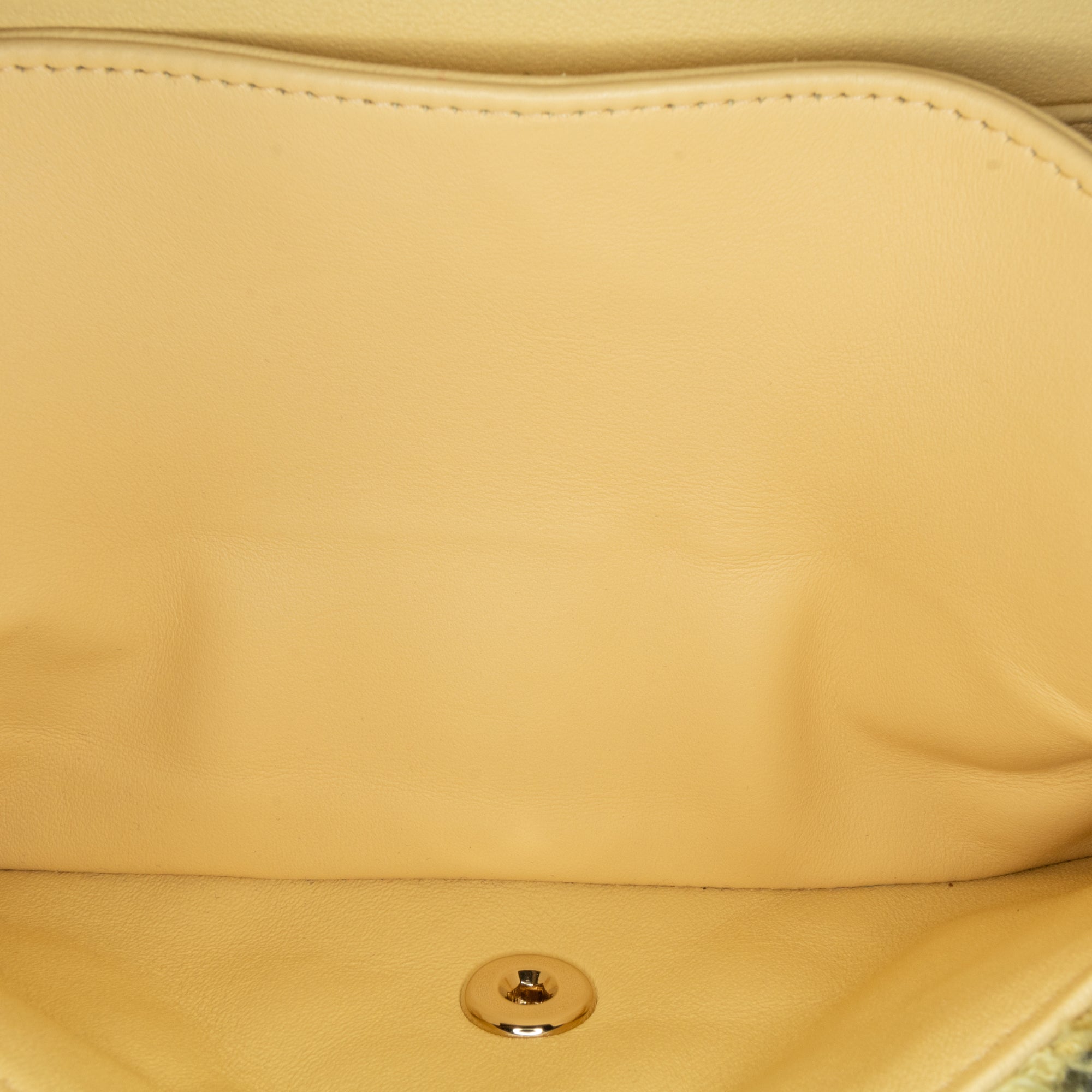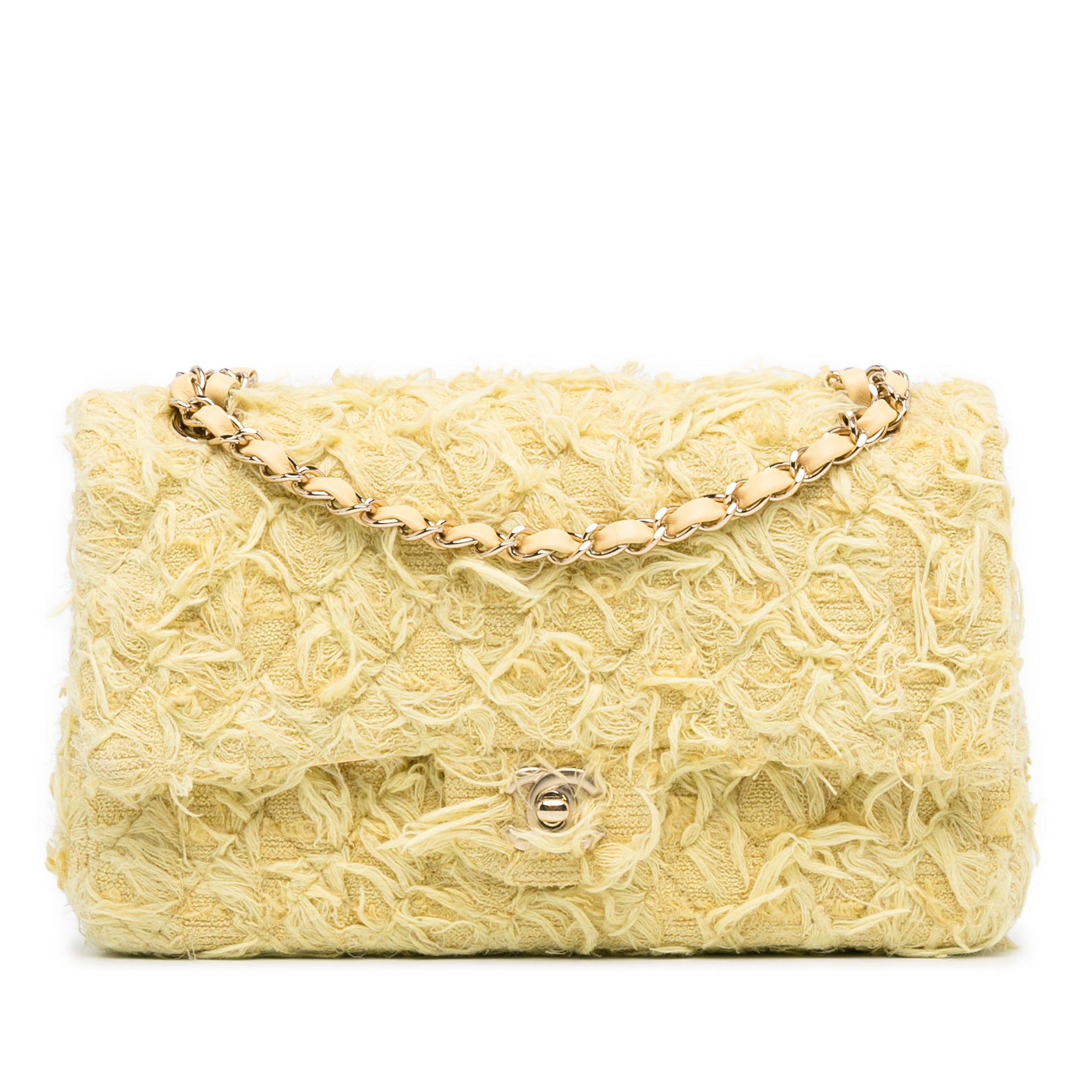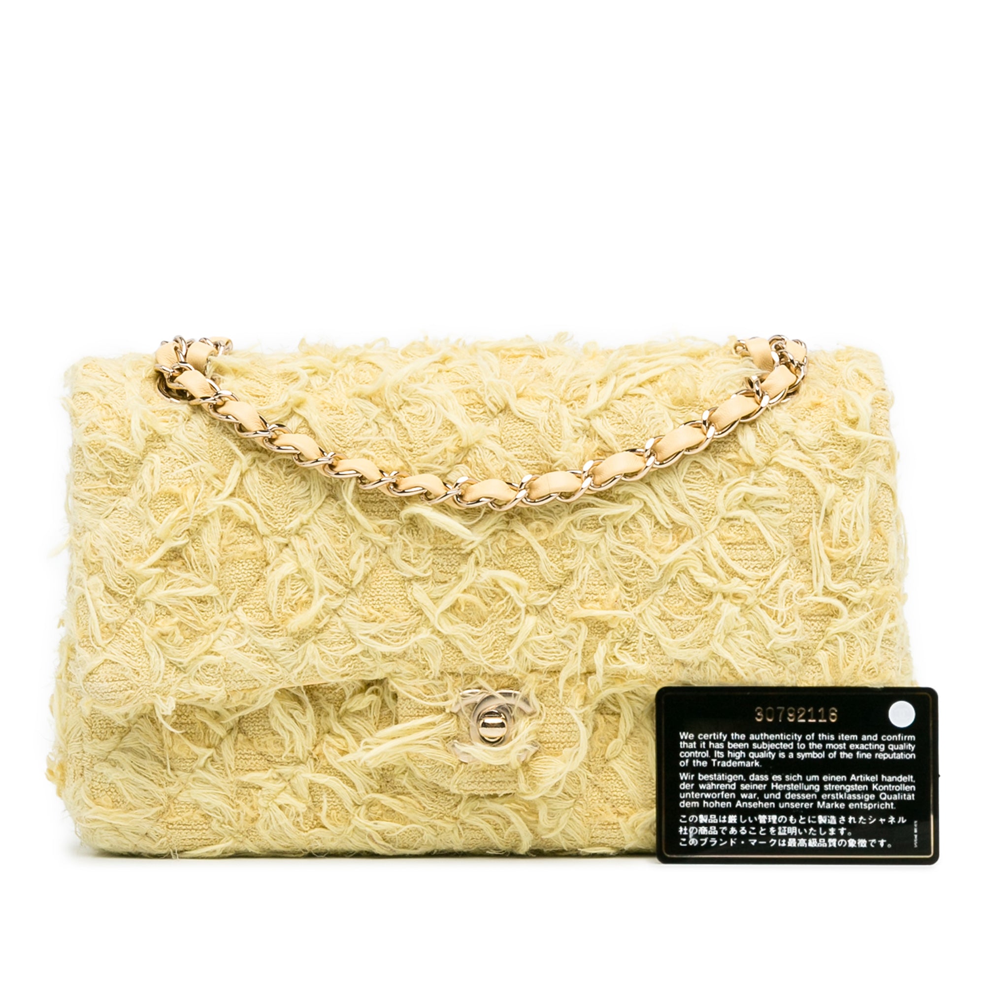 This shoulder bag features a fringed tweed body, leather-woven chain shoulder straps, double front flaps with CC turnlock closure, an exterior back slip pocket, and interior zip and slip pockets. Inclusion: authenticity card. Retail Price: 10800.00