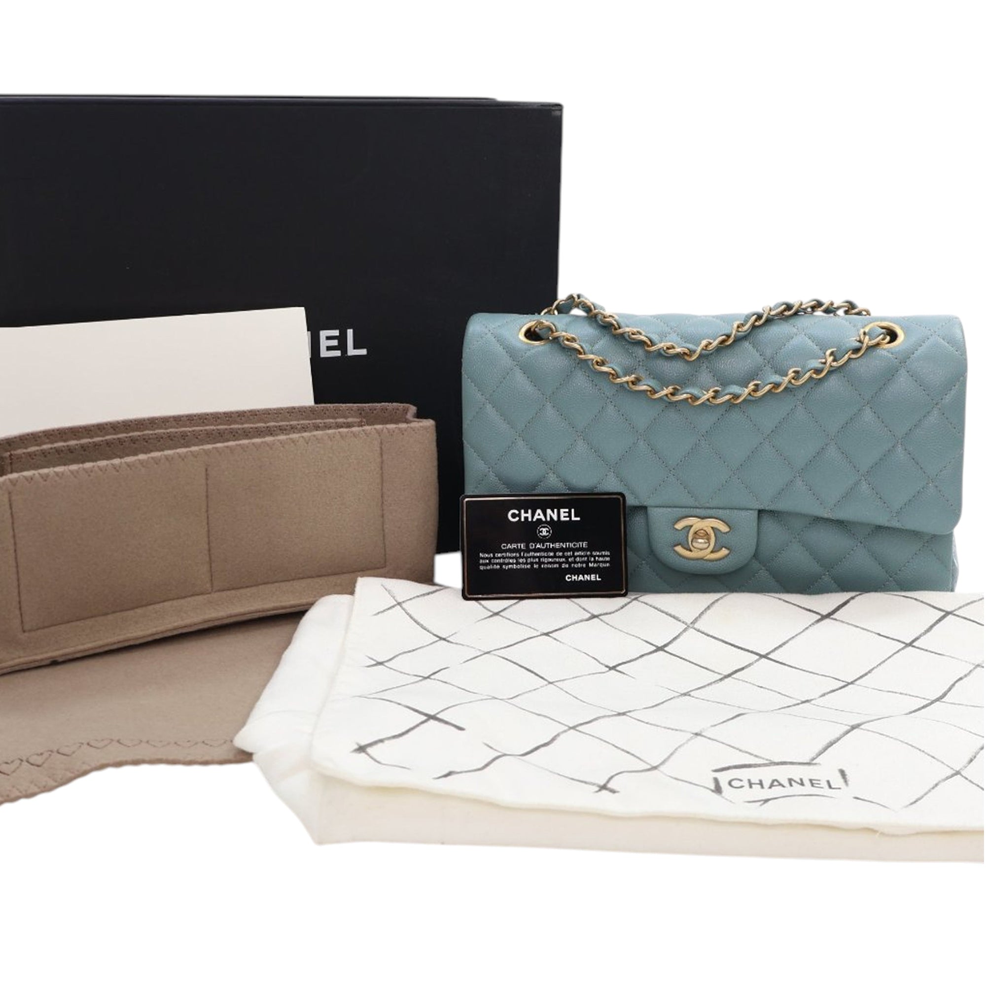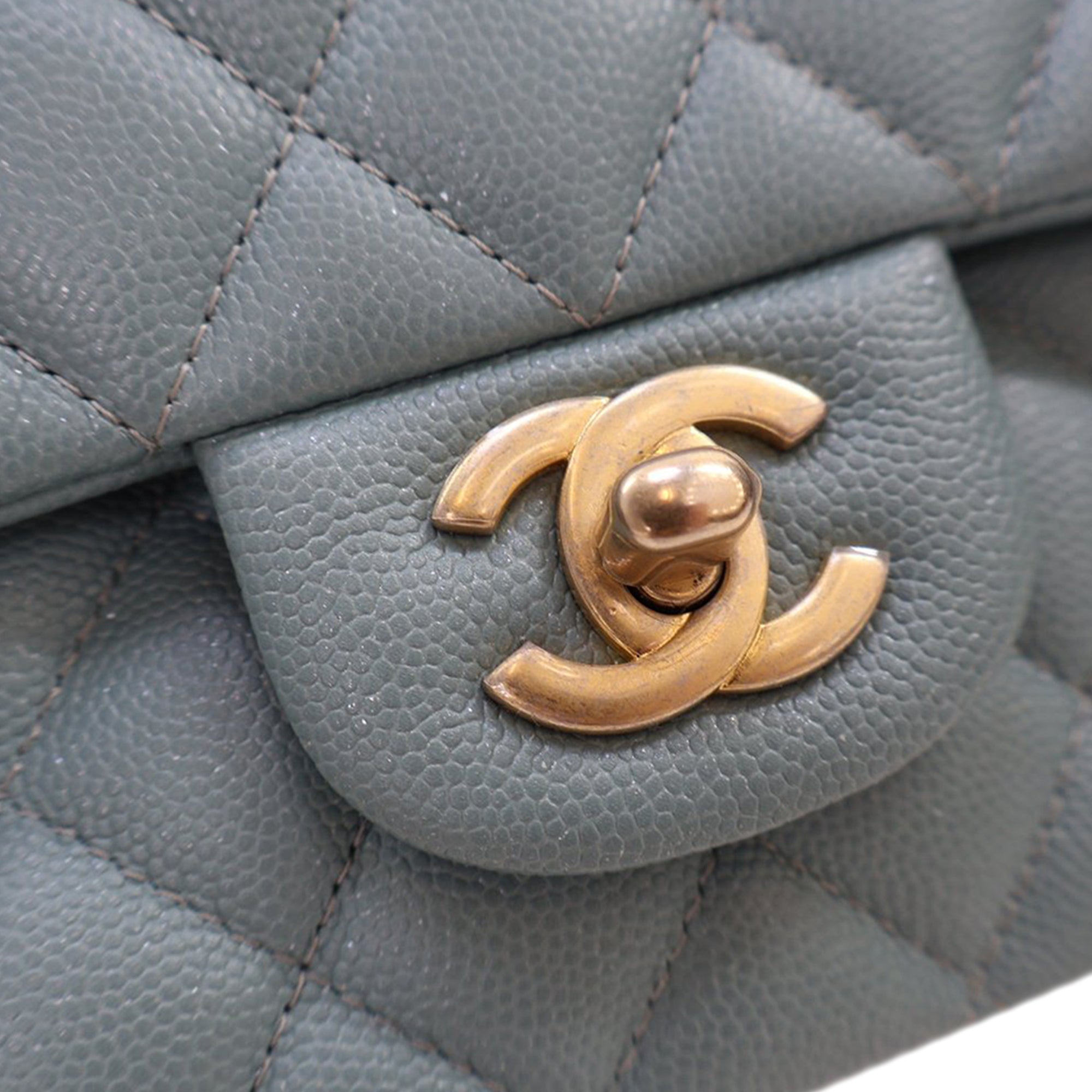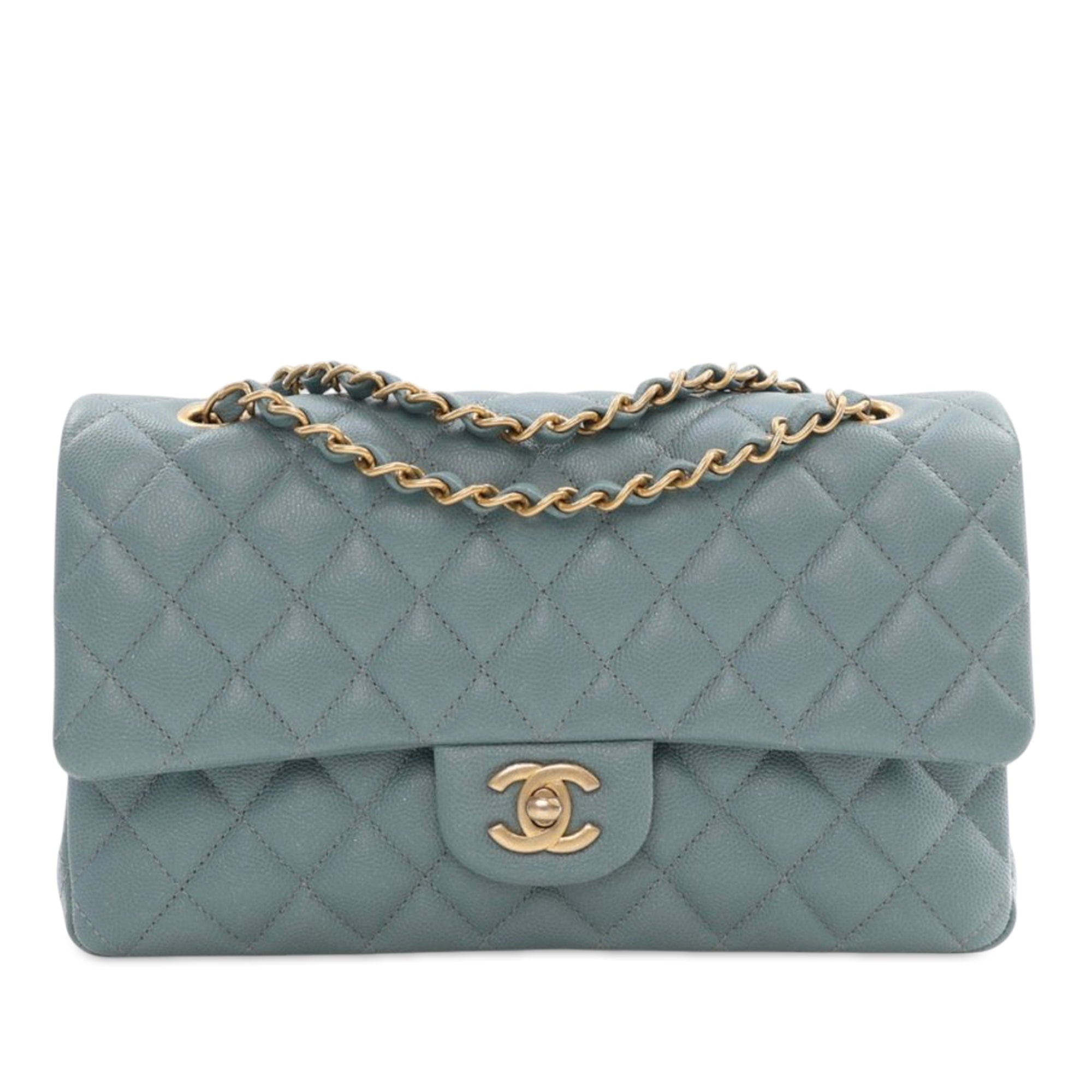 This shoulder bag features a quilted caviar leather body, a leather woven chain strap, double front flaps with CC turn-lock closure, an exterior back slip pocket, and interior zip and slip pockets. Inclusion: Dust bag, box, authenticity card. Retail Price: 10200.00