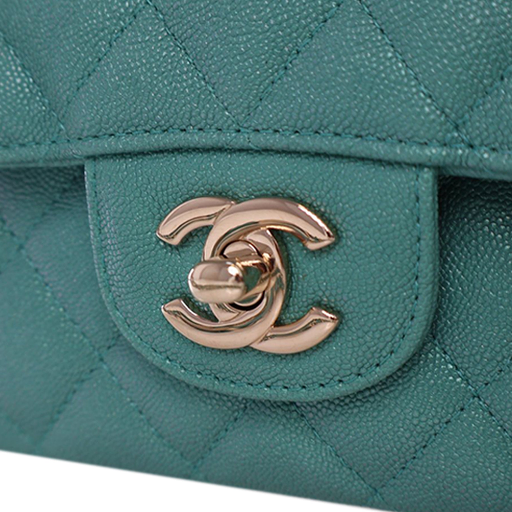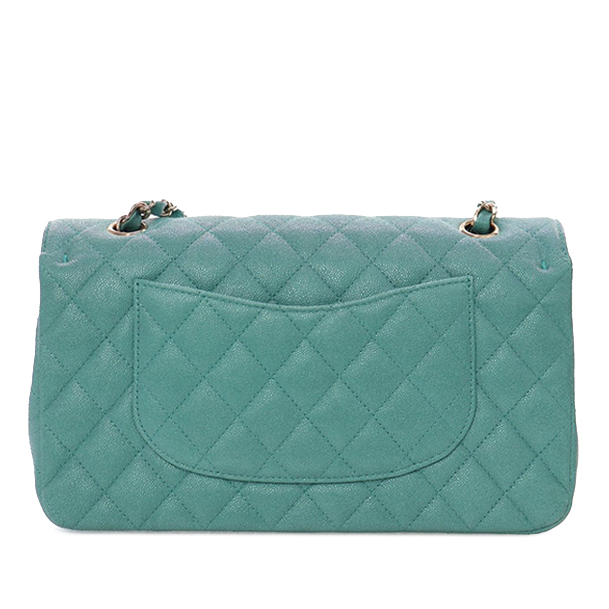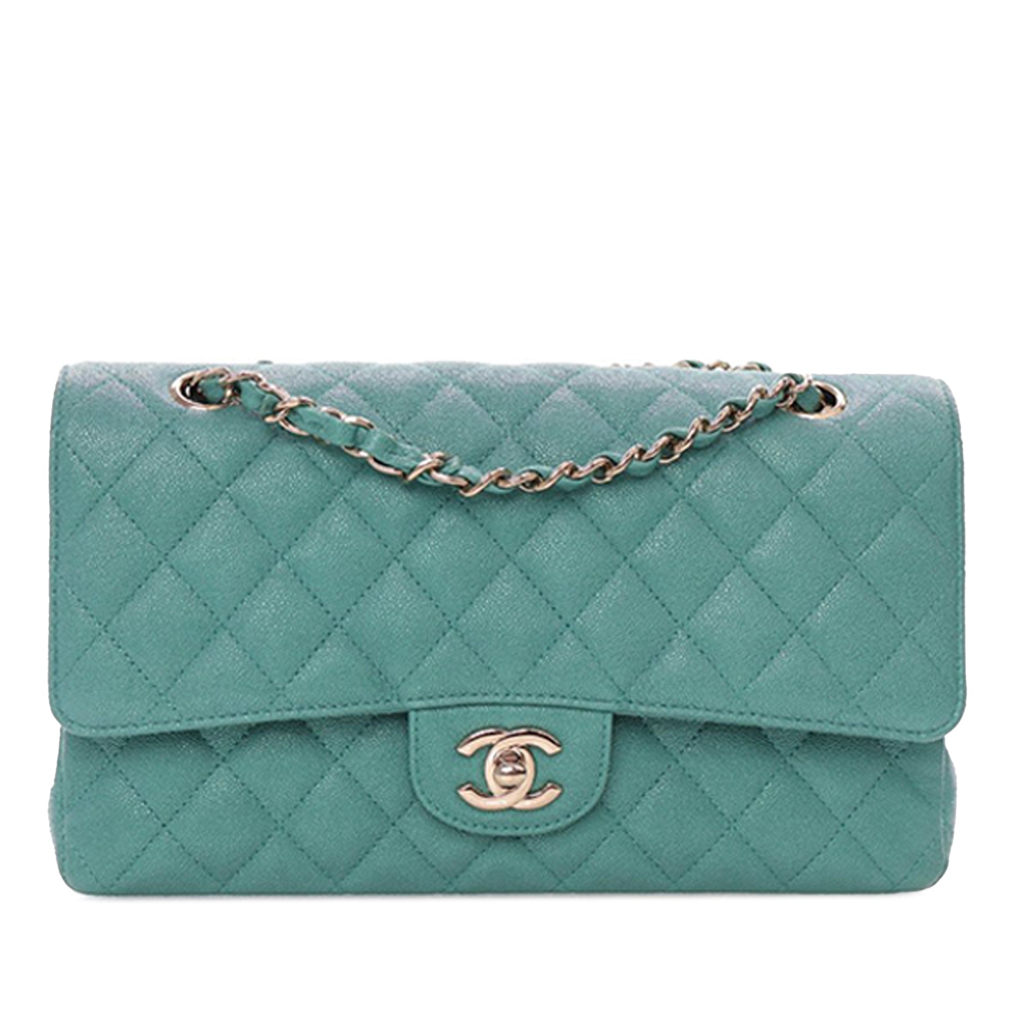 This shoulder bag features a quilted caviar leather body, a leather woven chain strap, double front flaps with CC turn-lock closure, an exterior back slip pocket, and interior zip and slip pockets. Inclusion: Dust bag, authenticity card. Retail Price: 10200.00