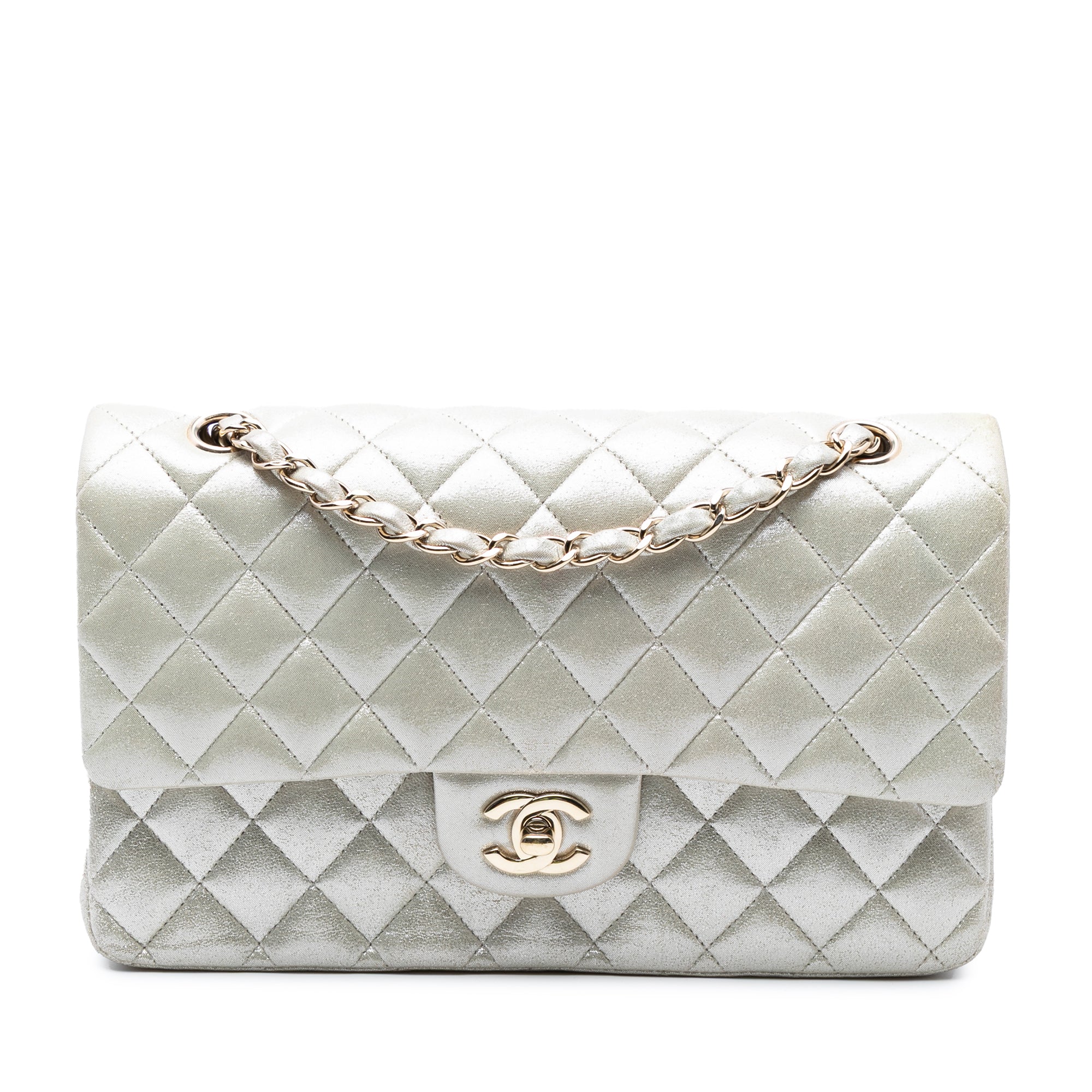 The Classic Flap bag features a quilted metallic lambskin leather body, a leather woven chain strap, double top flaps with CC turn lock closure, an exterior back slip pocket, and interior zip and slip pockets. Inclusion: authenticity card. Retail Price: 10500.00
