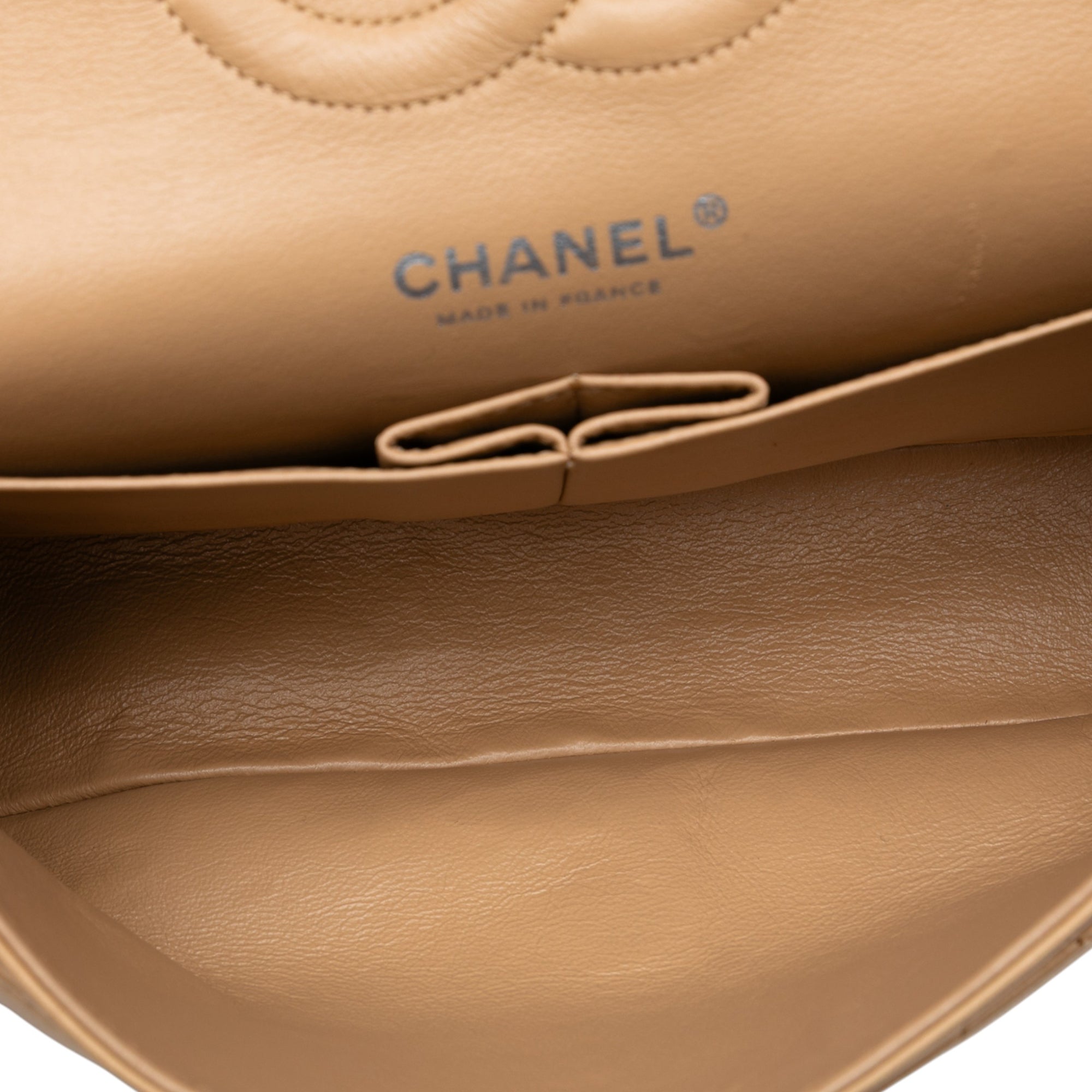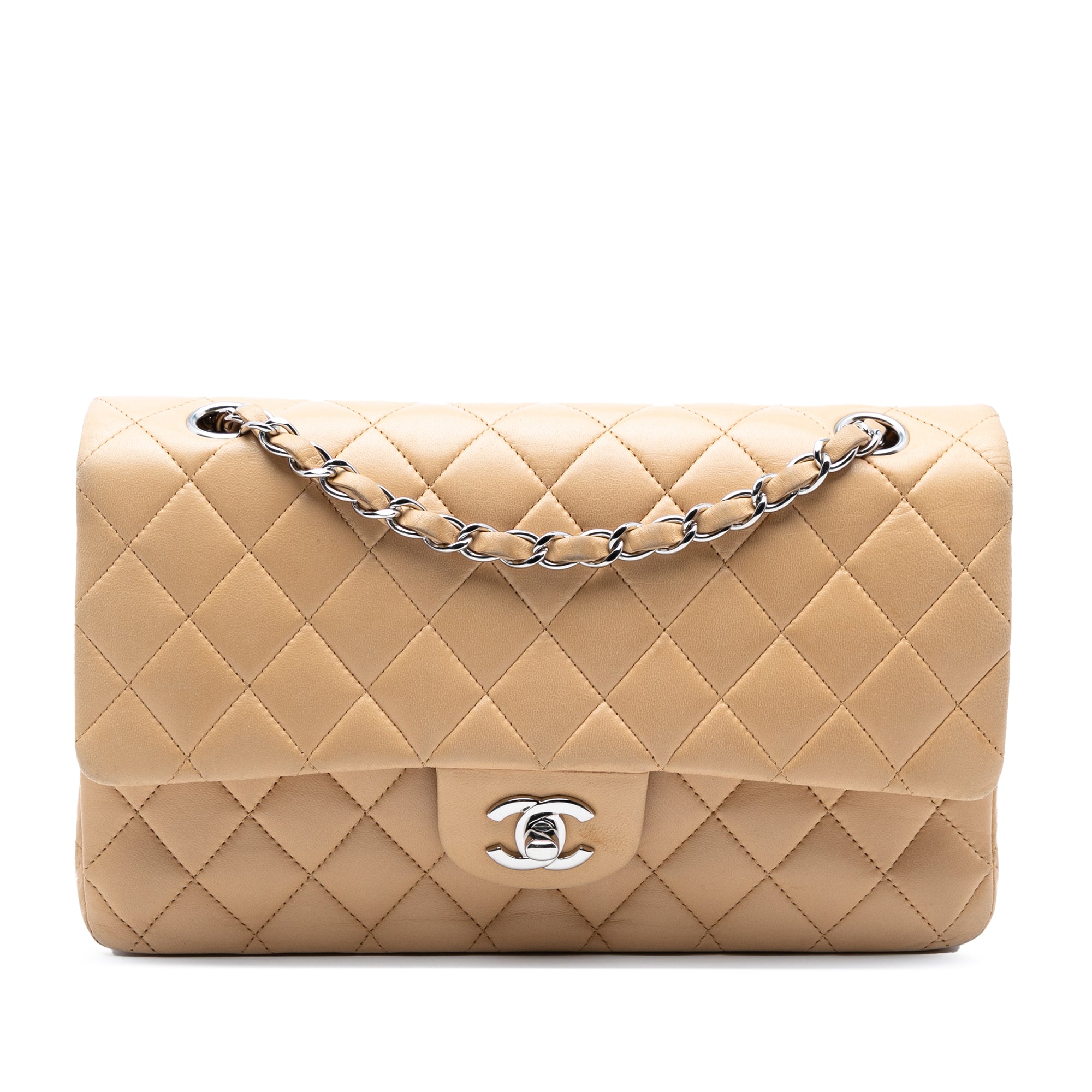 This shoulder bag features a quilted lambskin body, leather woven chain straps, double front flaps with interlocking Cs and a twist lock closure, an exterior back slip pocket, and interior zip and slip pockets. Retail Price: 10500.00