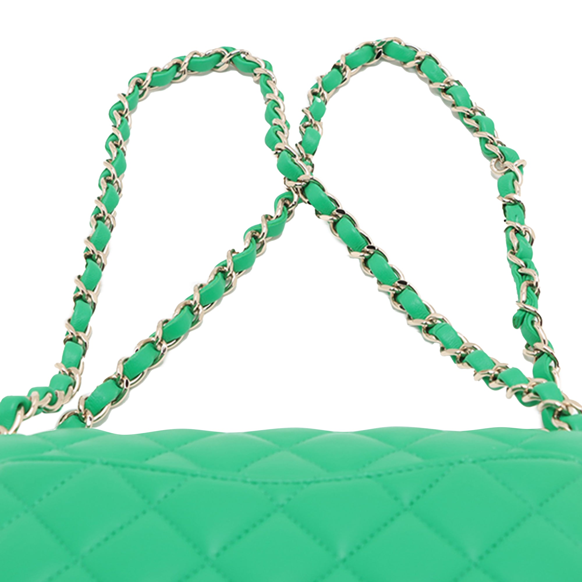 This shoulder bag features a quilted lambskin leather body, a silver-tone leather woven chain link straps, double front flaps with interlocking Cs and a twist lock closure, an exterior back slip pocket, and interior zip and slip pockets. Inclusion: authenticity card. Retail Price: 10200.00