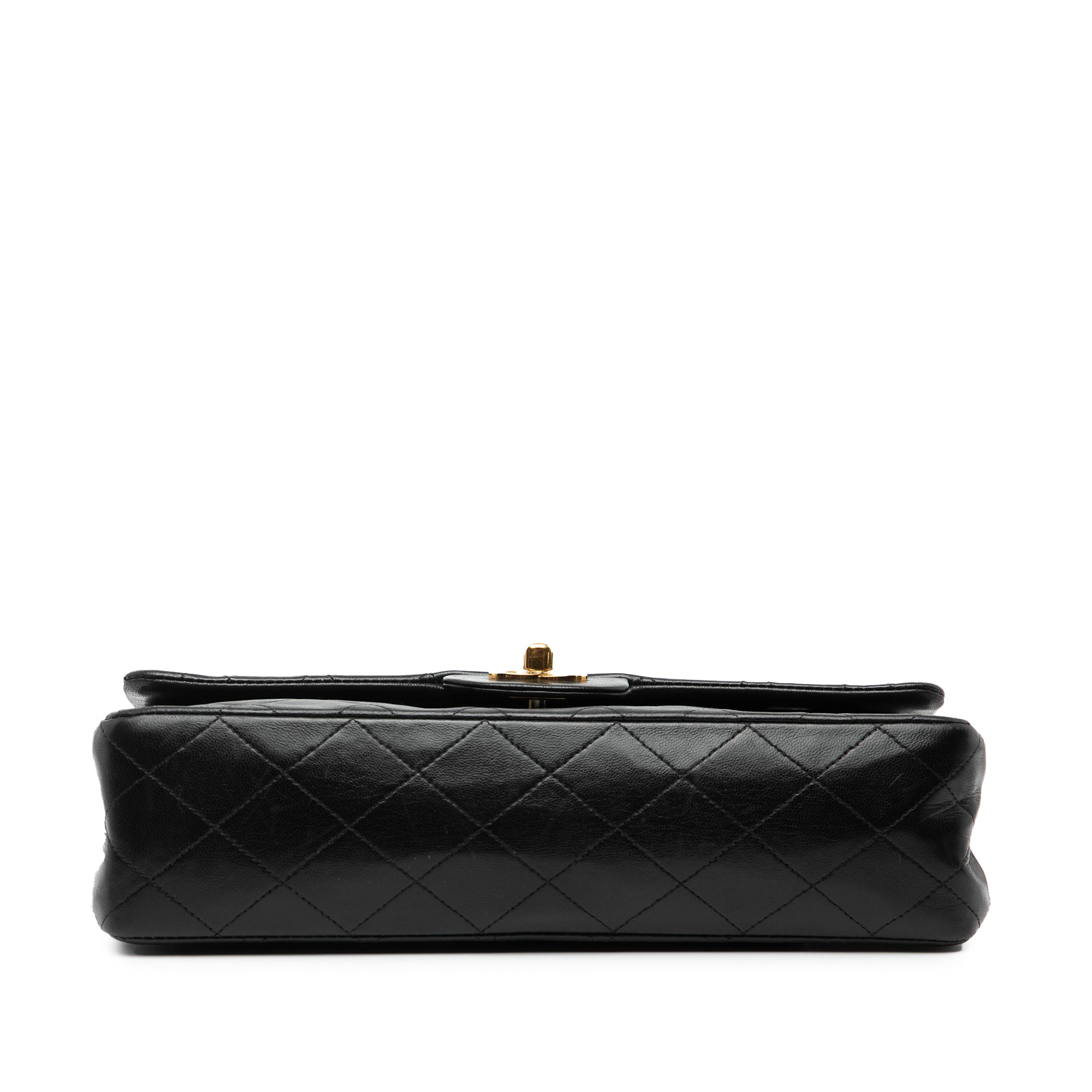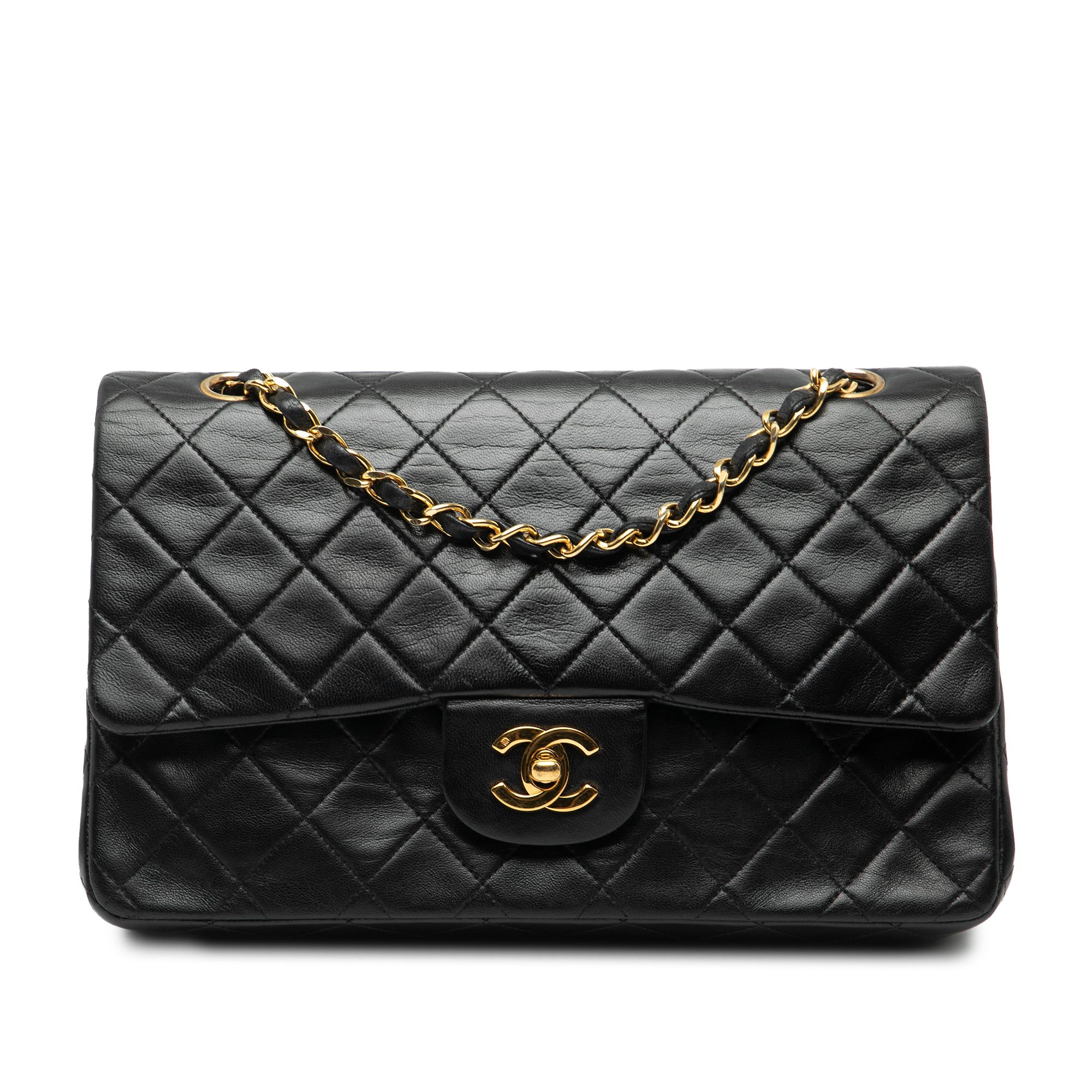This shoulder bag features a quilted lambskin body, leather woven chain straps, double front flaps with interlocking Cs and a twist lock closure, an exterior back slip pocket, and interior zip and slip pockets. Inclusion: authenticity card. Retail Price: 10200.00