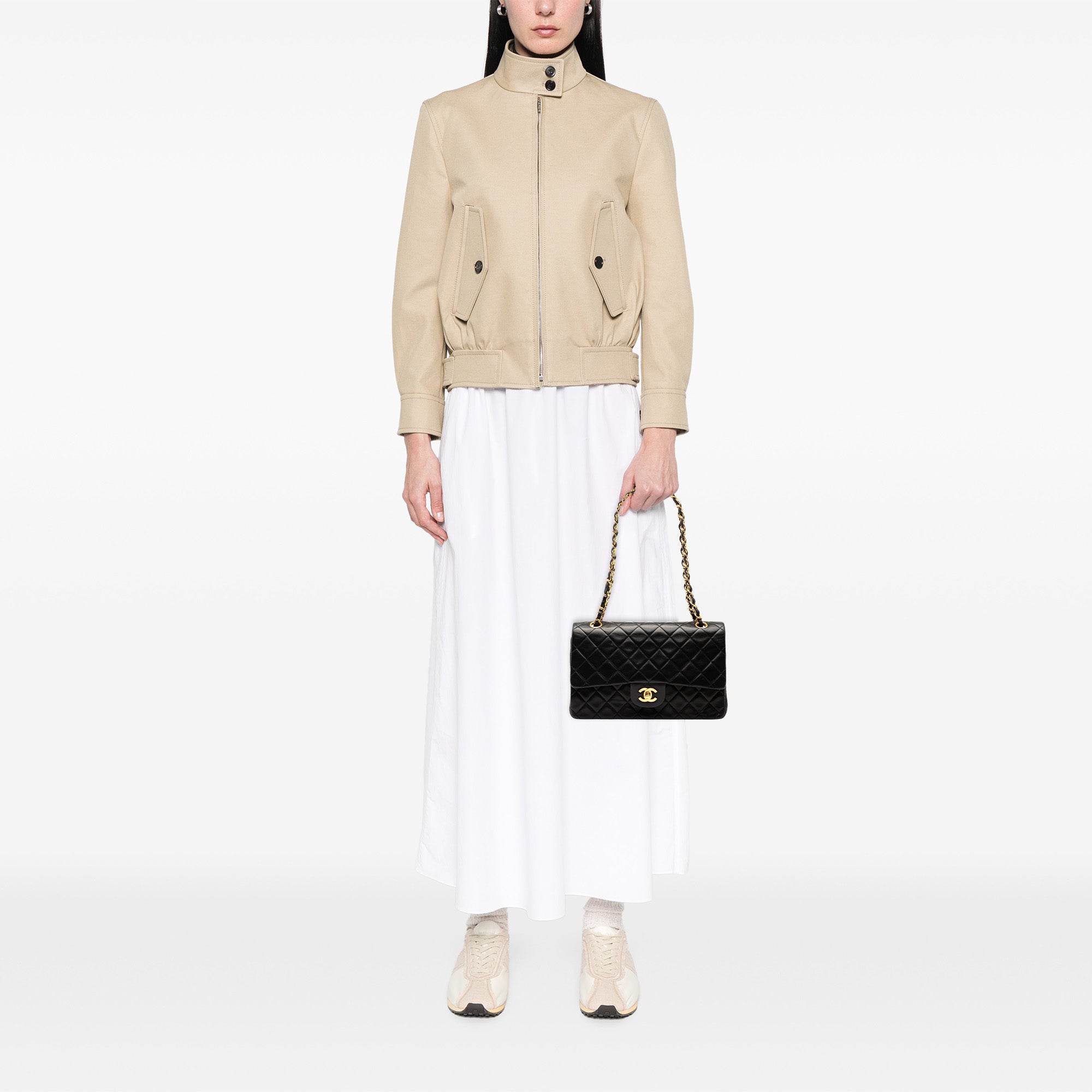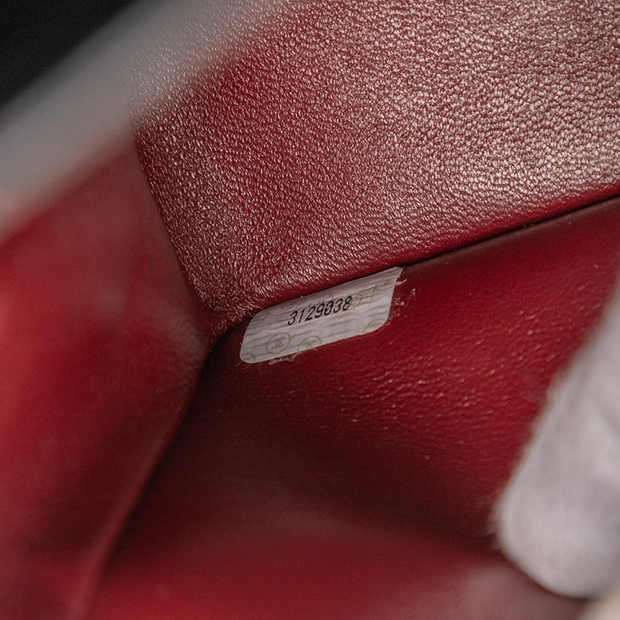 This shoulder bag features a quilted lambskin body, leather woven chain straps, double front flaps with interlocking Cs and a twist lock closure, an exterior back slip pocket, and interior zip and slip pockets. Retail Price: 10200.00