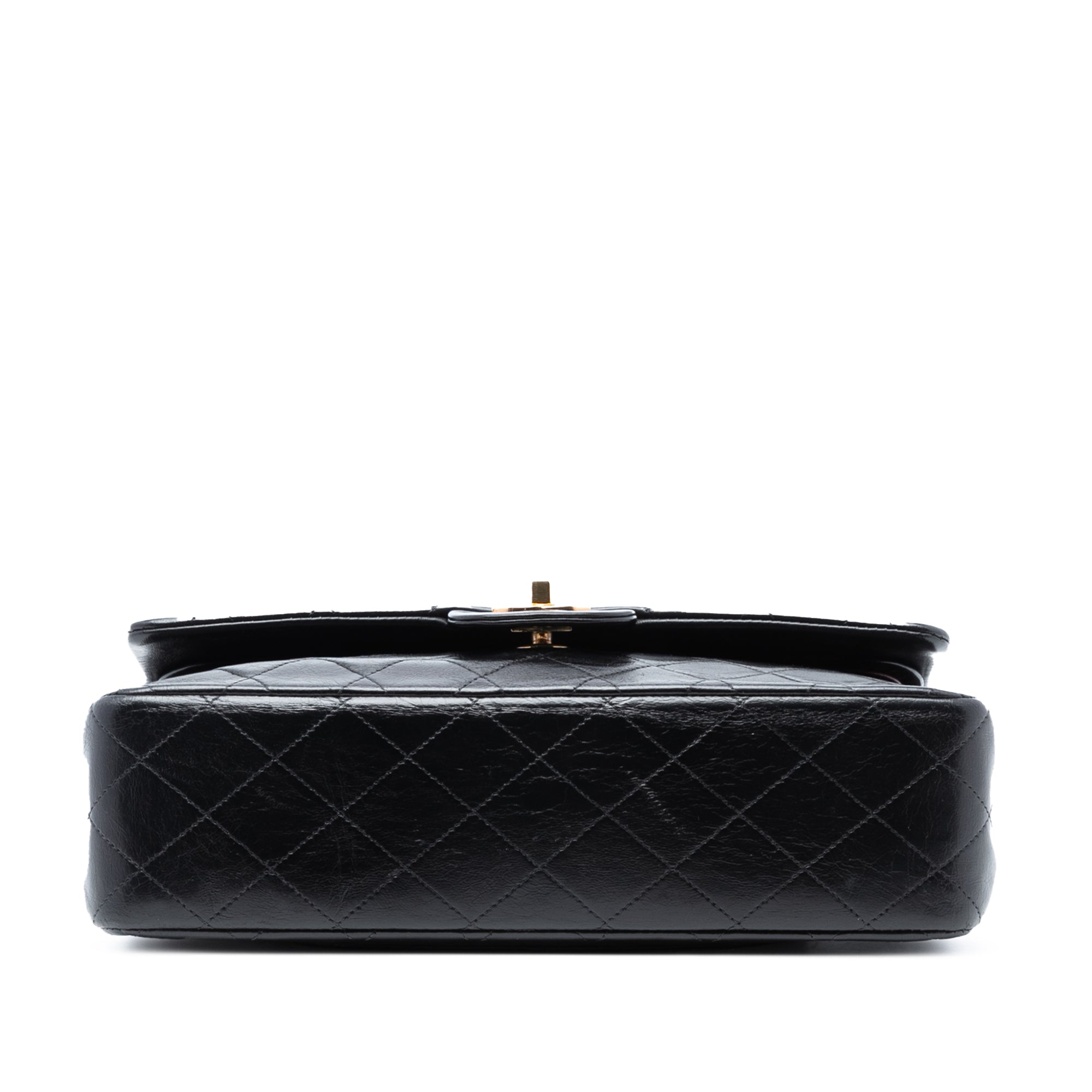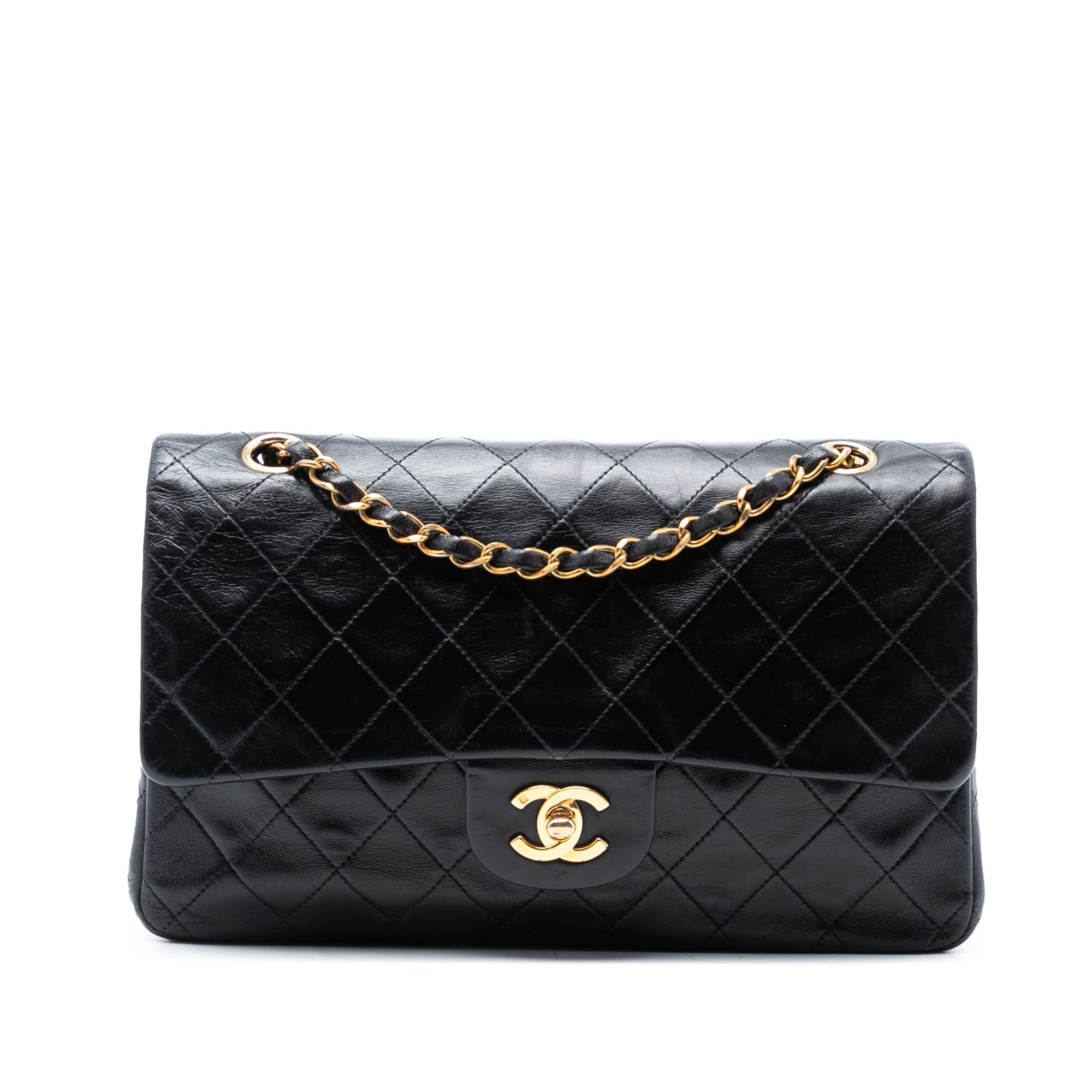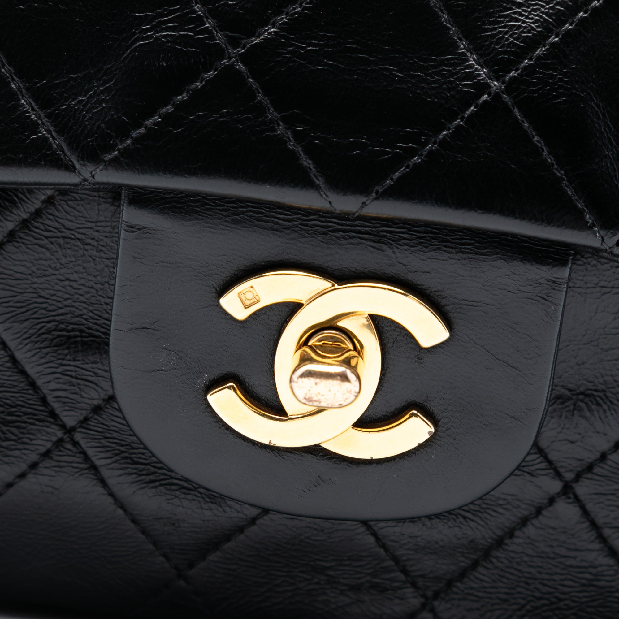 This shoulder bag features a quilted lambskin body, gold-tone leather woven chain link straps, double front flaps with interlocking Cs and a twist lock closure, and an exterior back slip pocket, interior slip pockets. Retail Price: 10200.00