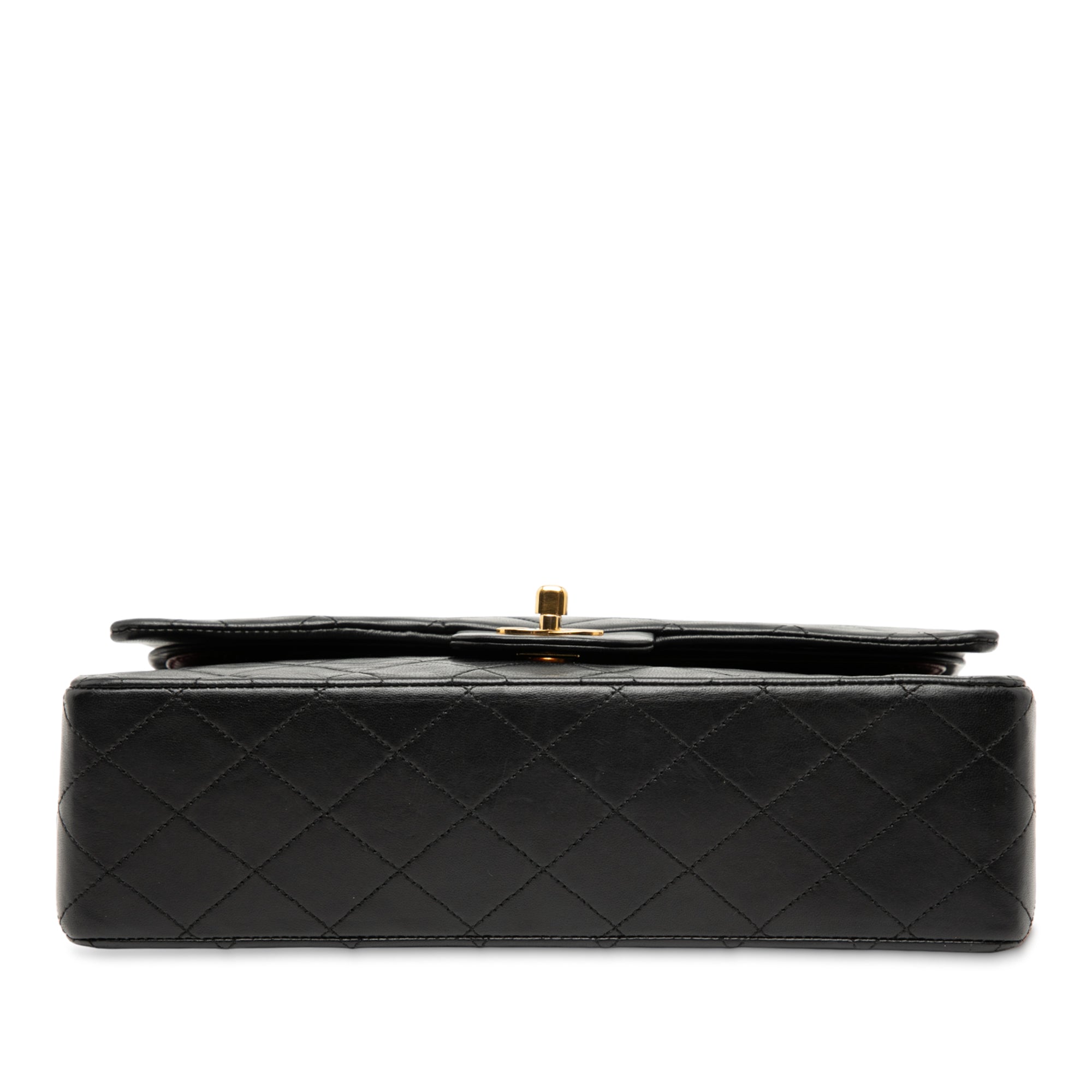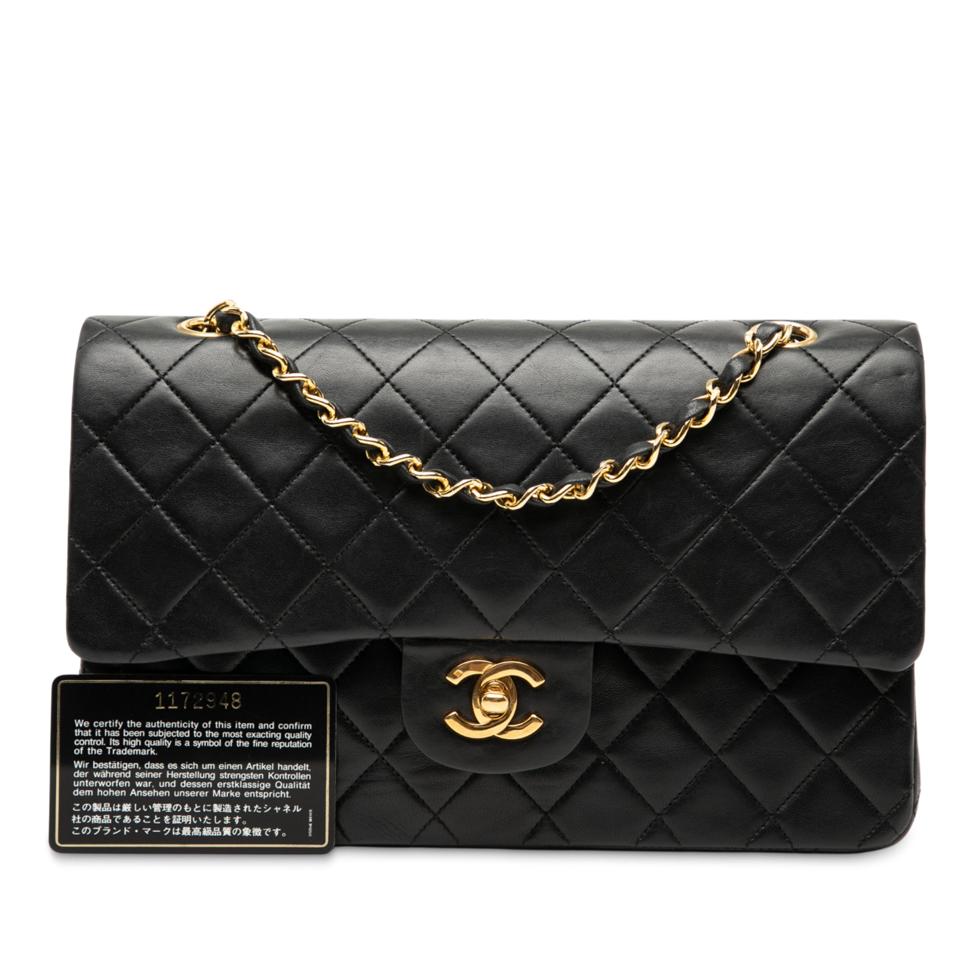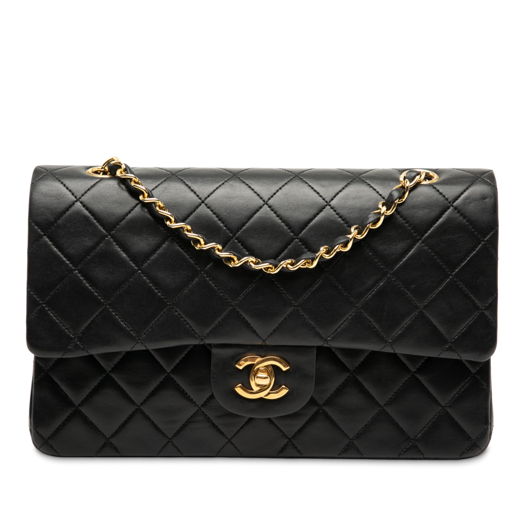 This shoulder bag features a quilted lambskin body, leather woven chain straps, double front flaps with interlocking Cs and a twist lock closure, an exterior back slip pocket, and interior zip and slip pockets. Inclusion: authenticity card. Retail Price: 10200.00