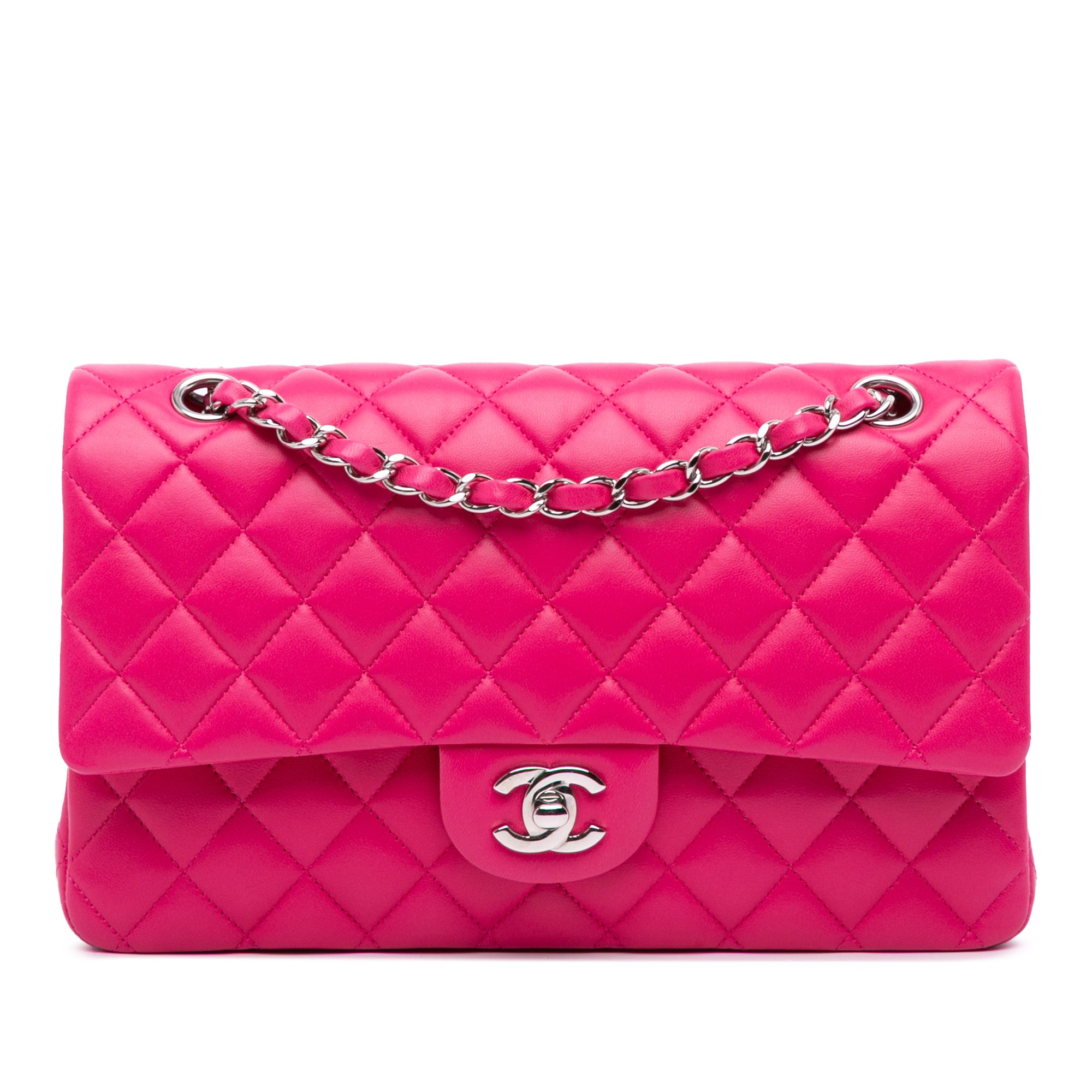 This shoulder bag features a quilted lambskin body, leather woven chain link straps, double front flaps with interlocking Cs and a twist lock closure, an exterior back slip pocket, and interior zip and slip pockets. Retail Price: 10450.00
