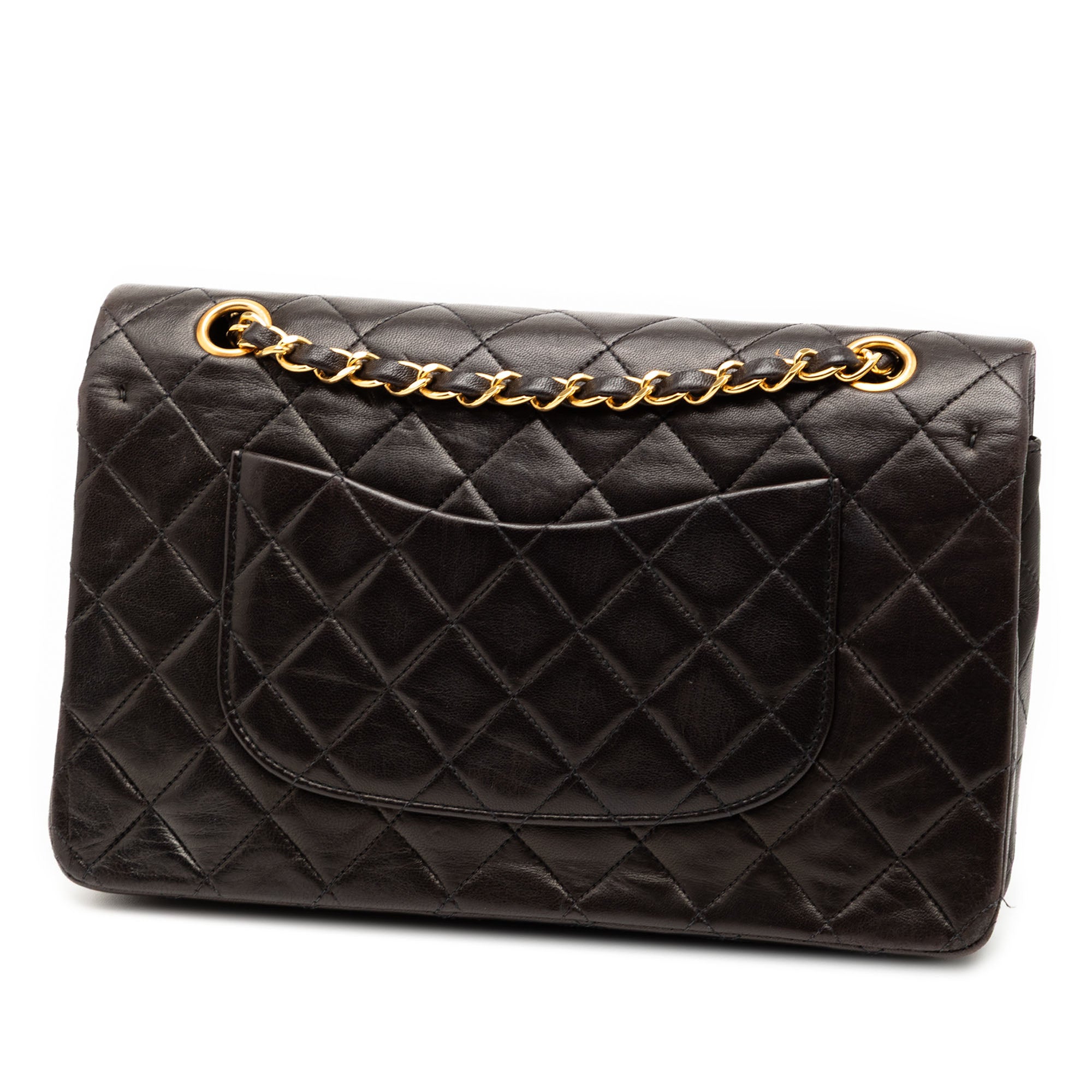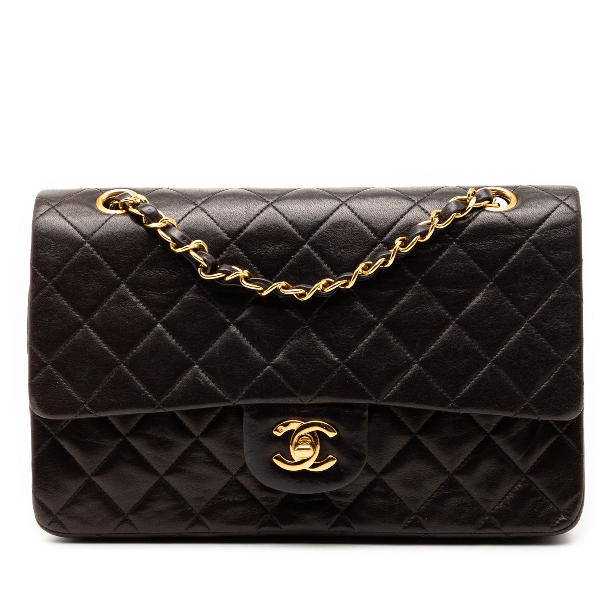 This shoulder bag features a quilted lambskin body, an exterior back slip pocket, leather woven chain straps, double front flaps with interlocking Cs and a twist lock closure, and interior zip and slip pockets. Inclusion: authenticity card. Retail Price: 10200.00