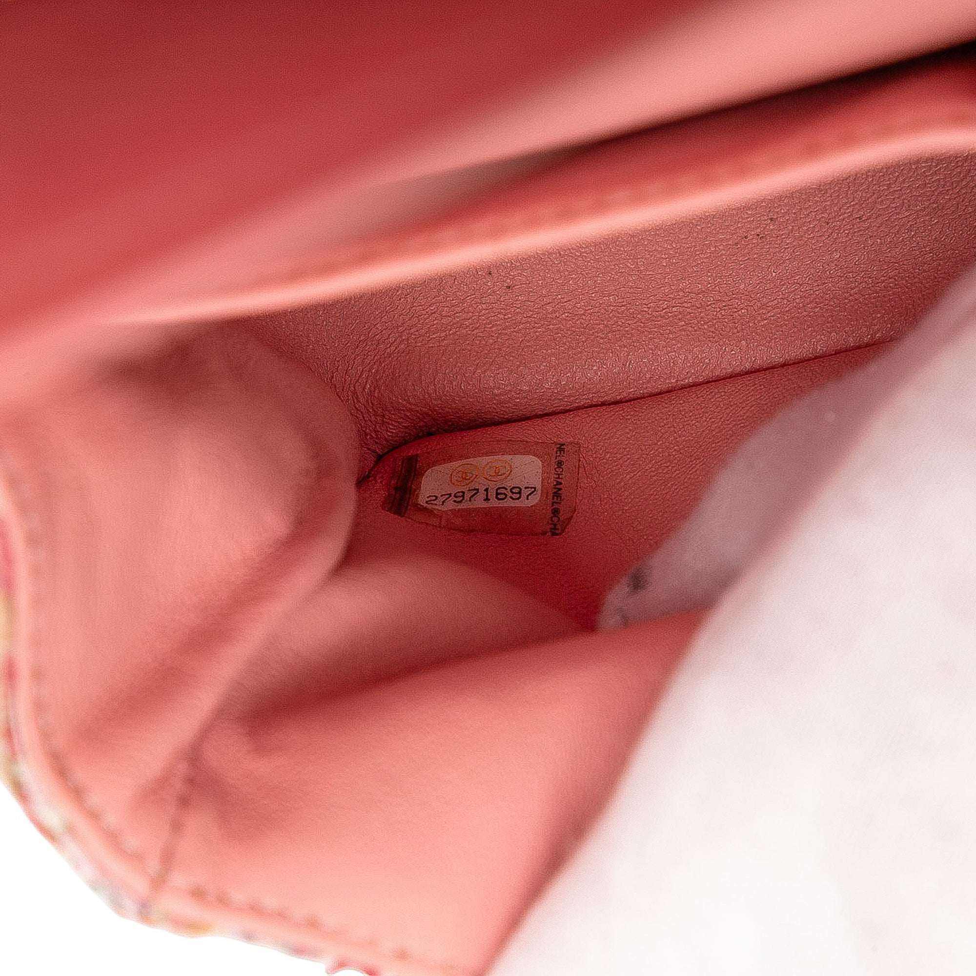 This flap bag features a tweed body, a leather-woven chain strap, a front flap with CC turn lock closure, an exterior back slip pocket, and interior zip and slip pockets. Retail Price: 7000.00