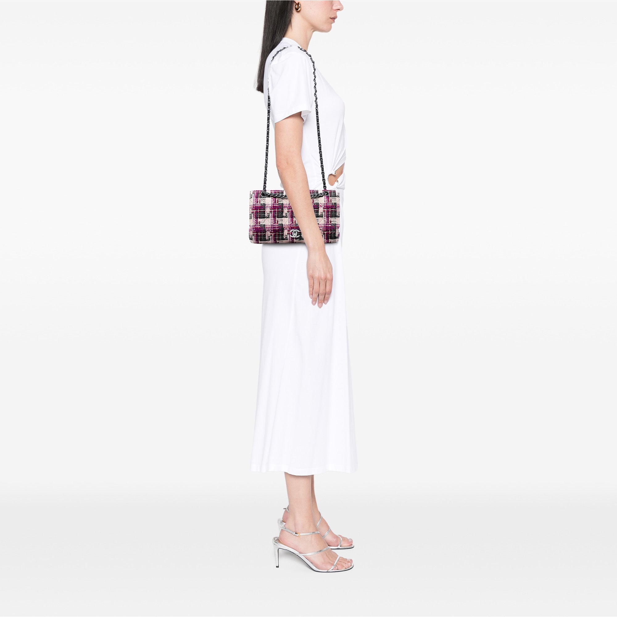 This flap bag features a quilted tweed body, leather woven chain link straps, double front flaps with interlocking Cs and a twist lock closure, an exterior back slip pocket, and interior zip and slip pockets. Inclusion: Dust bag, authenticity card. Retail Price: 3790.00