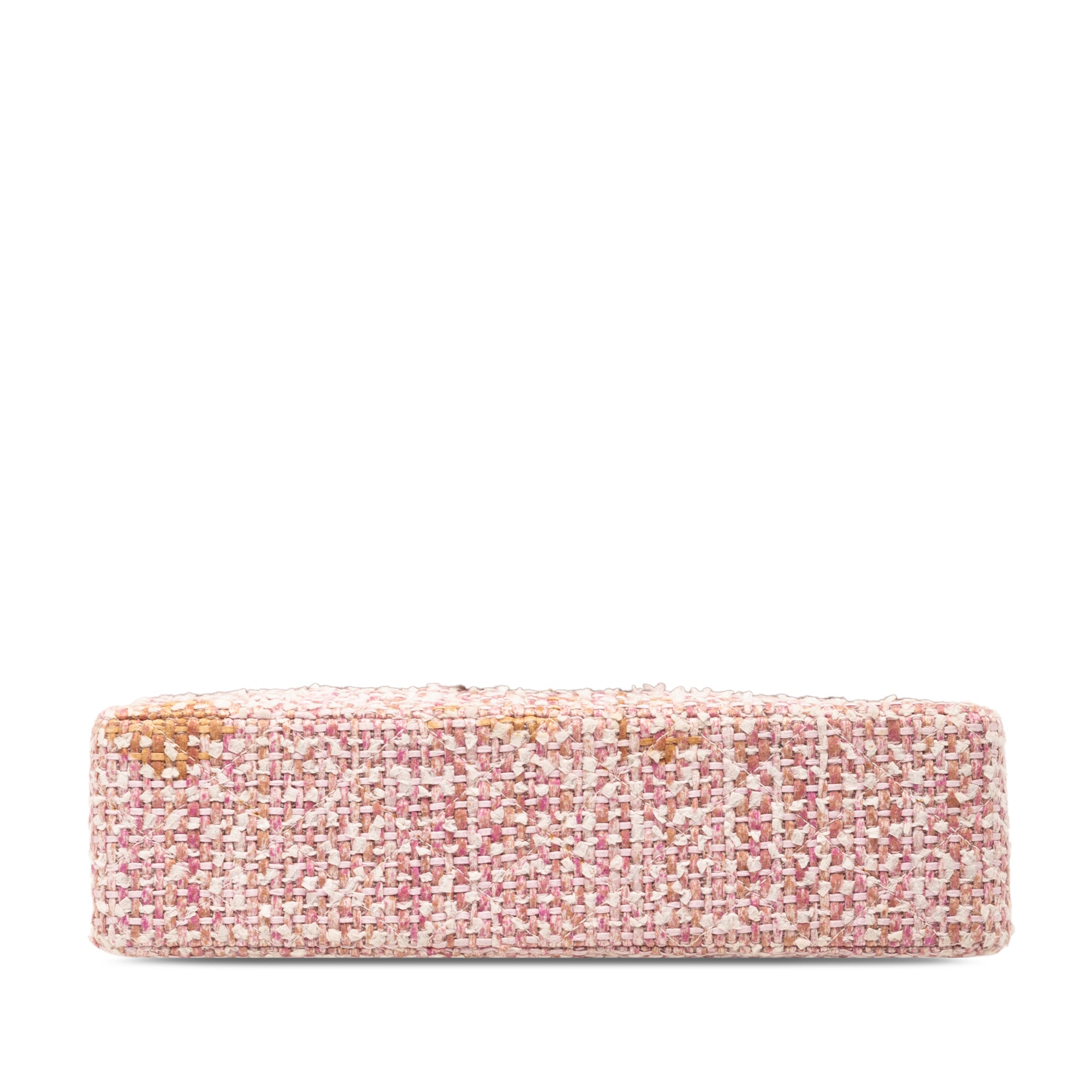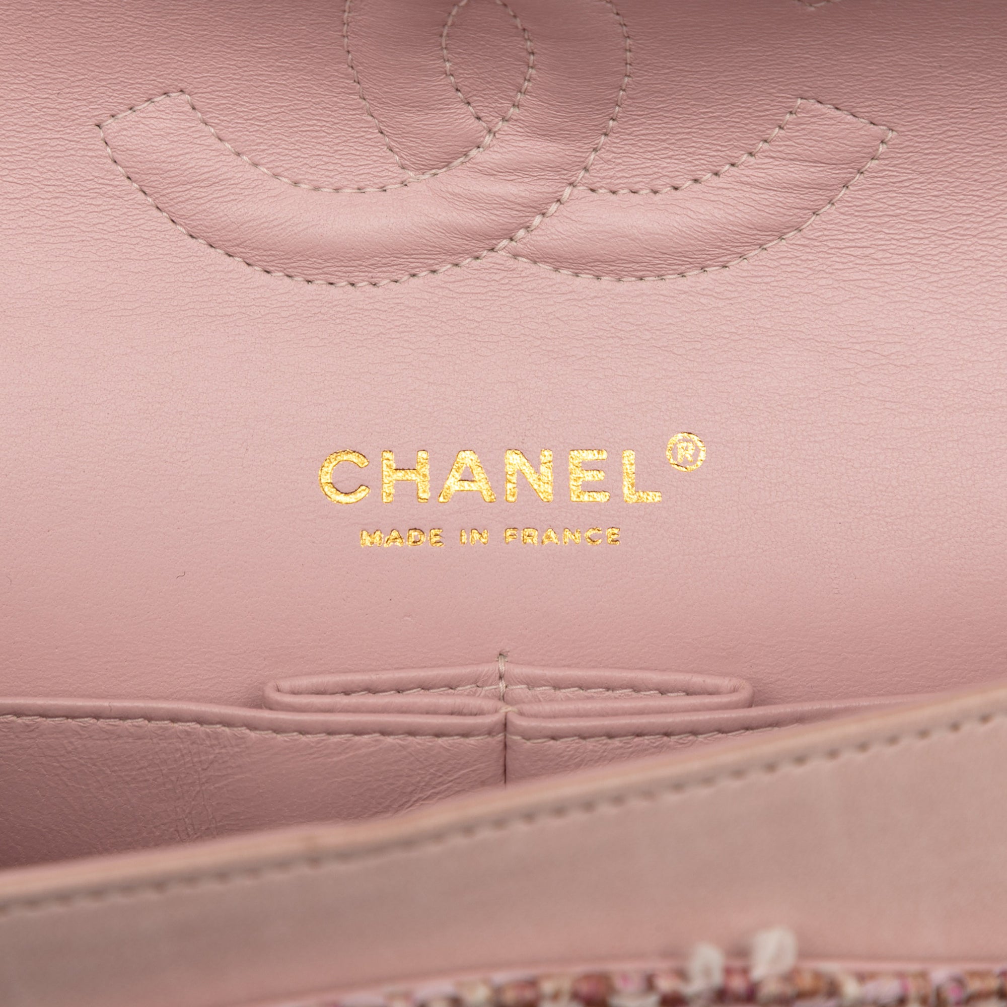 This shoulder bag features a quilted tweed body, leather woven chain-link shoulder straps, front flaps with interlocking Cs and a twist-lock closure, an exterior back slip pocket, and interior slip pockets. Retail Price: 8465.00