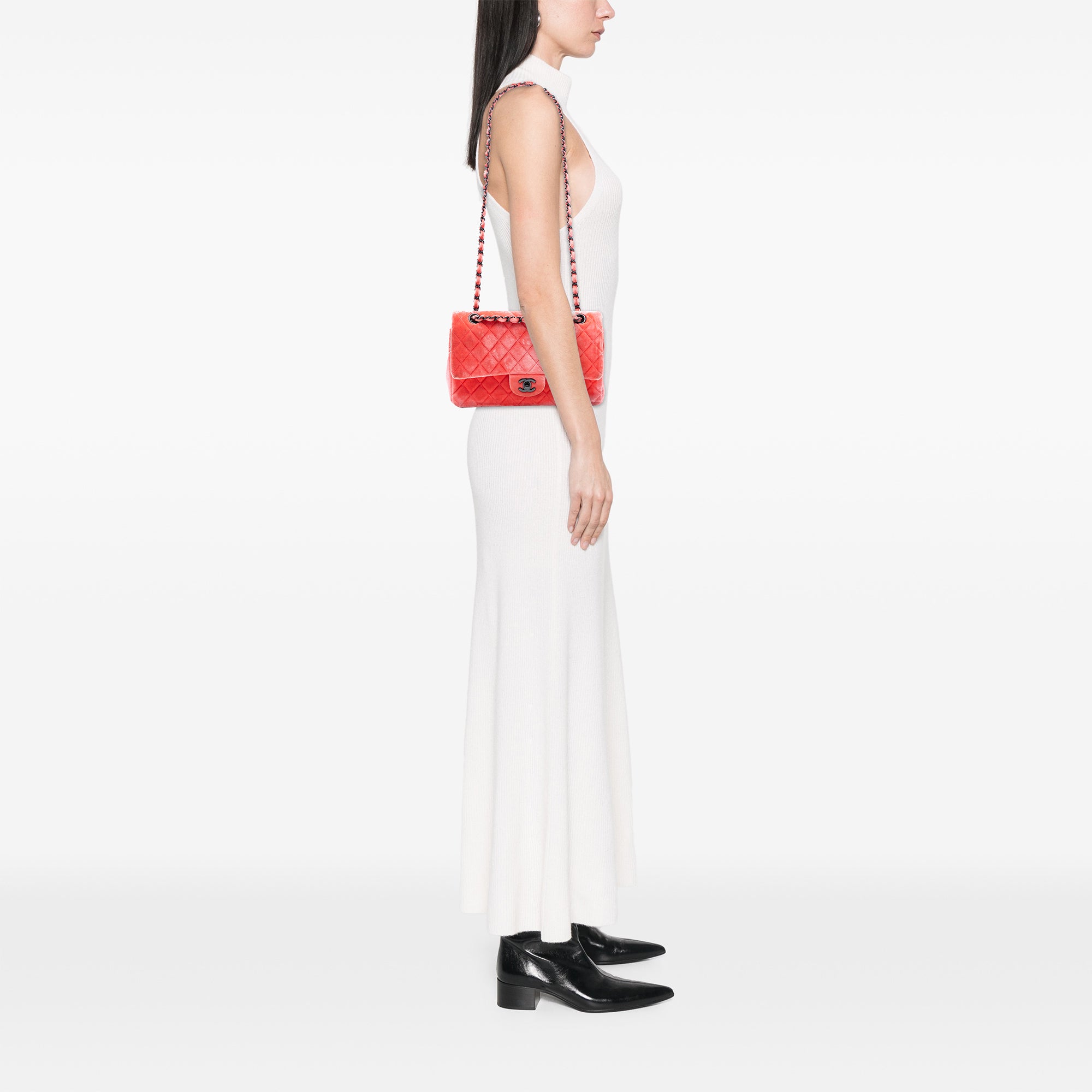 This shoulder bag features a quilted velvet body, velvet woven chain straps, double front flaps with interlocking Cs and a twist lock closure, an exterior back slip pocket, and interior zip and slip pockets. Retail Price: 9600.00
