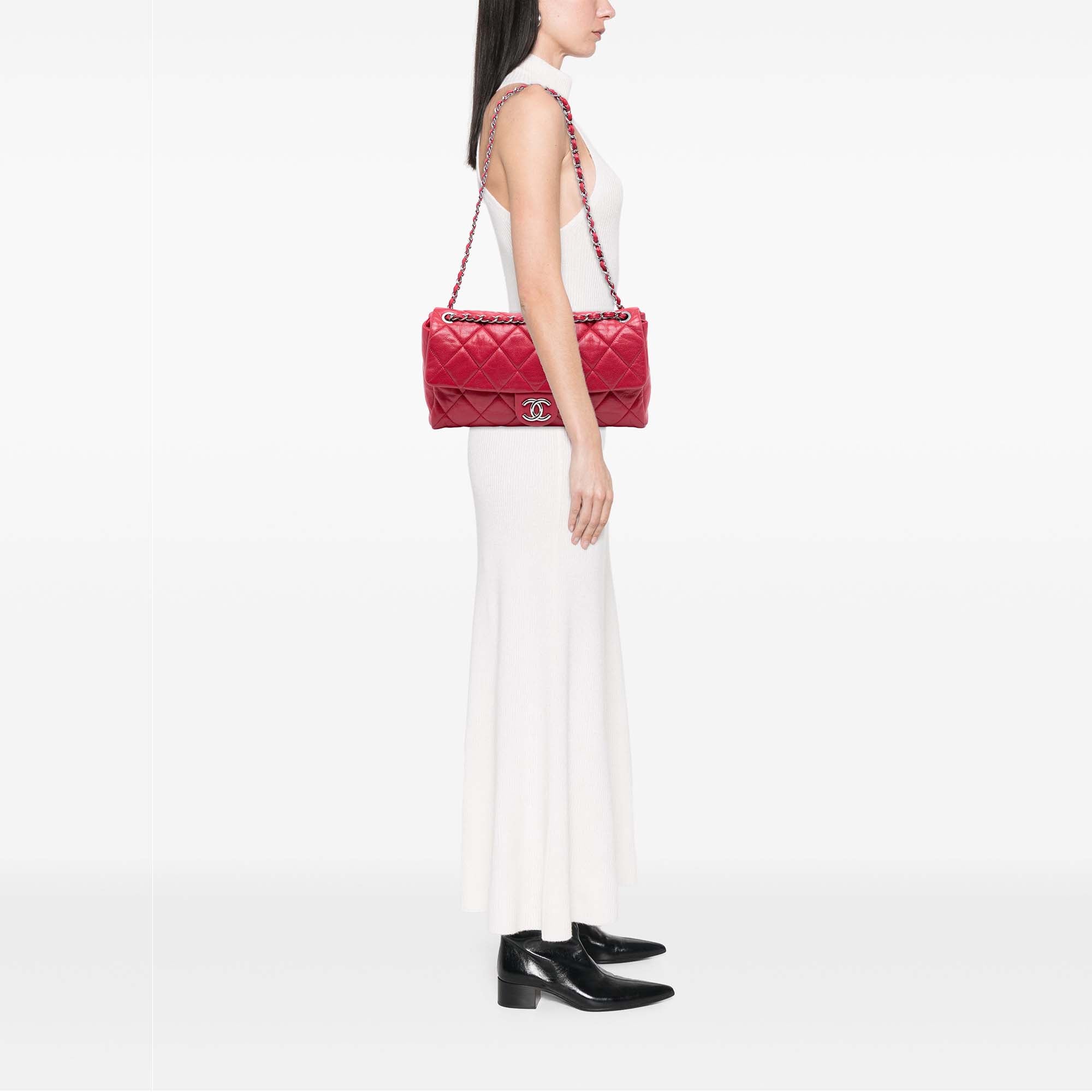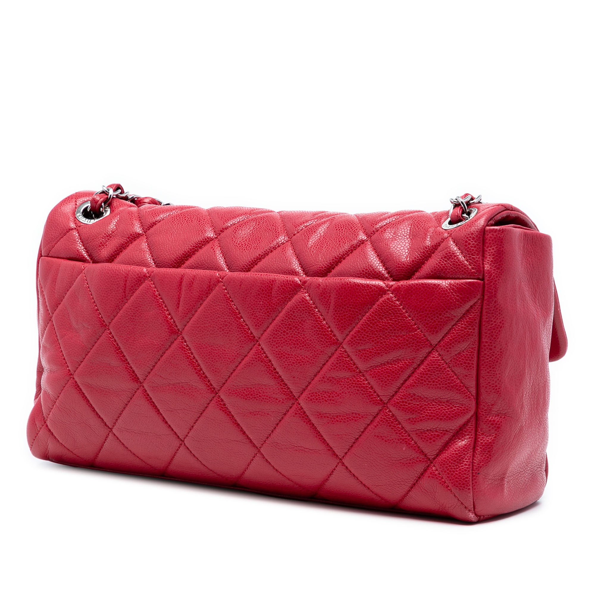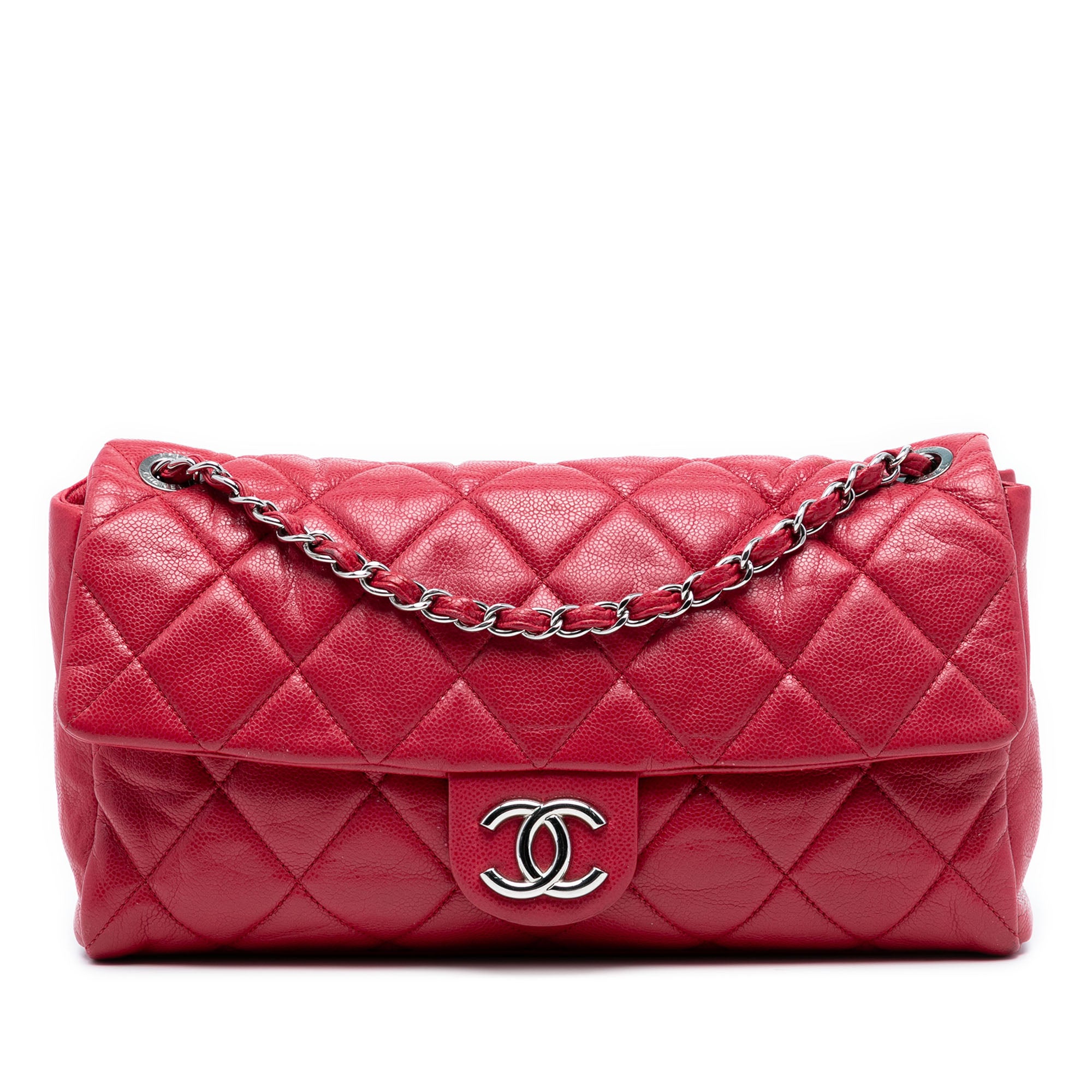 The Nature Flap features a quilted caviar leather body, leather woven chain link straps, a front flap with a CC magnetic closure, and interior zip and slip pockets. Retail Price: 3830.00