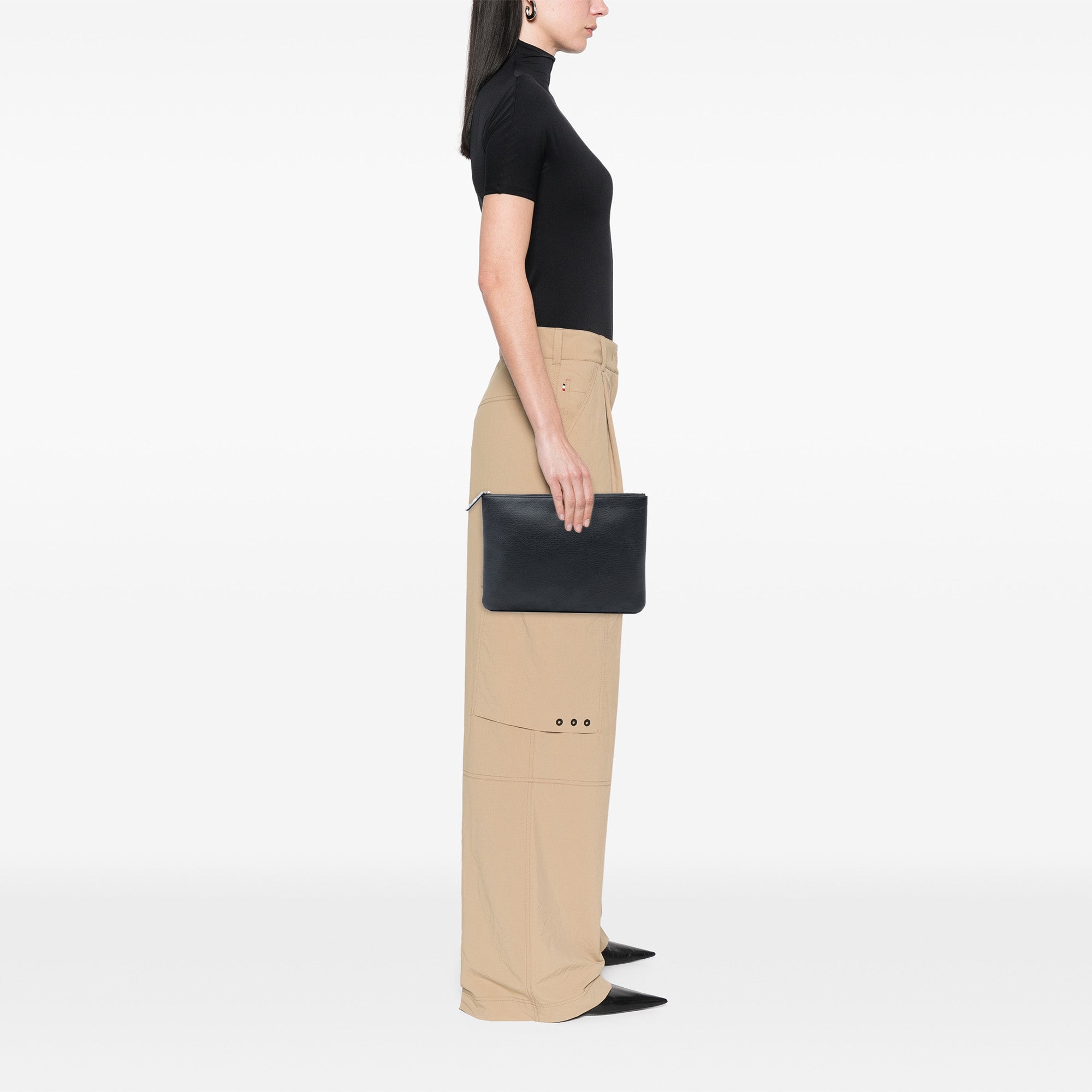 This clutch features a goatskin leather body, a top zip closure, and an interior zip pocket. Retail Price: 1200.00