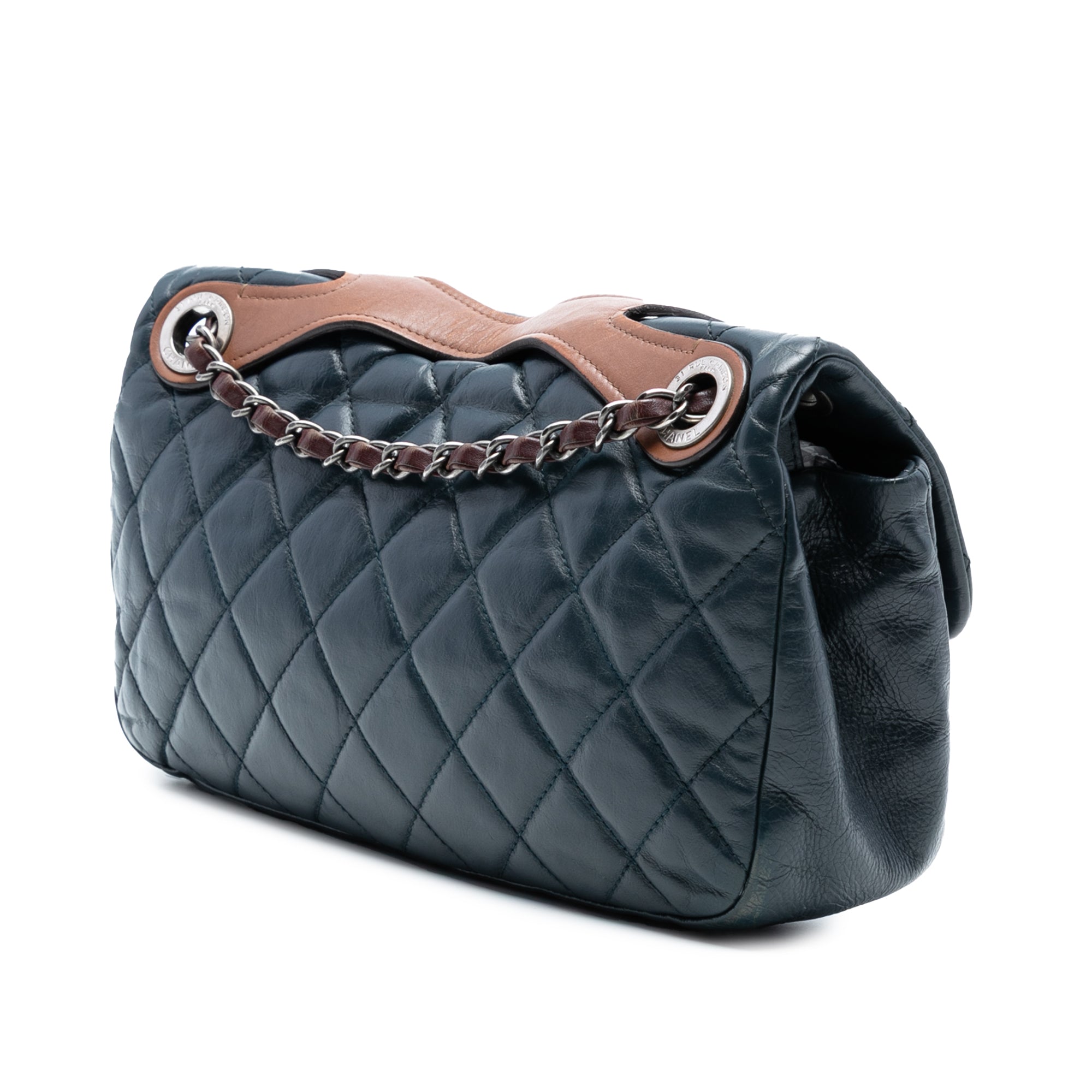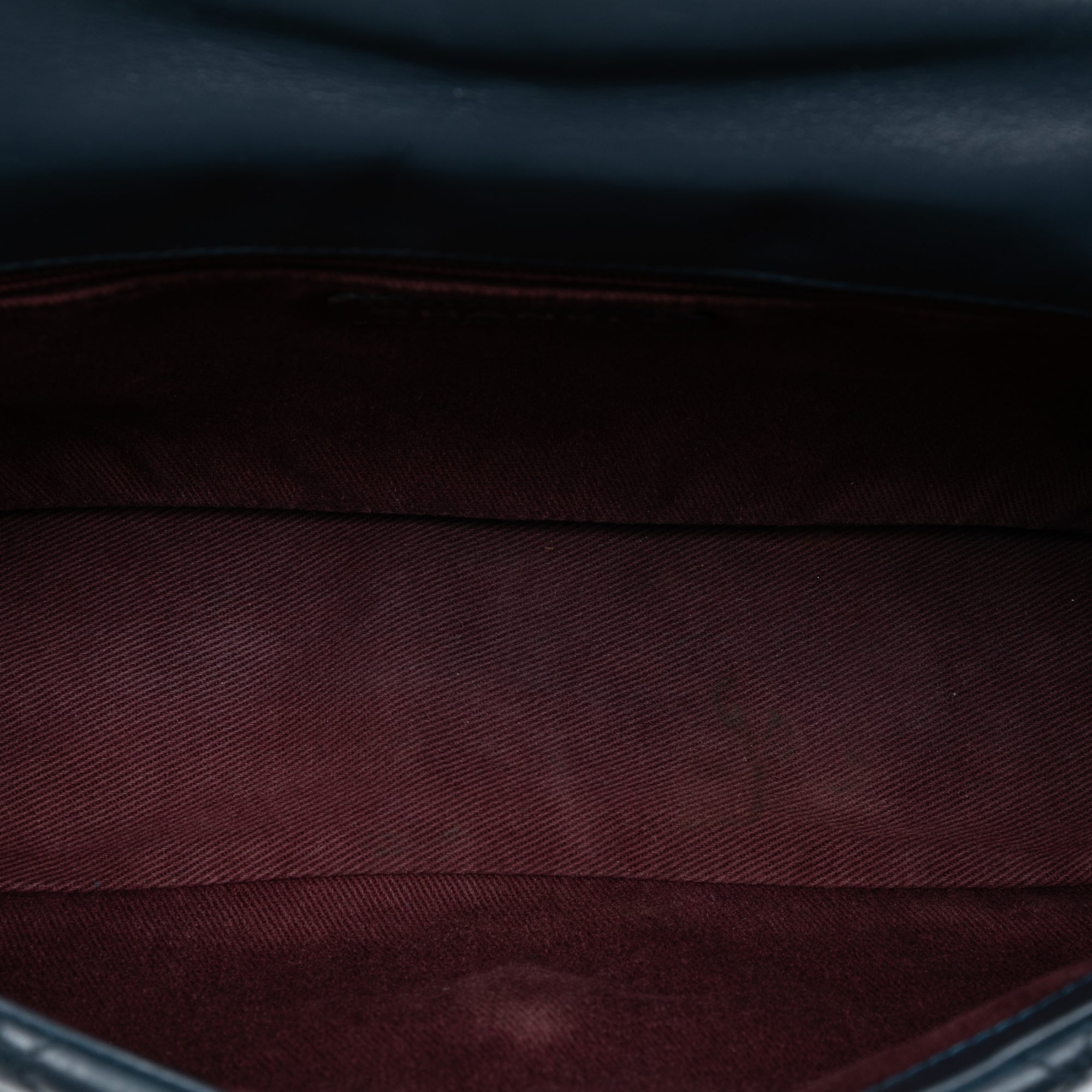 This satchel features a quilted lambskin leather body, a flat leather top handle, a woven chain strap, a front flap with CC turn lock closure, and an interior zip pocket. Retail Price: 3150.00