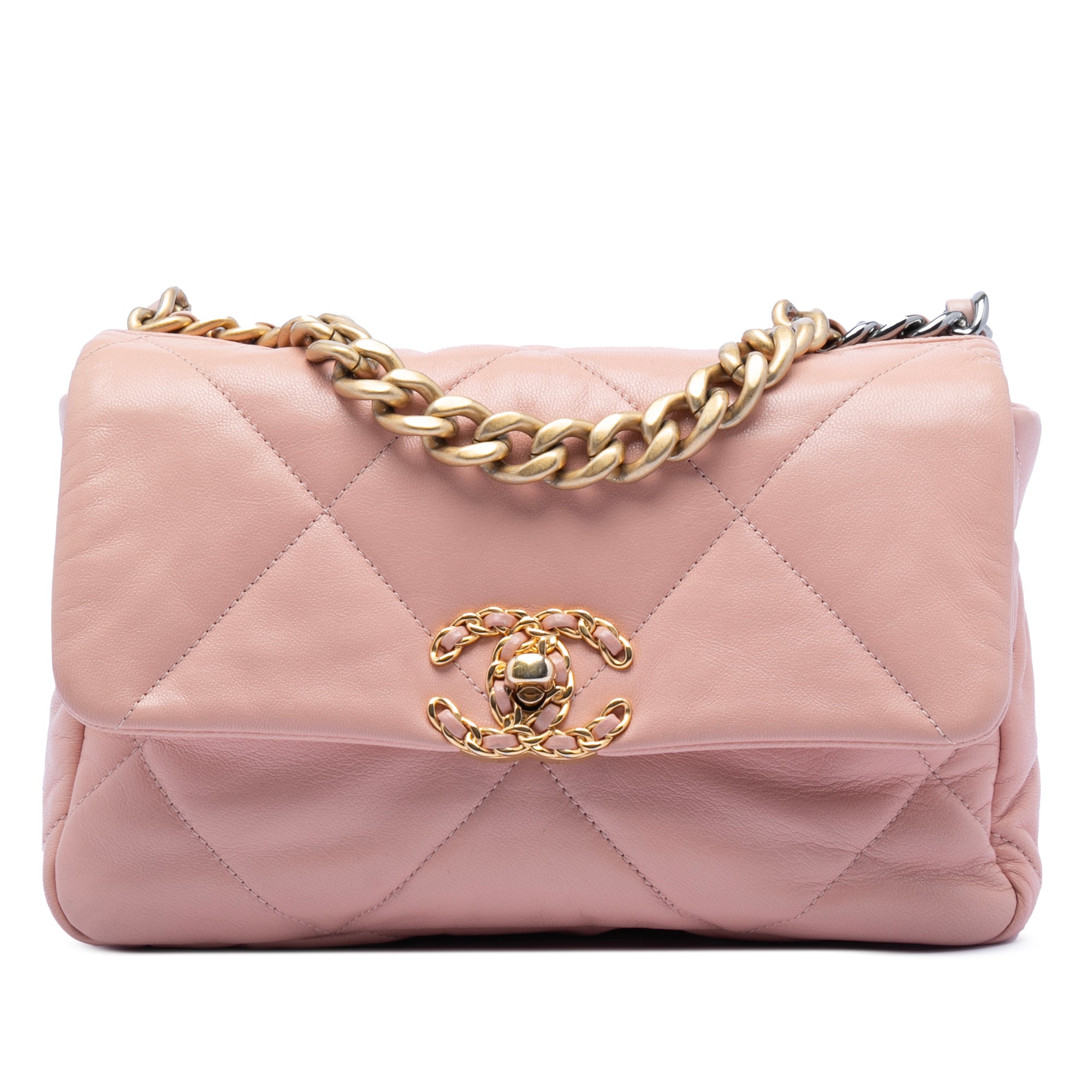 The Medium 19 Flap Bag features a quilted lambskin leather body, a gold-tone chain handle, a woven leather chain shoulder strap, a front flap with twist-lock closure, an exterior back slip pocket, and an interior zip pocket. Inclusion: authenticity card. Retail Price: 3825.00