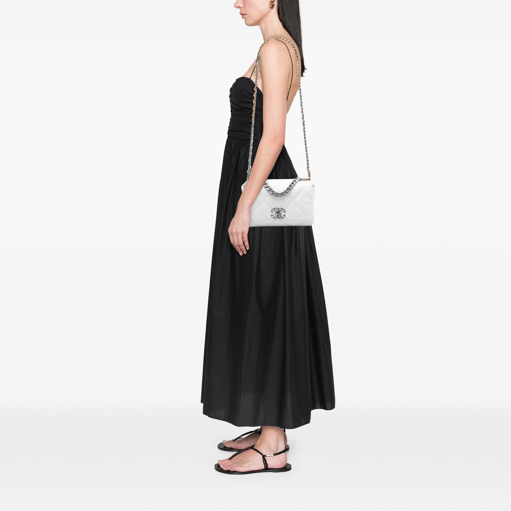 The Medium 19 Flap bag features a quilted lambskin leather body, a chain handle, a leather-woven in chain shoulder strap, a flap with a CC twist lock closure, an exterior slip pocket, and an interior zip pocket. Retail Price: 6600.00