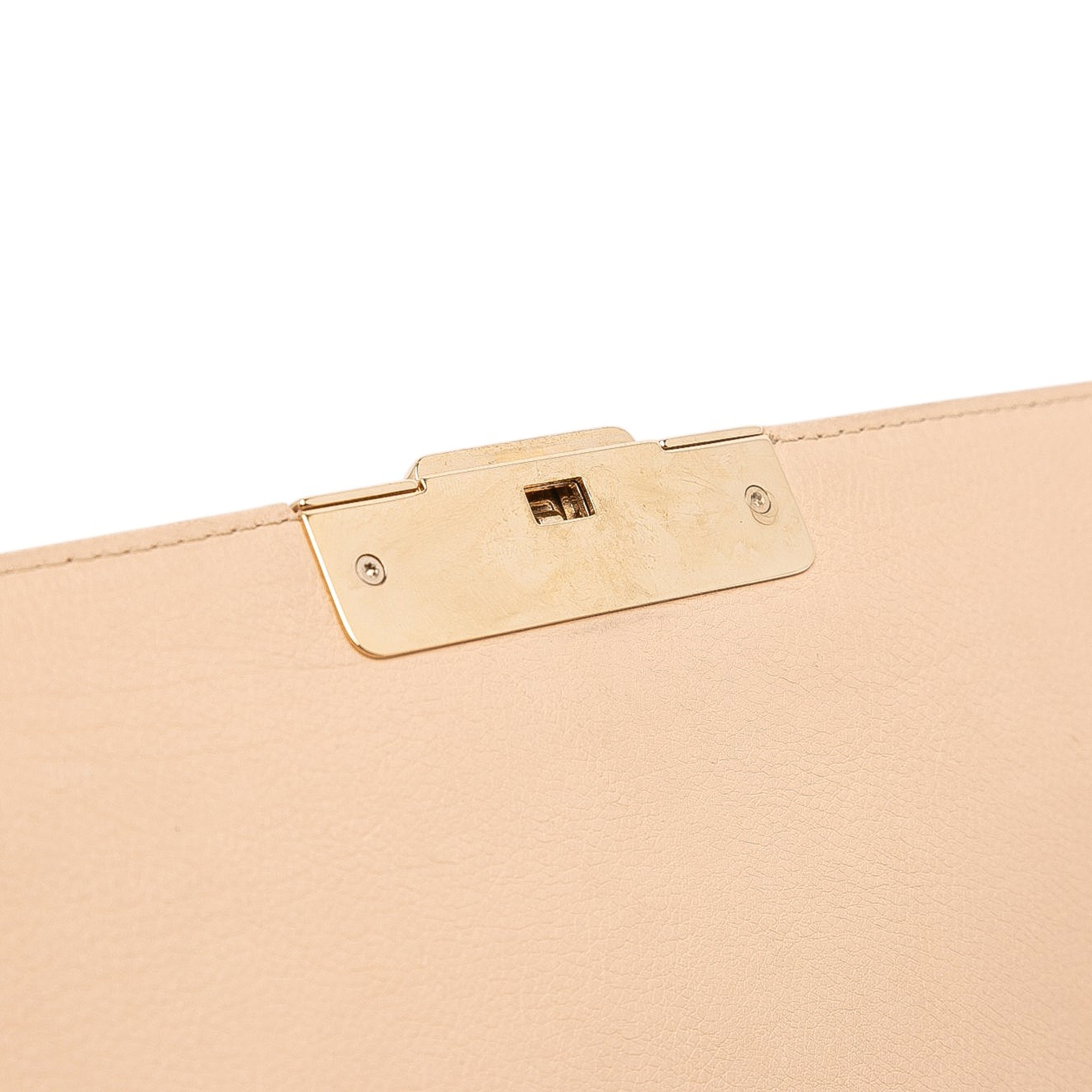 This satchel features a leather body, a flat leather handle, a chain link shoulder strap with leather guard, a front flap with push lock closure, and an interior zip pocket. Retail Price: 3600.00