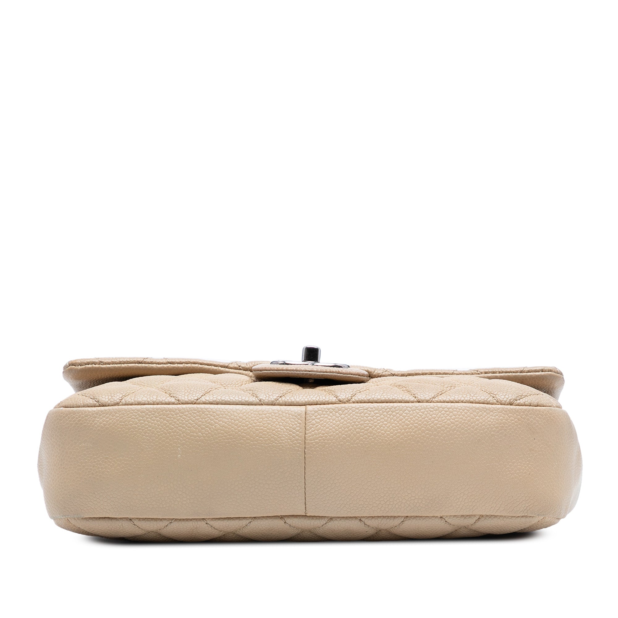 The Easy Flap features a quilted caviar leather body, a leather woven chain shoulder strap with leather shoulder guard, a front flap with double Cs and twist lock closure, a top zip closure, and interior zip and slip pockets. Retail Price: 4930.00