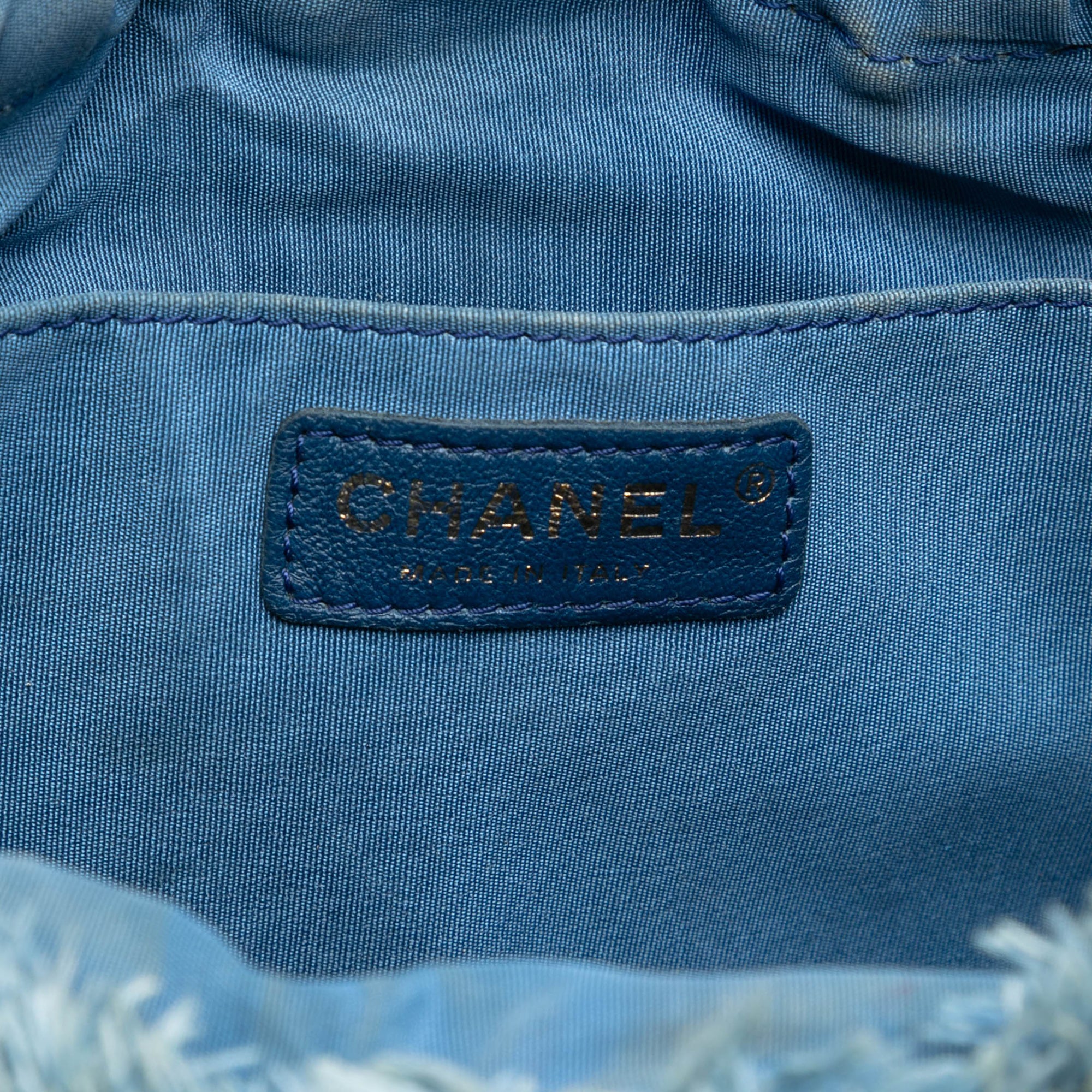 This bucket bag features a quilted denim body, a leather woven chain shoulder strap, a drawstring chain link with CC embellishment closure, and an interior slip pocket. Retail Price: 4000.00