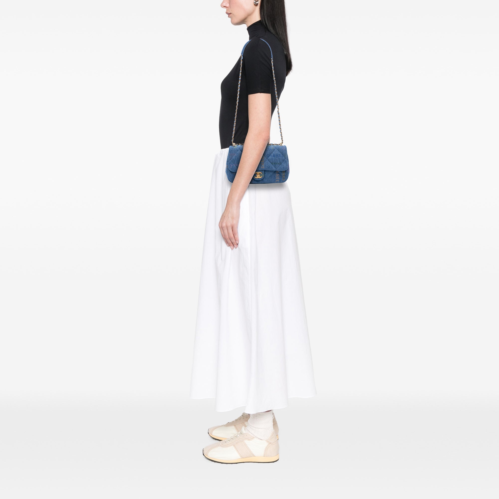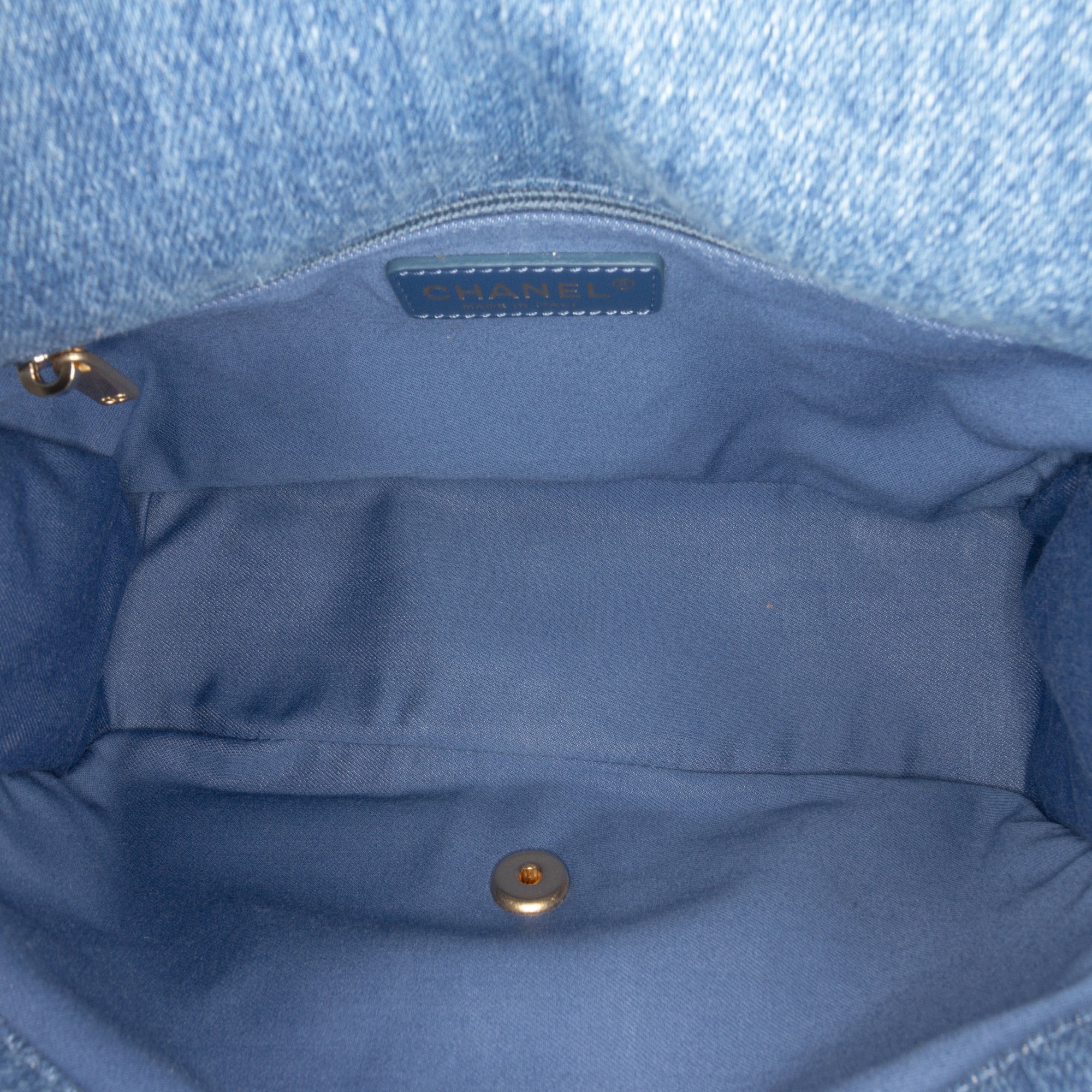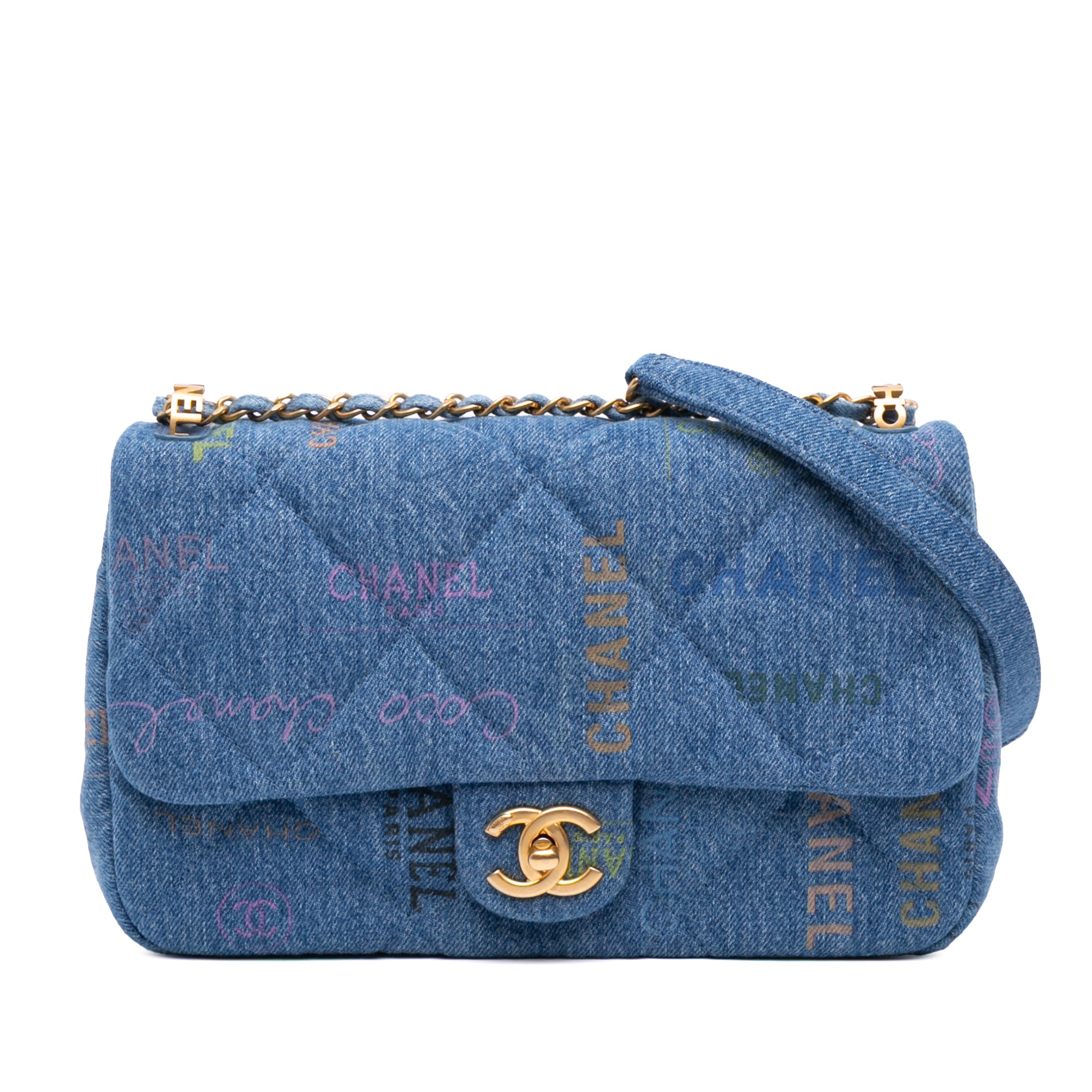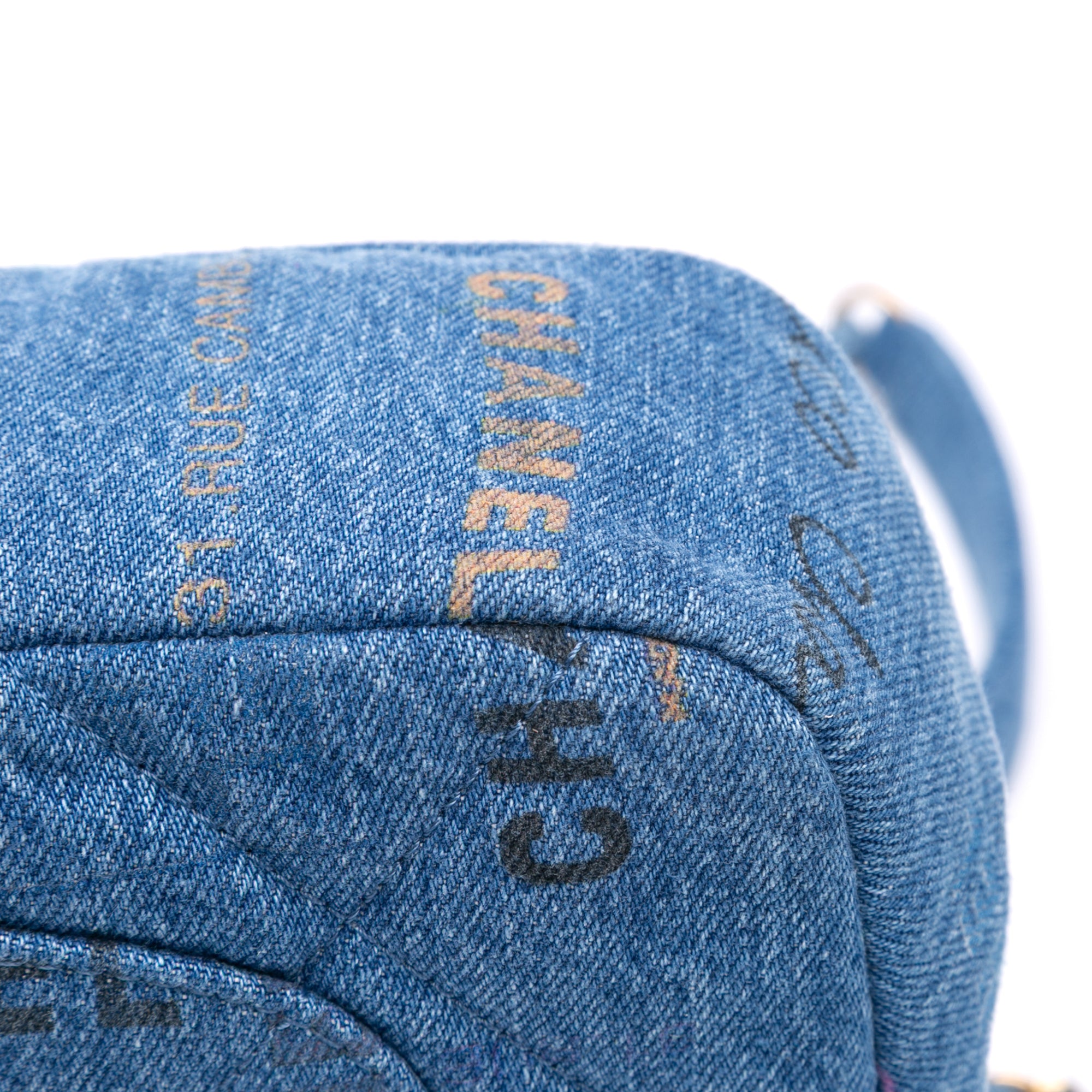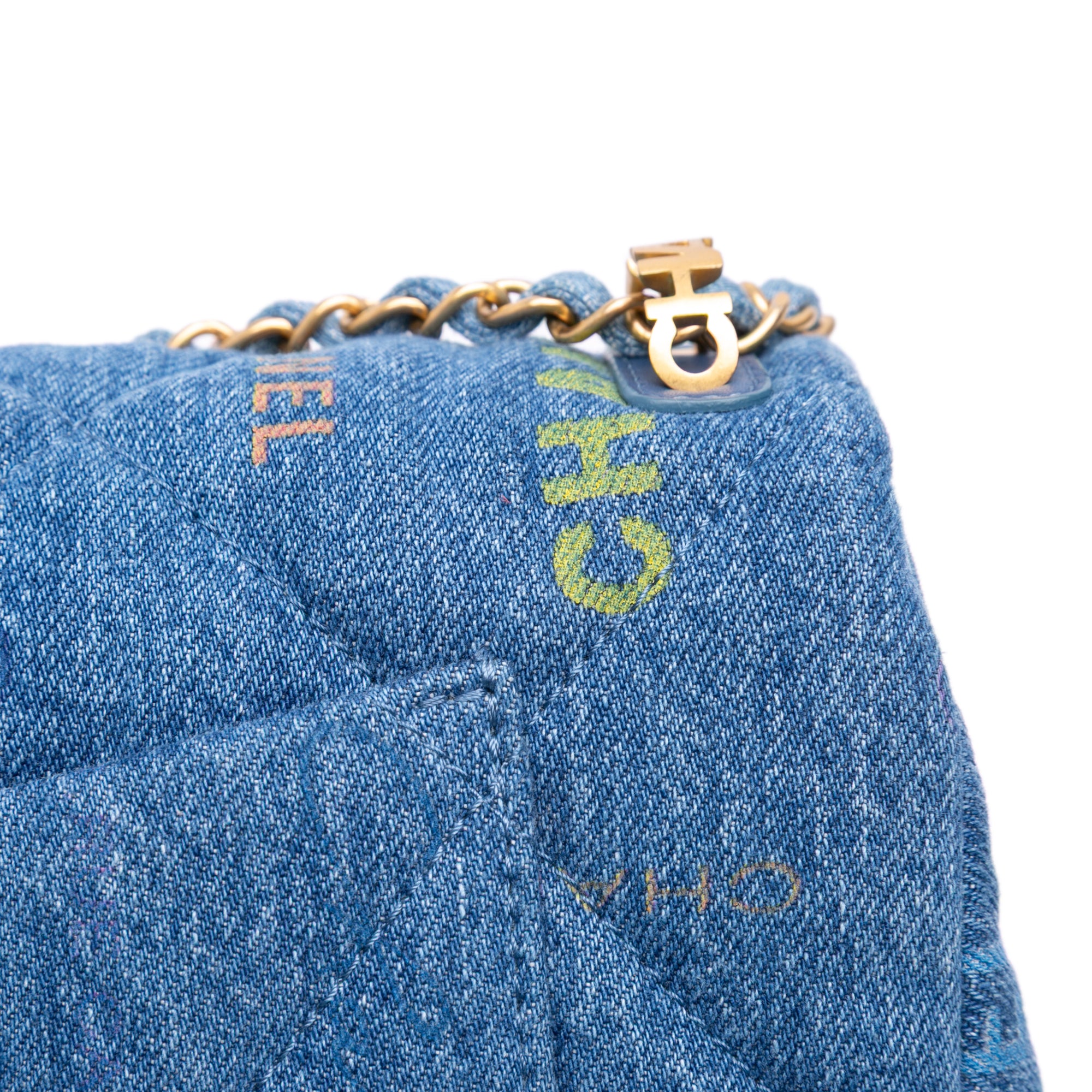 This crossbody bag features a quilted denim body, denim woven chain strap with denim shoulder guard, a front flap with twist lock closure, an exterior back slip pocket, and an interior zip pocket. Inclusion: box. Retail Price: 6000.00