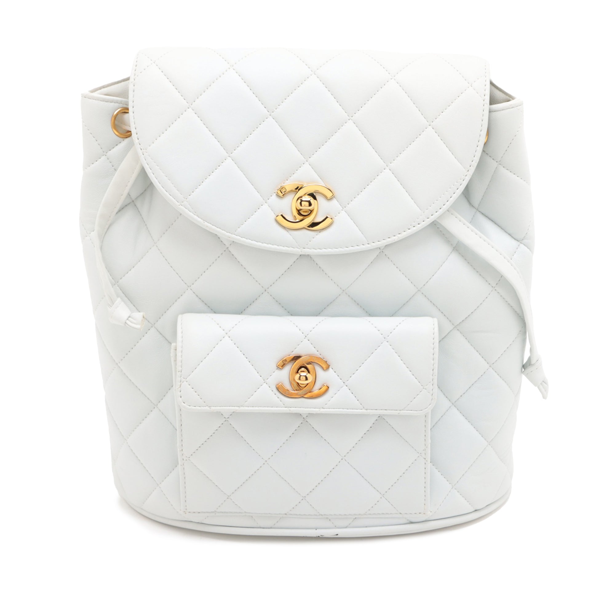 This backpack features a lambskin leather body, adjustable leather woven chain link back straps, a top flap with CC turnlock and drawstring closure, and an exterior front flap pocket. Inclusion: Dust bag, box, authenticity card. Retail Price: 5950.00
